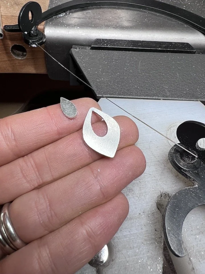 I have just cut a teardrop out of the larger petal shape. I will then file the edges, hammer the top, and then slightly dome its surface. This will become the pendant for a new necklace design.