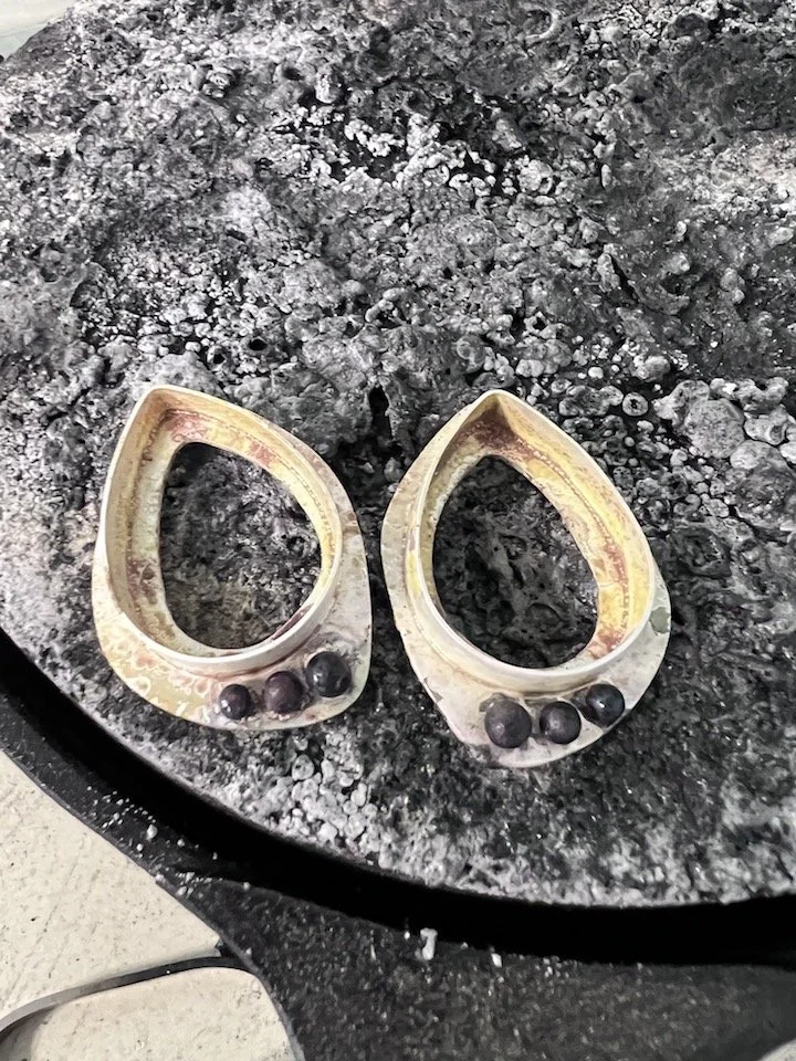 Here I have just soldered brass granules onto these silver earrings. The brass gets covered with a thin layer of oxidation during the soldering process. I will then clean both the silver and brass in an acidic solution and manually polish the surface to remove the oxidation.