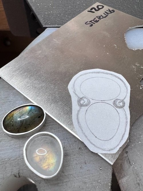 In this photo I have sketched an outline to guide me while cutting the backplate for these bezels. I often draw patterns on sticky paper which I adhere to a sheet of sterling silver. I then use my jeweler’s saw to cut the outline.