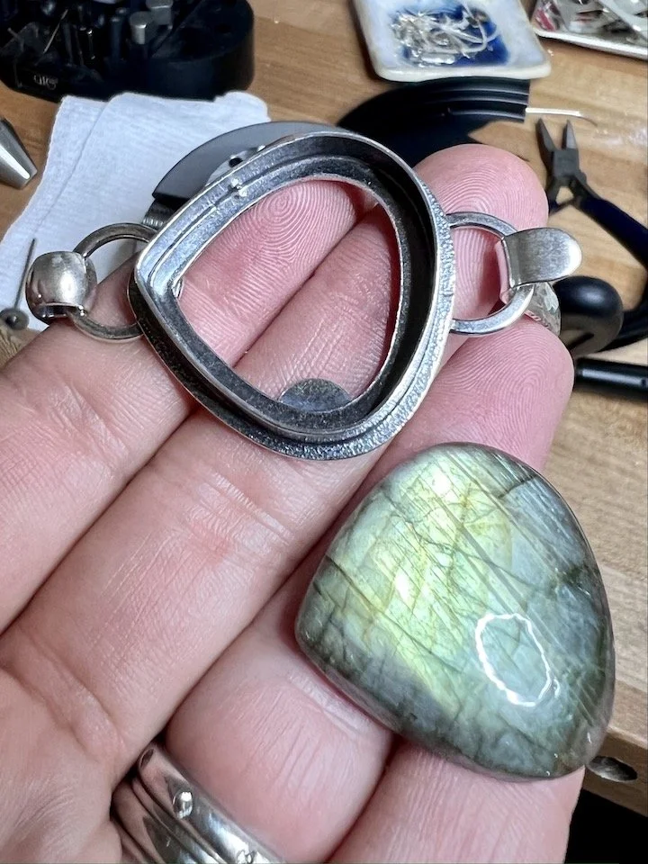 Here I am getting ready to set this labradorite cabochon into a tension cuff bracelet. At this point all of the metalwork has been completed other than shaping the bezel over the stone.