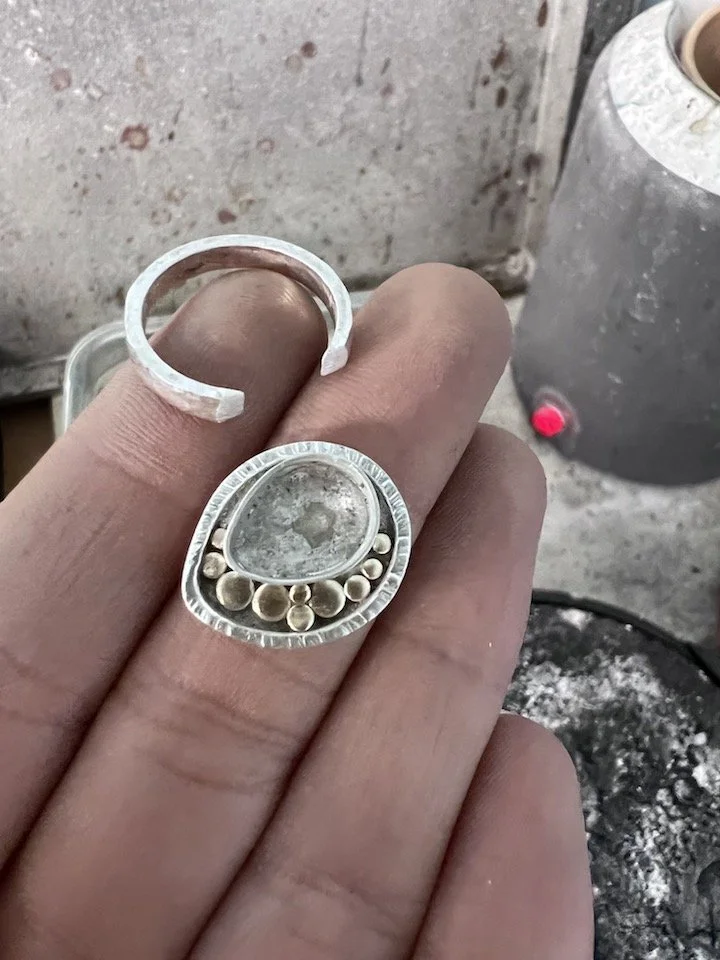 The silver and brass setting for a labradorite ring is all finished up. It is ready to be soldered to the band. I file the part of the band flat along the edge that will come in contact with the setting. This increases the amount of surface area between the setting and the band which creates a stronger bond.