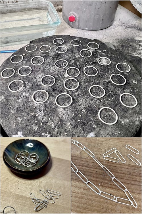 In these photos I’m working on a handmade chain for this month’s dendritic opal and chalcedony necklace. First I form wire into circles and solder the circles closed. Then I shape the circles into elongated ovals using pliers. The final step is soldering these elongated ovals together to form a long chain.