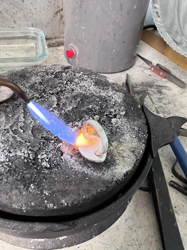Here I am soldering the band to the setting. I move the torch constantly around the whole ring so that it heats evenly. When the ring is hot enough for the solder to flow, I concentrate the heat on the solder join.