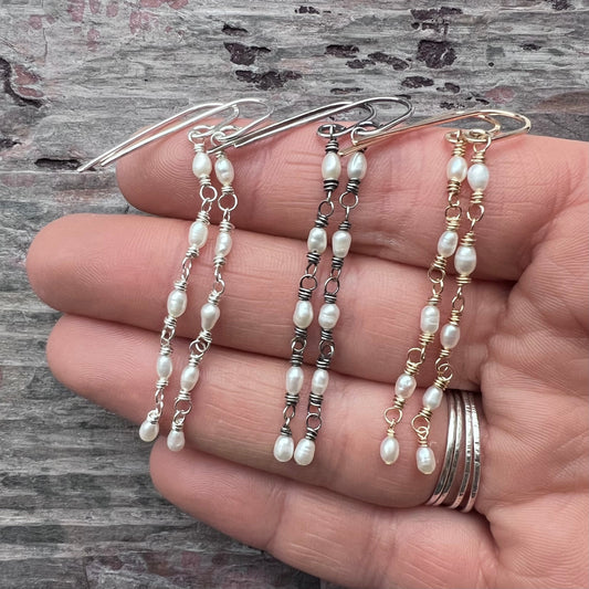 14k Goldfill Pearl Earrings | Long Genuine Pearl Gold or Silver Dangle Earrings