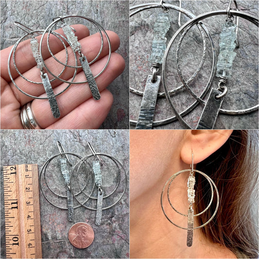 Aquamarine Sterling Silver Earrings - Genuine Aquamarine and Hammered Bars in Sterling Silver Hoop Earrings