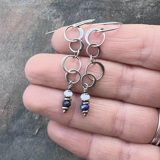 Sterling Silver Lapis Lazuli and Opalite Earrings | Blue Stone Long Chain Earrings