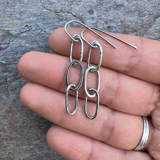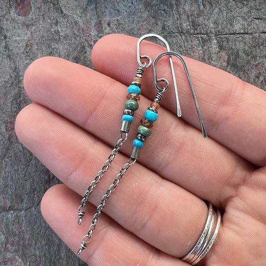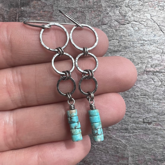 Sterling Silver Turquoise Earrings | Genuine Turquoise on Hammered Silver Ring Long Dangle Earrings Handmade Jewelry Gift for Her