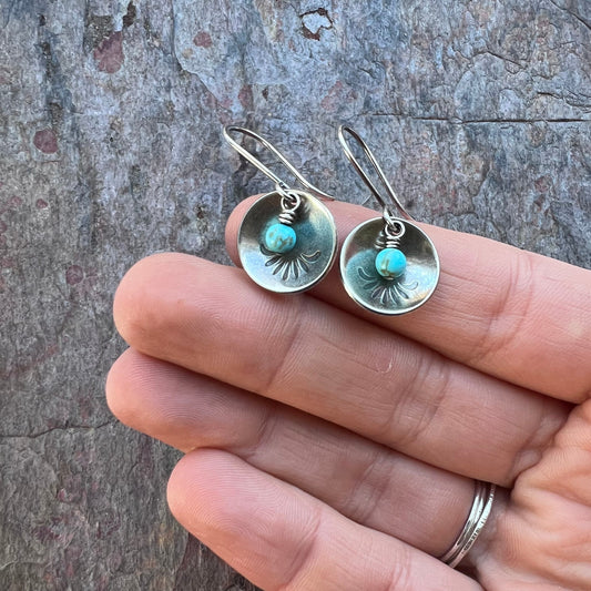 Turquoise Sterling Silver Earrings - Tiny Turquoise Beads in Stamped Sterling Silver Domed Circles
