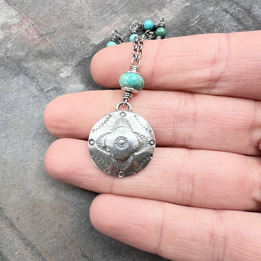 Genuine Turquoise Sterling Silver Necklace | Natural Stone Beads with Stamped Pendant