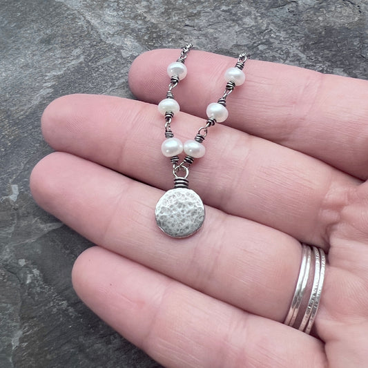 Sterling Silver Pearl Necklace | Wire-wrapped Pearls with Hammered Silver Pebble Pendant