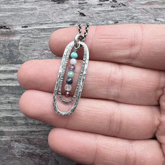 Customizable Sterling Silver Birthstone Necklace | Genuine Gemstone Hammered Long Oval Pendant