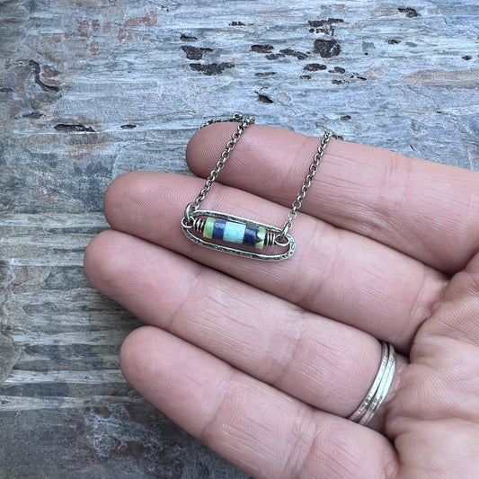 Sterling Silver Genuine Stone Necklace | Amazonite, Lapis Lazuli, and Chrysoprase in Hammered Oval Pendant