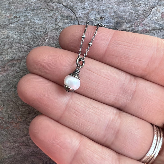 Sterling Silver Pearl Necklace - Small Genuine Freshwater Pearl Pendant on Sterling Silver Satellite Chain