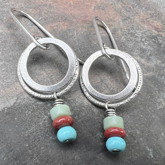 Sterling Silver Natural Stone Earrings | Turquoise, Jasper, and Chrysoprase on Small Hoop Dangles