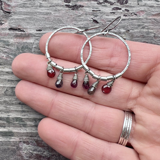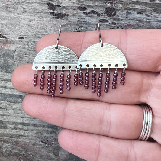 Garnet Sterling Silver Earrings | Hammered Silver and Genuine Garnet Fringe Dangles
