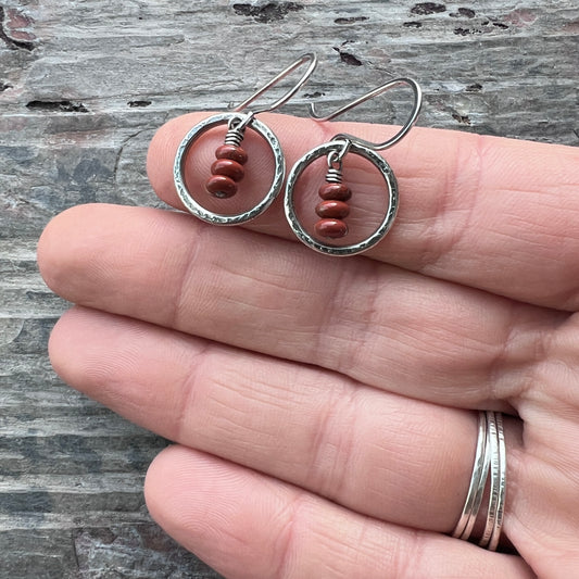 Sterling Silver Red Jasper Earrings | Natural Stones in Hammered Rings
