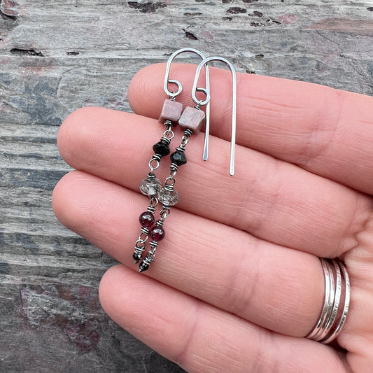Sterling Silver Natural Stone Earrings | Pink and Black Beaded Long Dangles