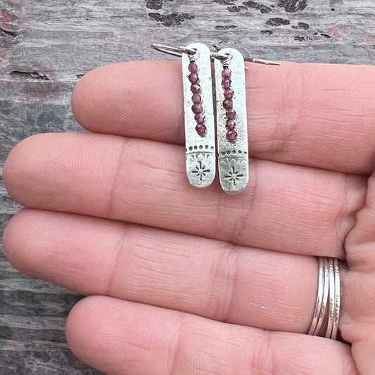 Garnet Sterling Silver Earrings | Stamped Silver and Genuine Garnet Elongated Dangles