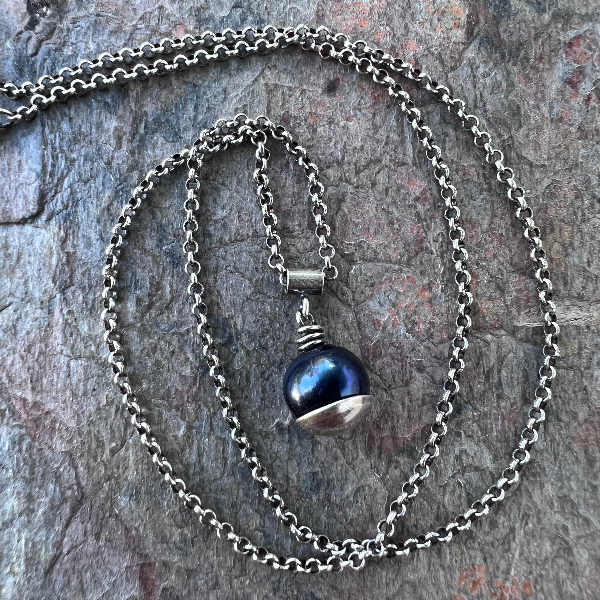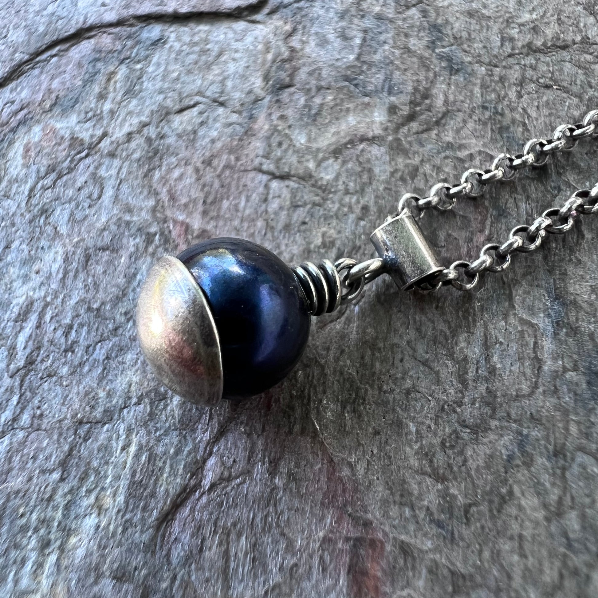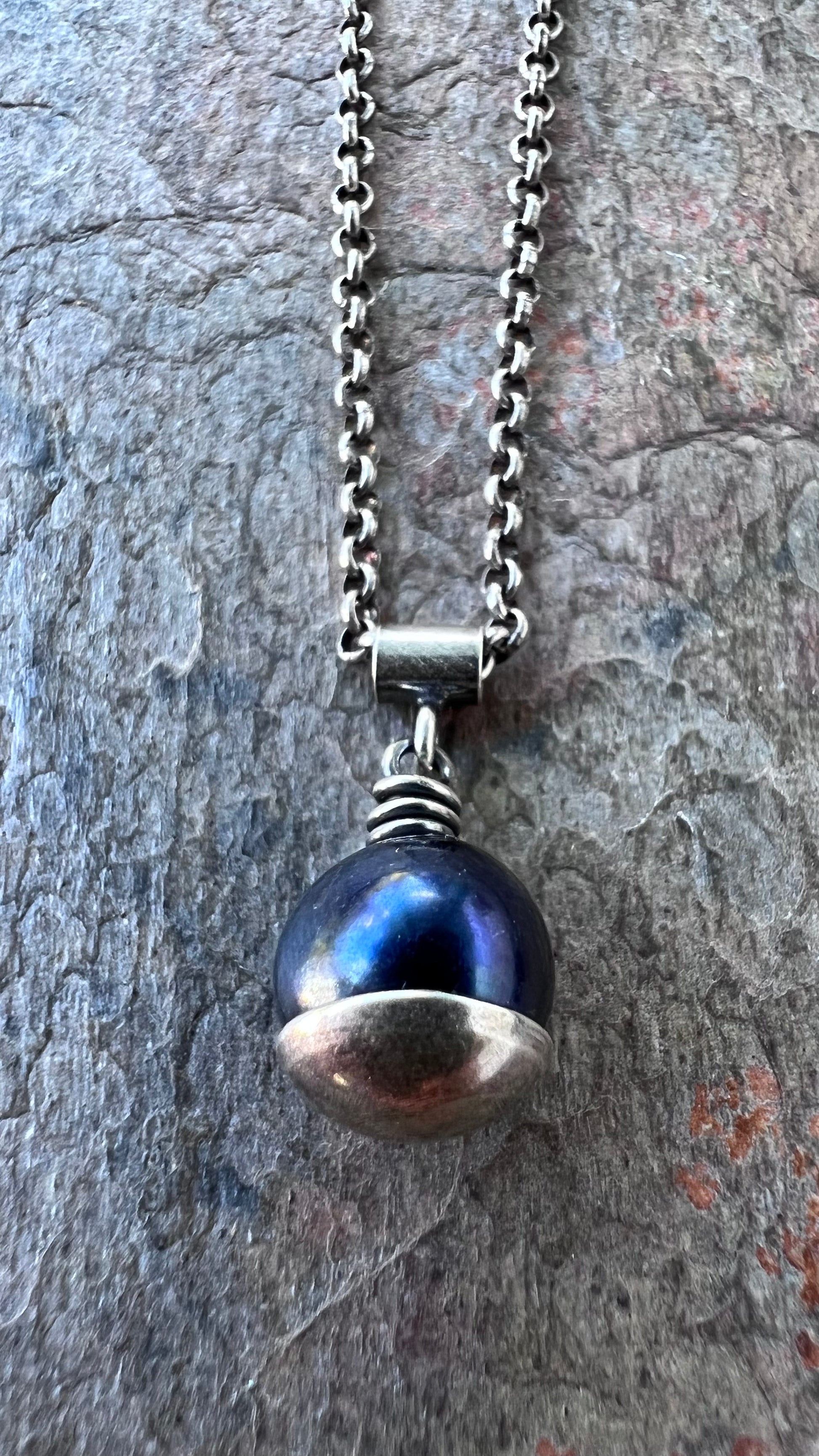 A genuine pearl is carefully wrapped in sterling silver wire. The beautiful pearl measures about 8-9mm and is a deep dark color with subtle hints of purple. It is framed by a sterling silver domed circle which I have cut, formed, and soldered by hand. The pendant hangs from a sterling silver tube bail suspended along a Sterling Silver chain. The silver has been oxidized and polished to create its antique patina finish.