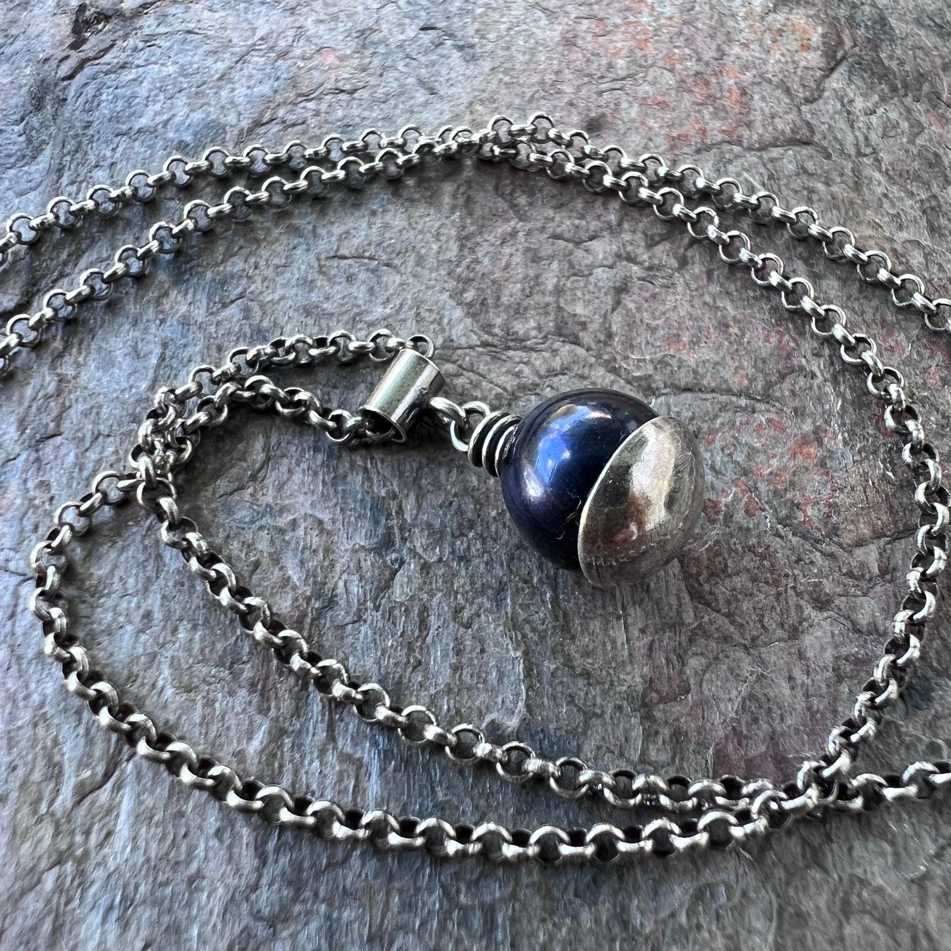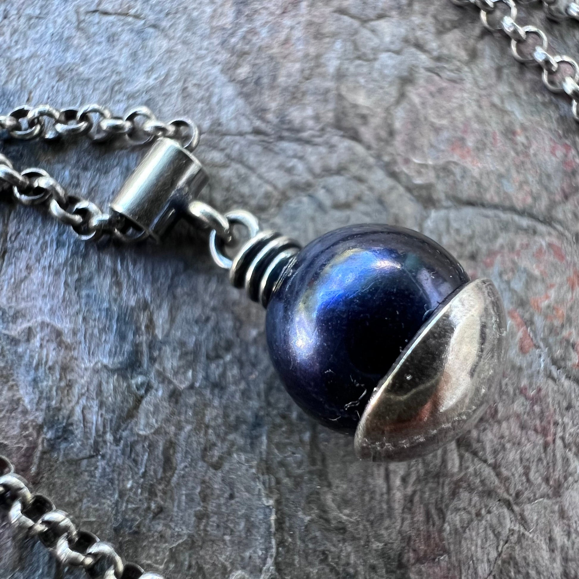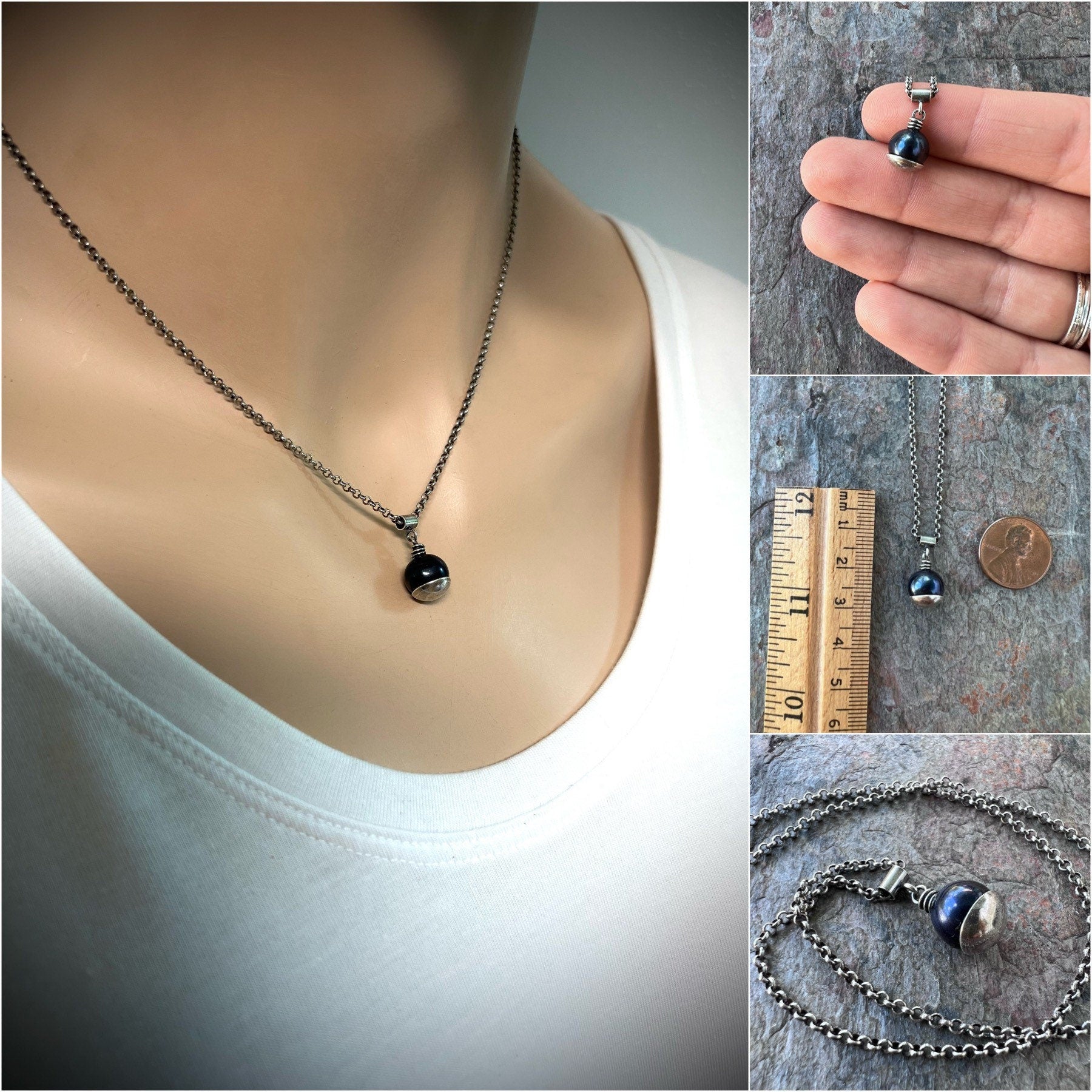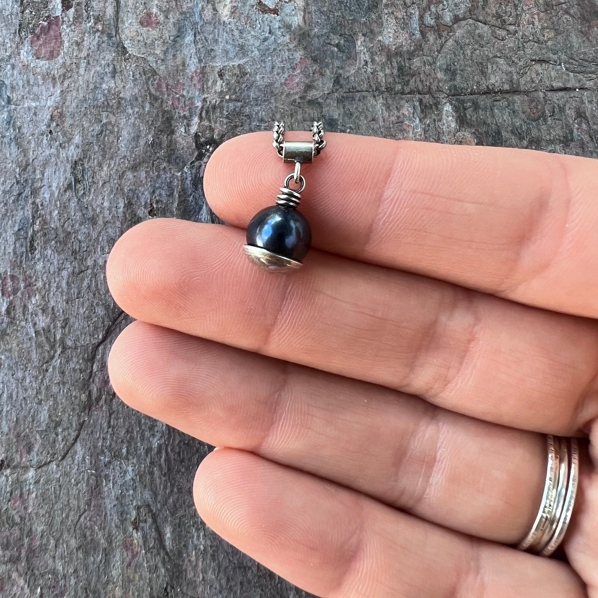 A genuine pearl is carefully wrapped in sterling silver wire. The beautiful pearl measures about 8-9mm and is a deep dark color with subtle hints of purple. It is framed by a sterling silver domed circle which I have cut, formed, and soldered by hand. The pendant hangs from a sterling silver tube bail suspended along a Sterling Silver chain. The silver has been oxidized and polished to create its antique patina finish.