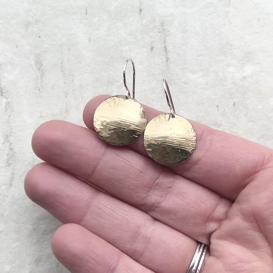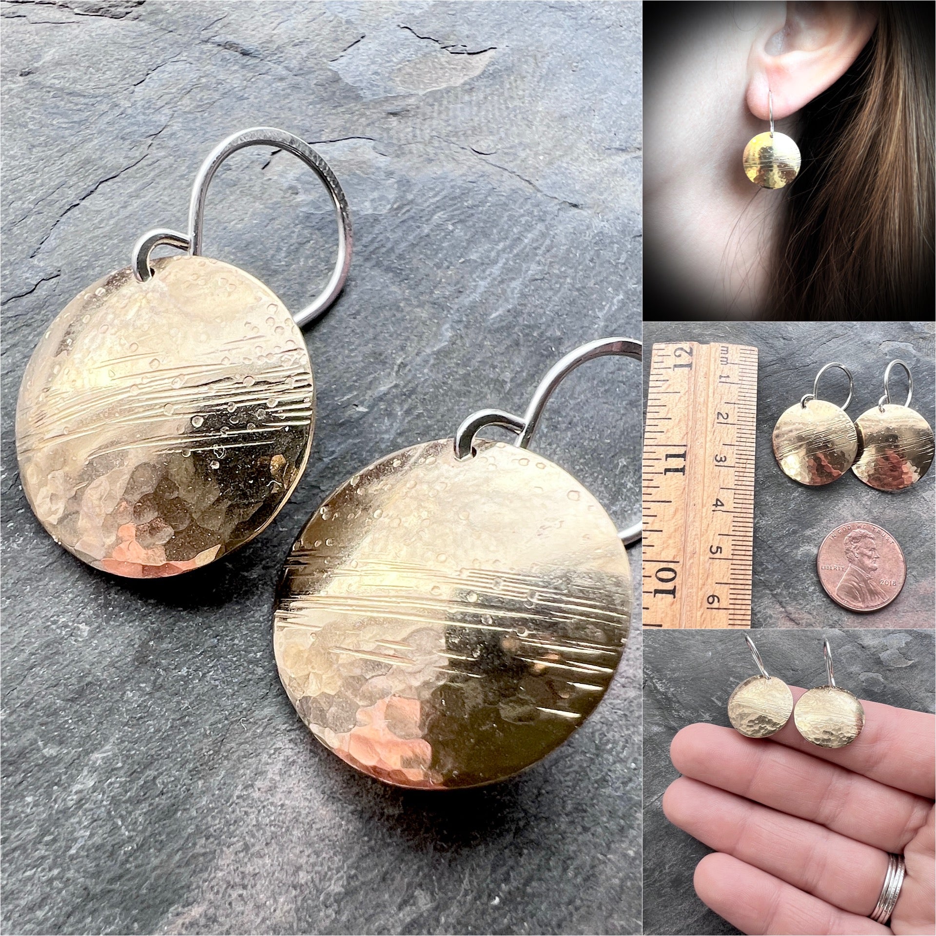 These mixed metal dangle earrings are handmade from sterling silver and golden jeweler's brass. I cut a pair of circles from a sheet of solid brass. I then hammer each circular disc with a variety of hammers to create the unique texture. The earrings dangle from handmade sterling silver earwires.