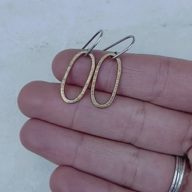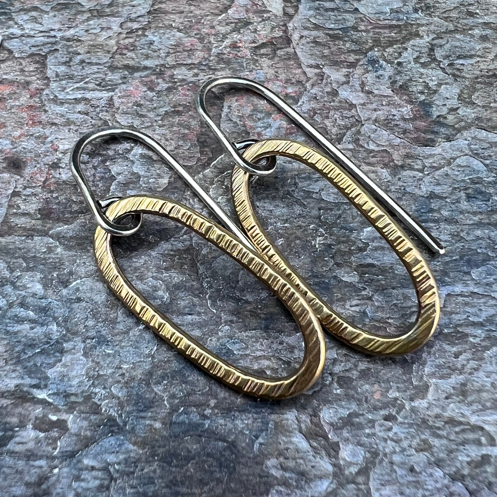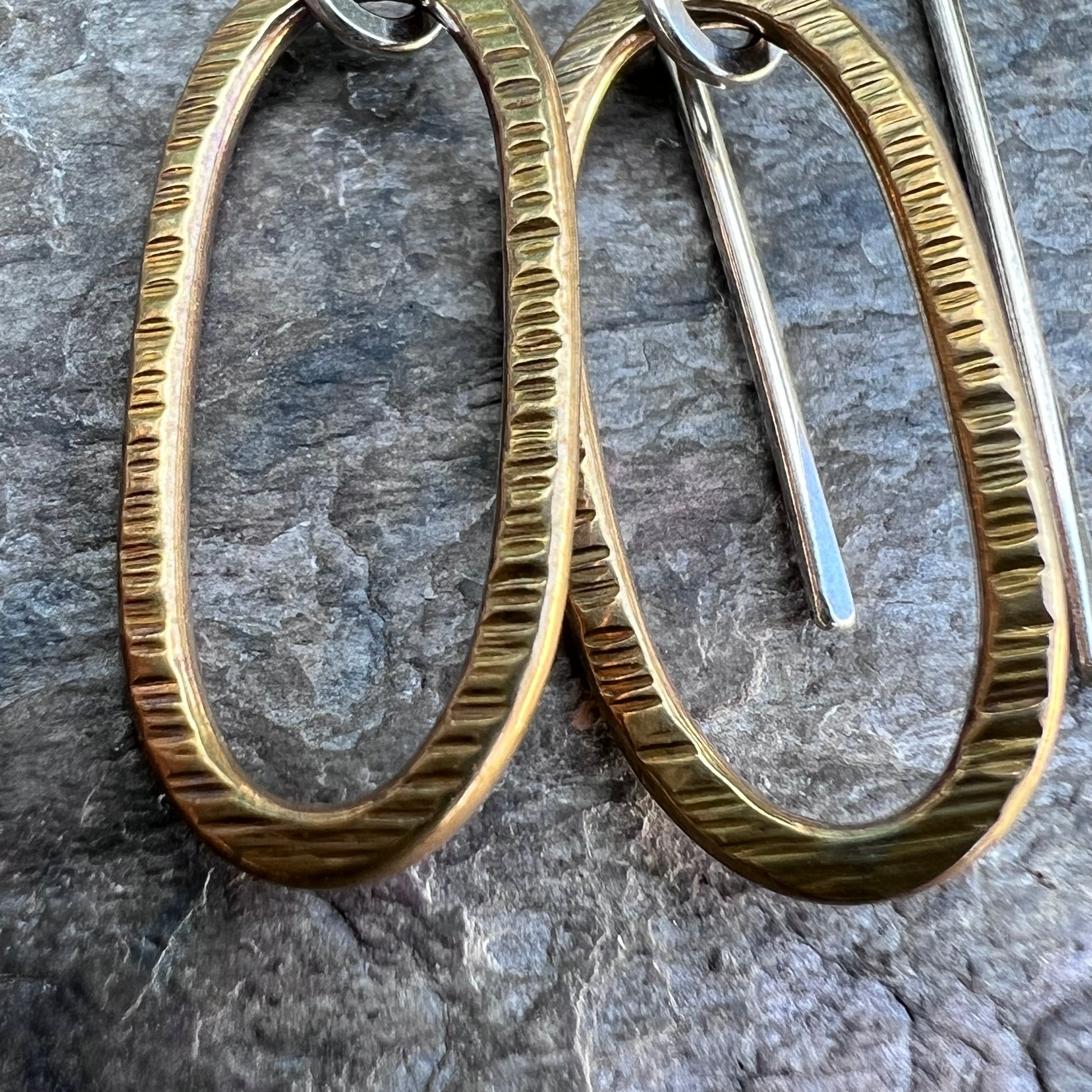A pair of elongated ovals have been created from pure jeweler's brass. The ovals were formed, soldered, and textured entirely by hand. The earrings dangle from handmade sterling silver earwires. The silver has been oxidized and polished to create an patina finish.