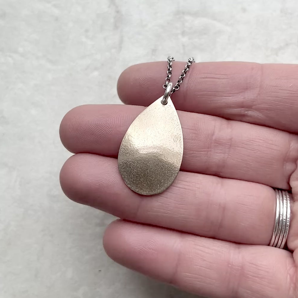 This mixed metal pendant necklace is handmade from golden bronze and solid sterling silver. I cut a teardrop from a sheet of solid bronze. I then polish and finish the teardrop by hand to give the bronze an aged satin finish. At the top of the teardrop is a circular ring bail made from sterling silver. The pendant hangs from a lightweight sterling silver chain.