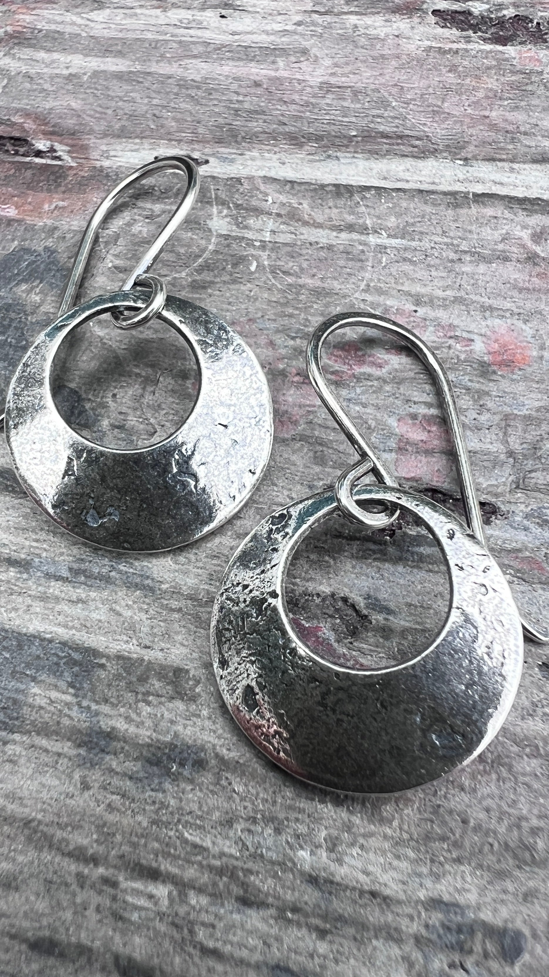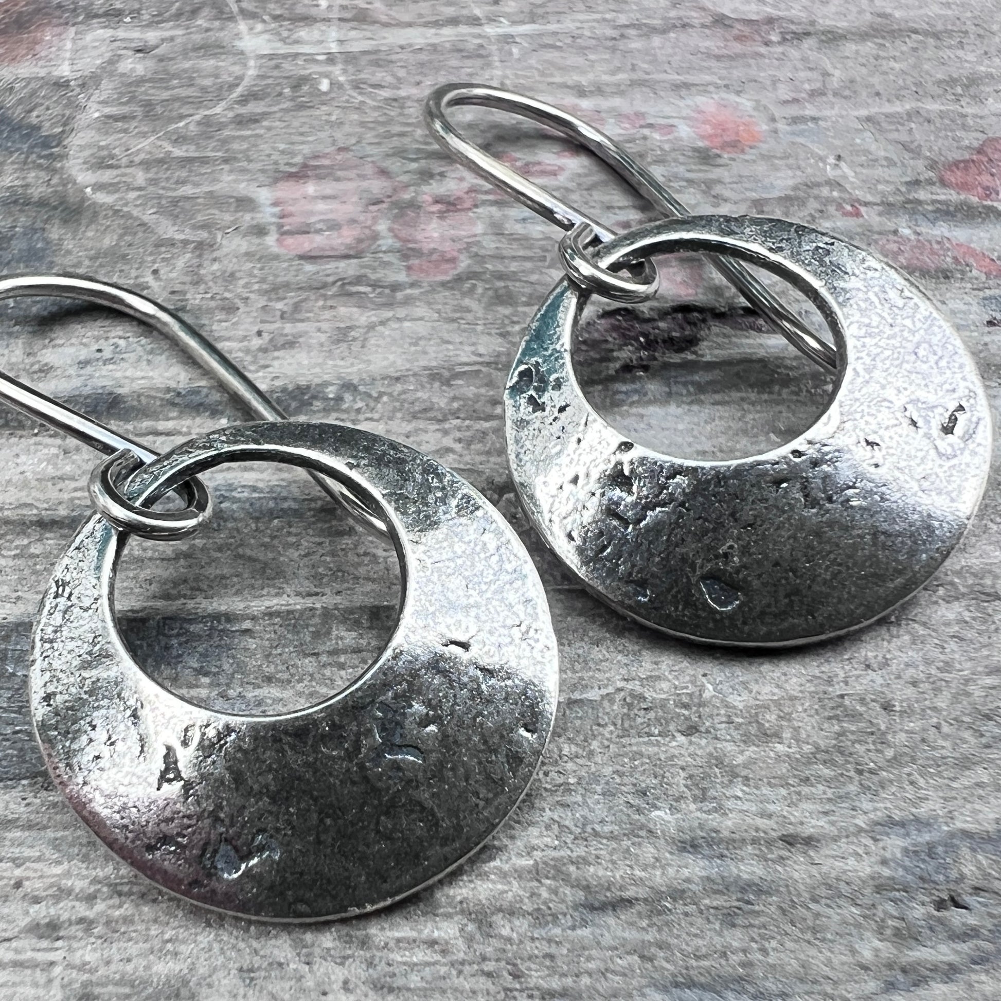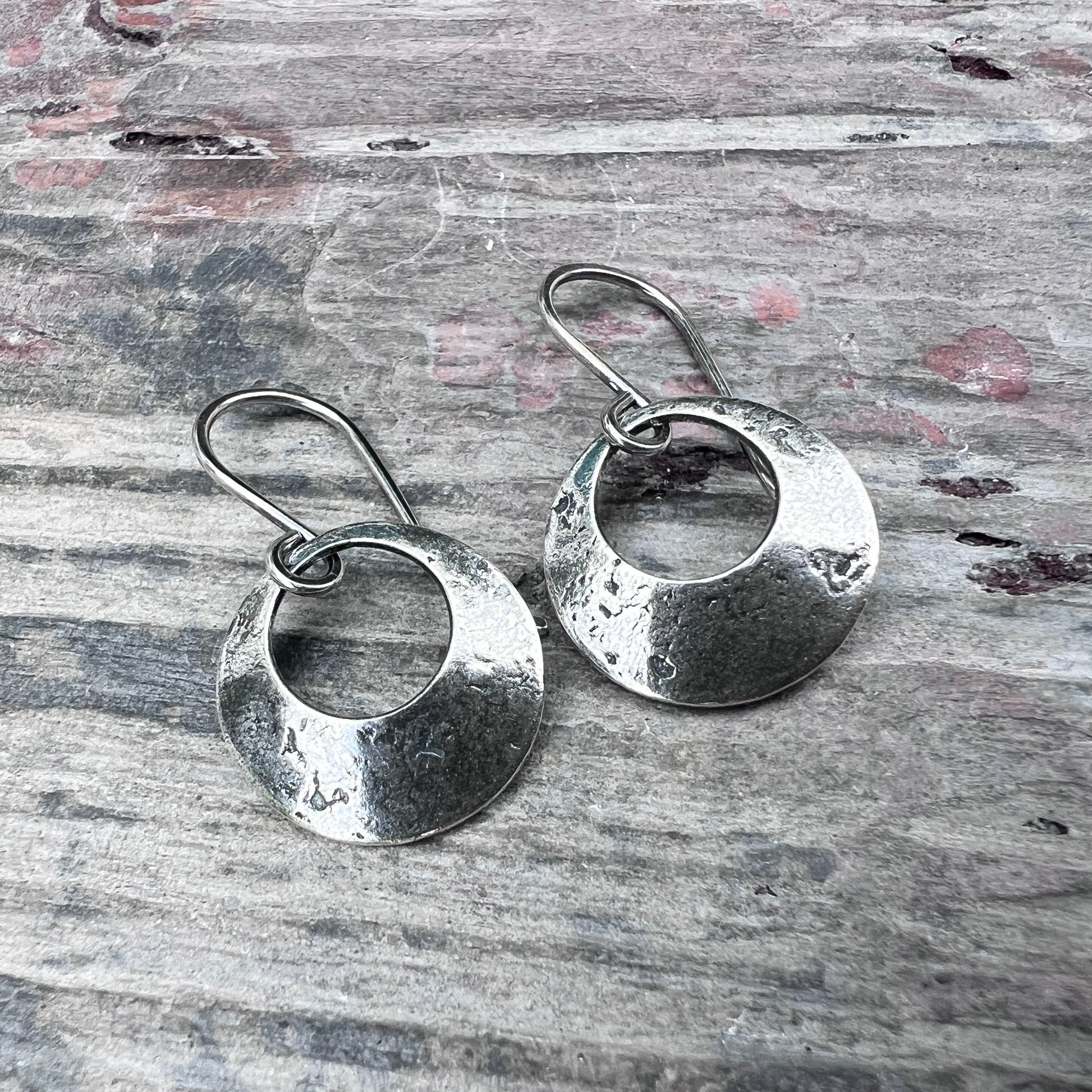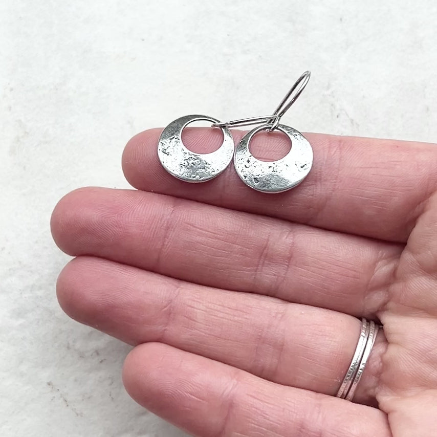 These dangle hoop earrings are handmade from solid sterling silver. I have cut two circles from a sheet of silver to create the hoop shapes. I then gave the surfaces a lightly distressed and antiqued texture before slightly doming each earring. The circles dangle from handmade earwires made from sterling silver.