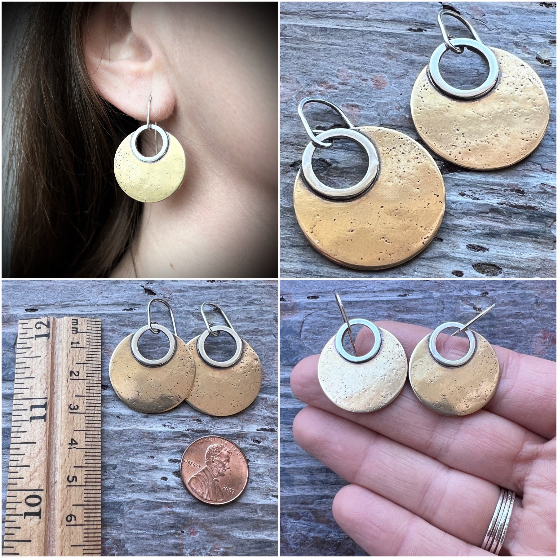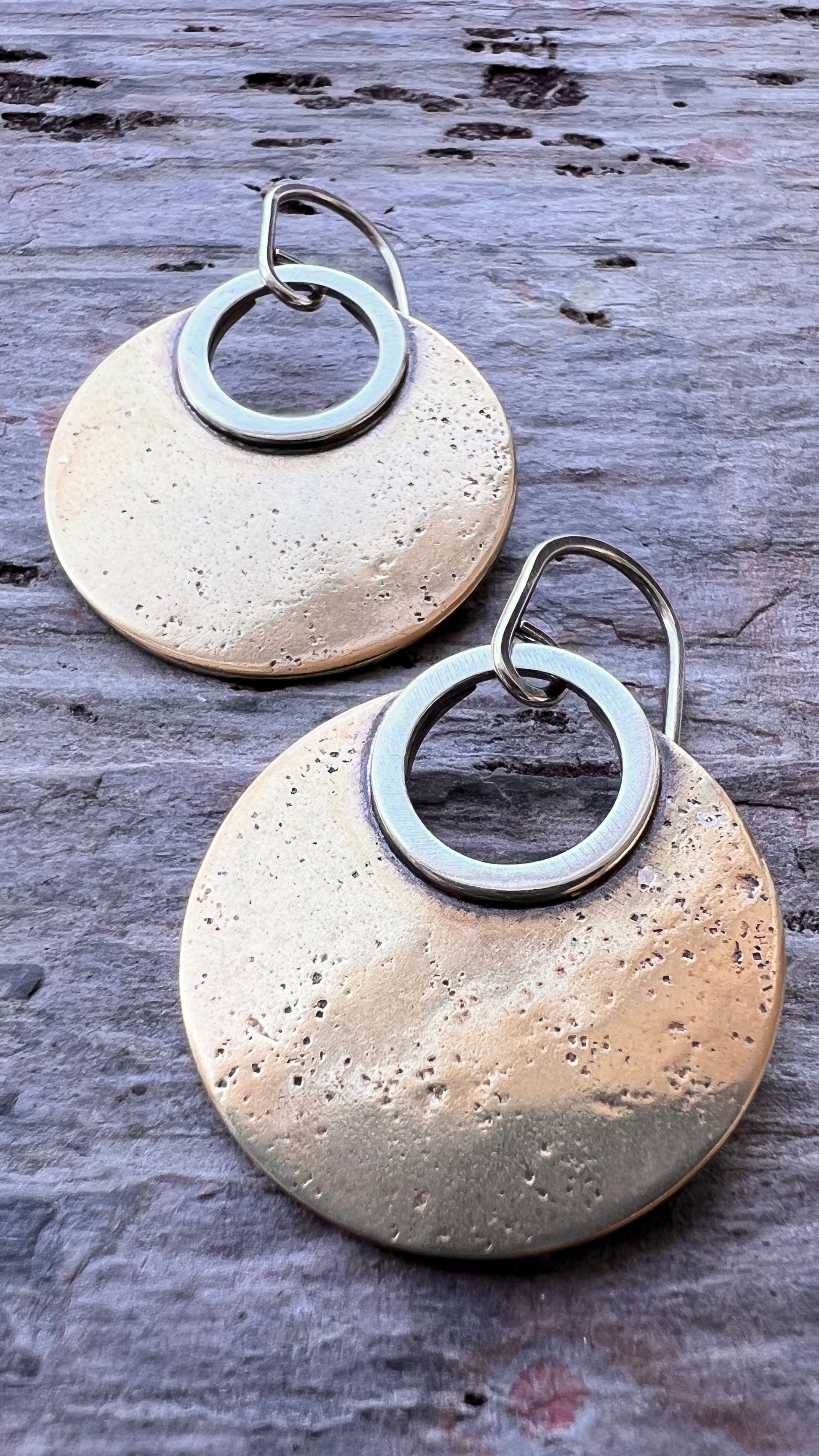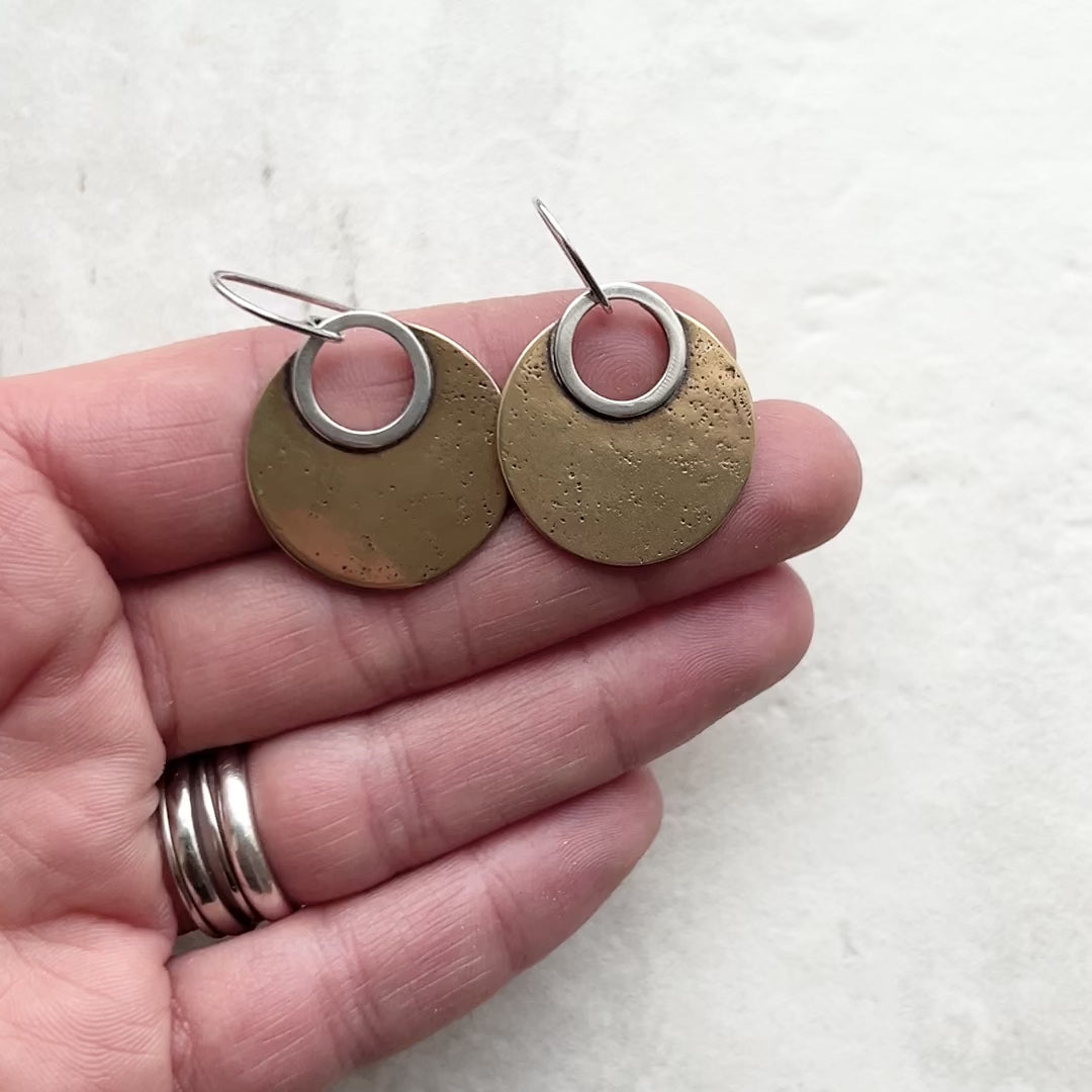 These mixed metal dangle earrings are handmade from solid sterling silver and golden jeweler's grade brass. I cut two circles from a sheet of brass. I then soldered these circles to sterling silver rings which I formed by hand. The metal has been lightly textured, oxidized, and polished to create an antique patina finish. The earrings dangle from handmade sterling silver earwires.