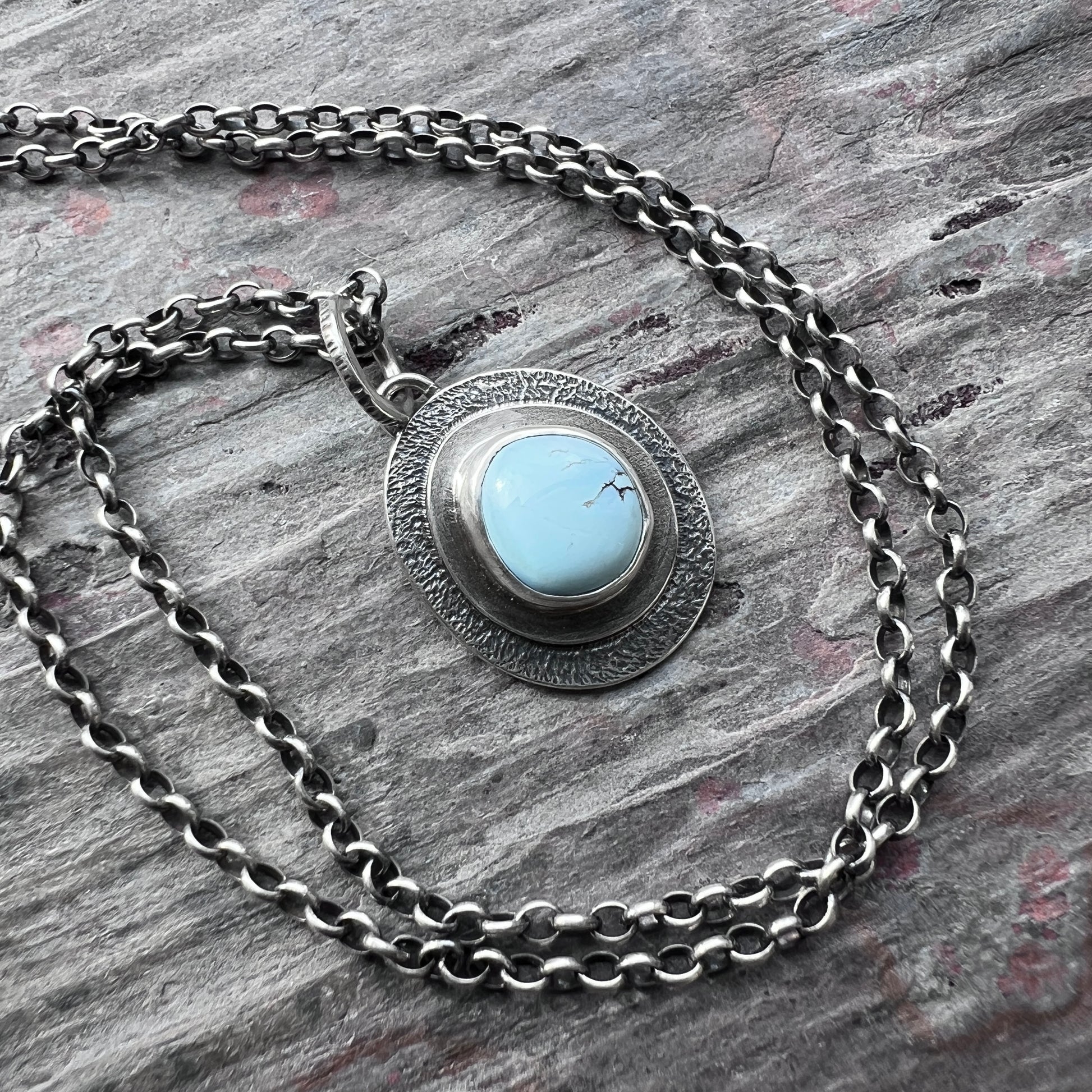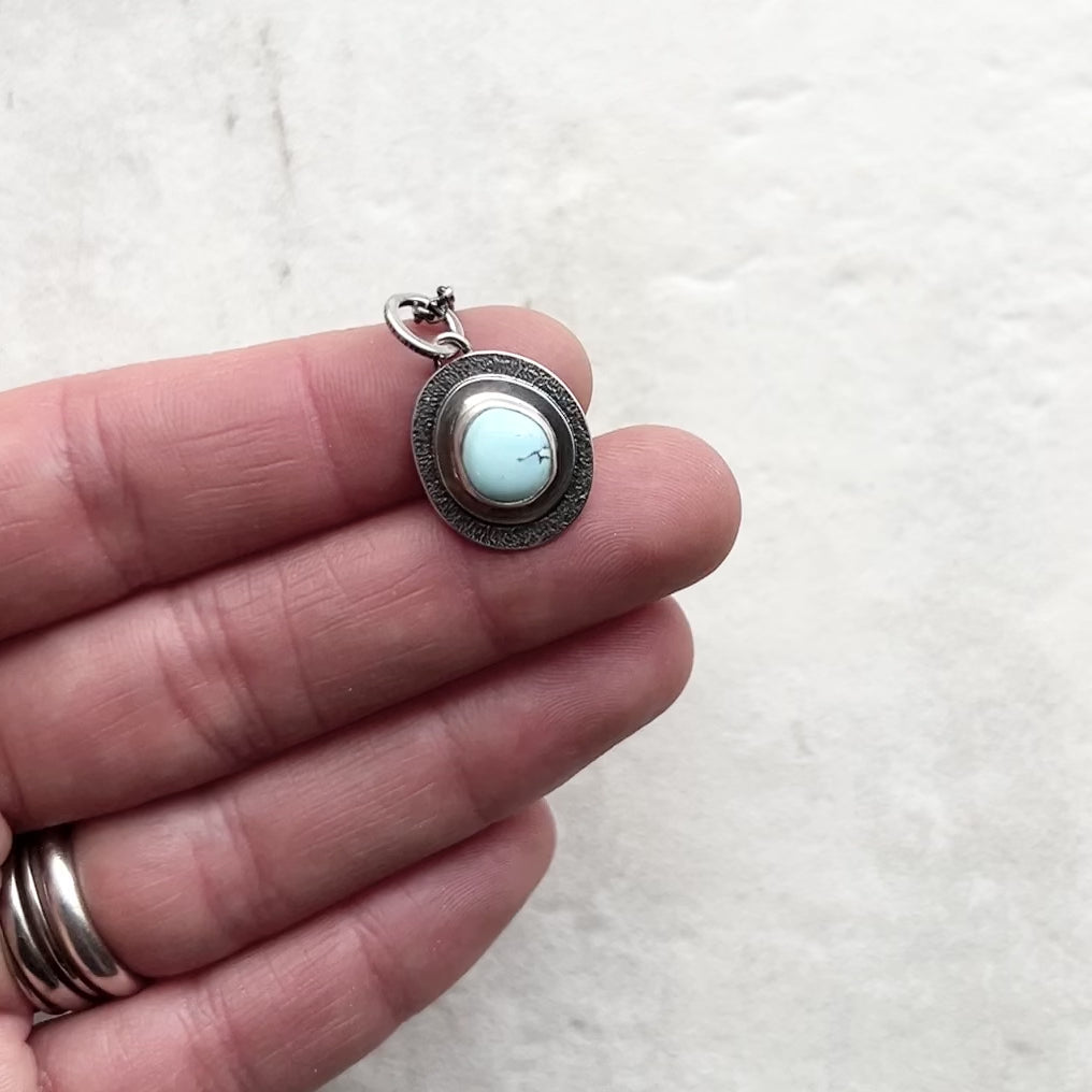 This pendant necklace is handmade from a genuine turquoise cabochon and sterling silver. The natural turquoise is ethically sourced from from the Golden Hill mine. The pale blue stone is framed by two layers of silver. This artisan pendant has been formed, soldered, textured, and finished entirely by hand. I have oxidized and polished the silver to create an antique patina finish.