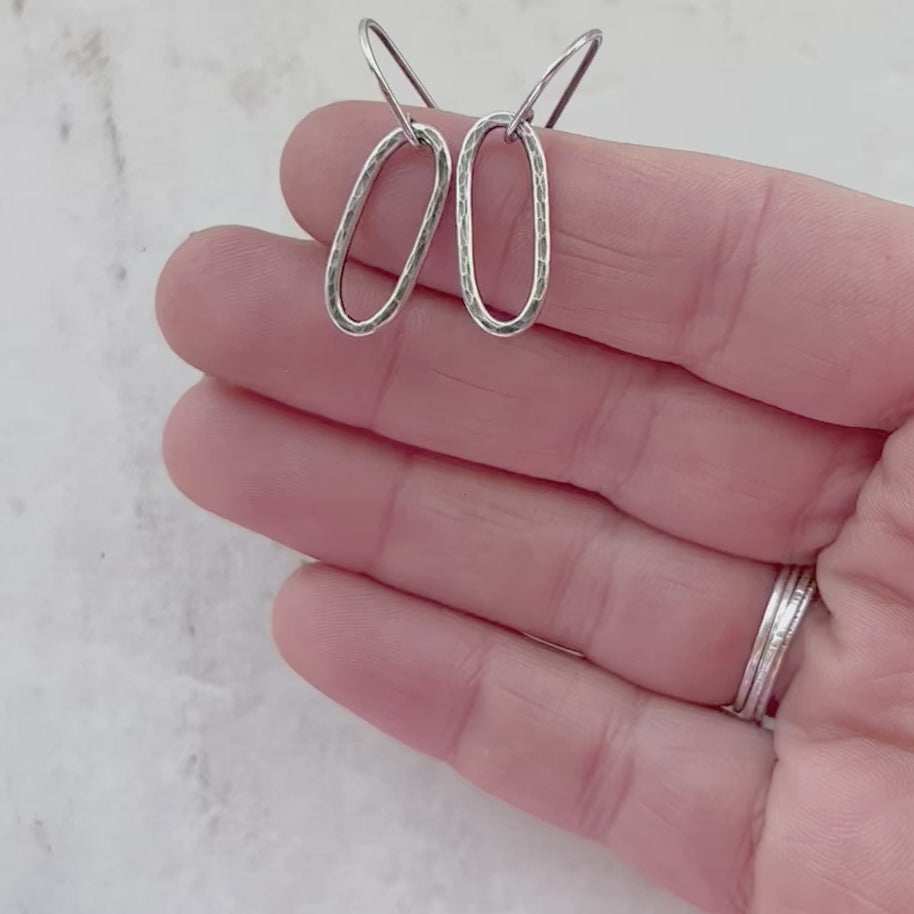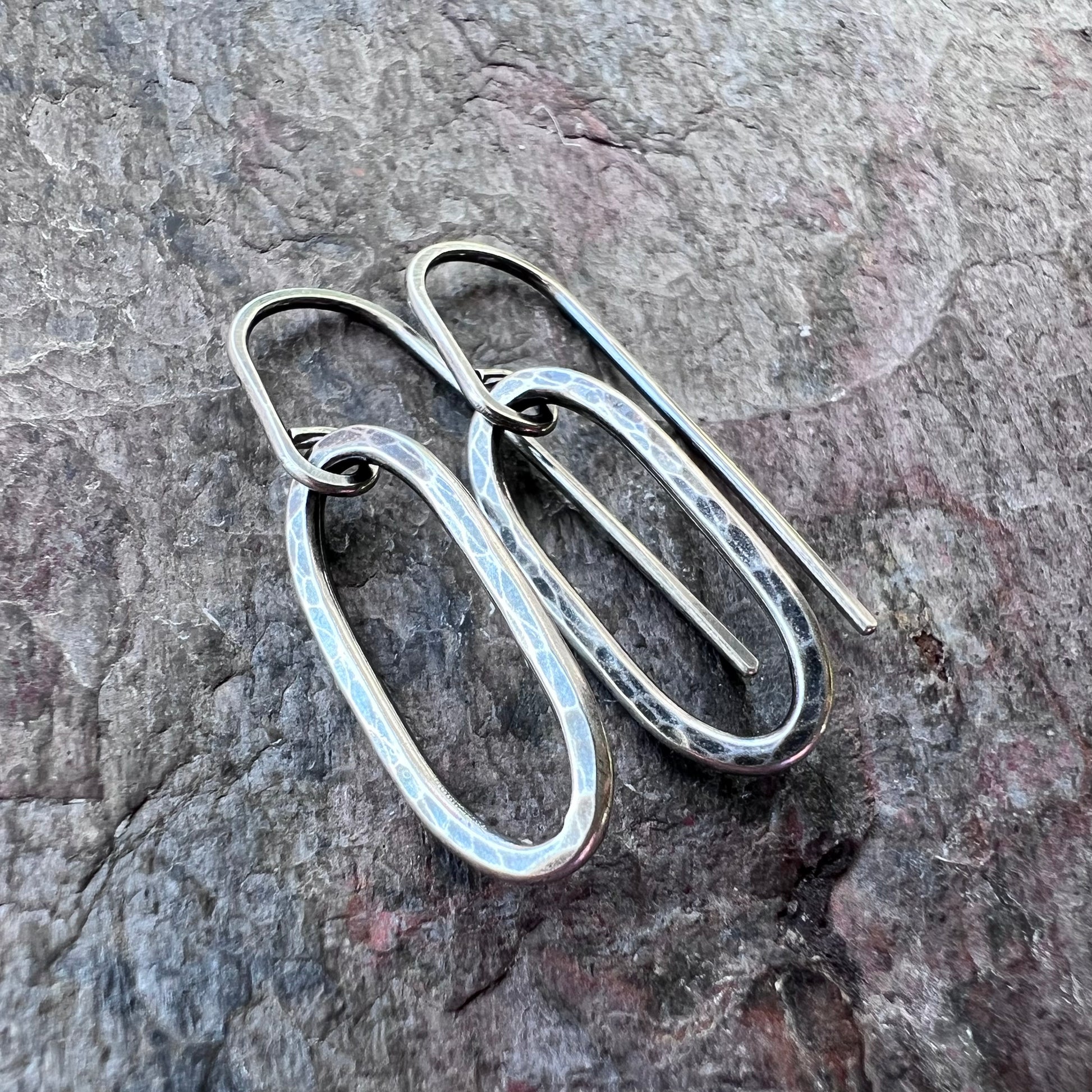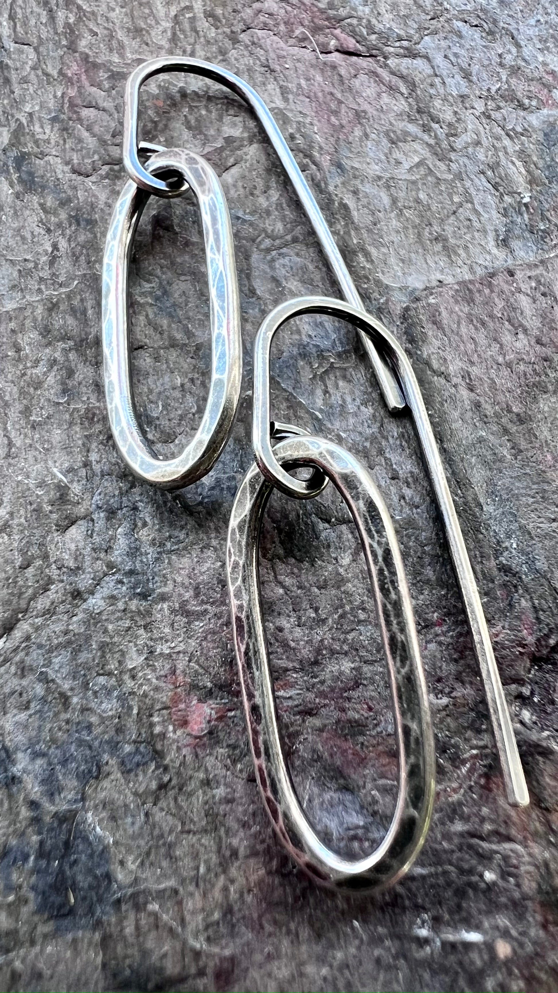 These dangle earrings are created entirely from solid sterling silver. I have formed the elongated links carefully one at a time. I then soldered and hammered the silver. The drops dangle from handmade sterling silver earwires. The silver has been oxidized and polished to create an antique patina finish.