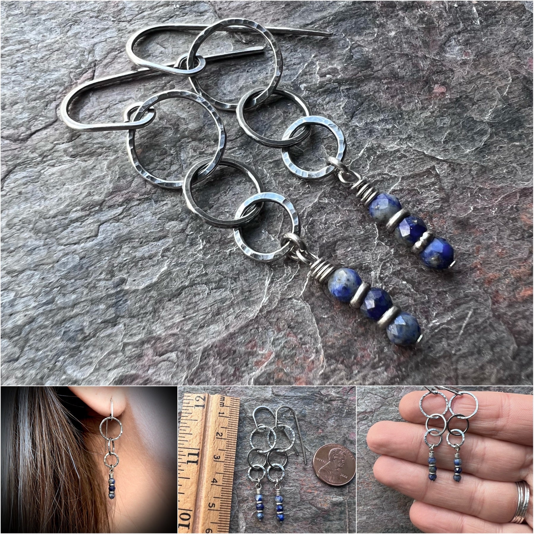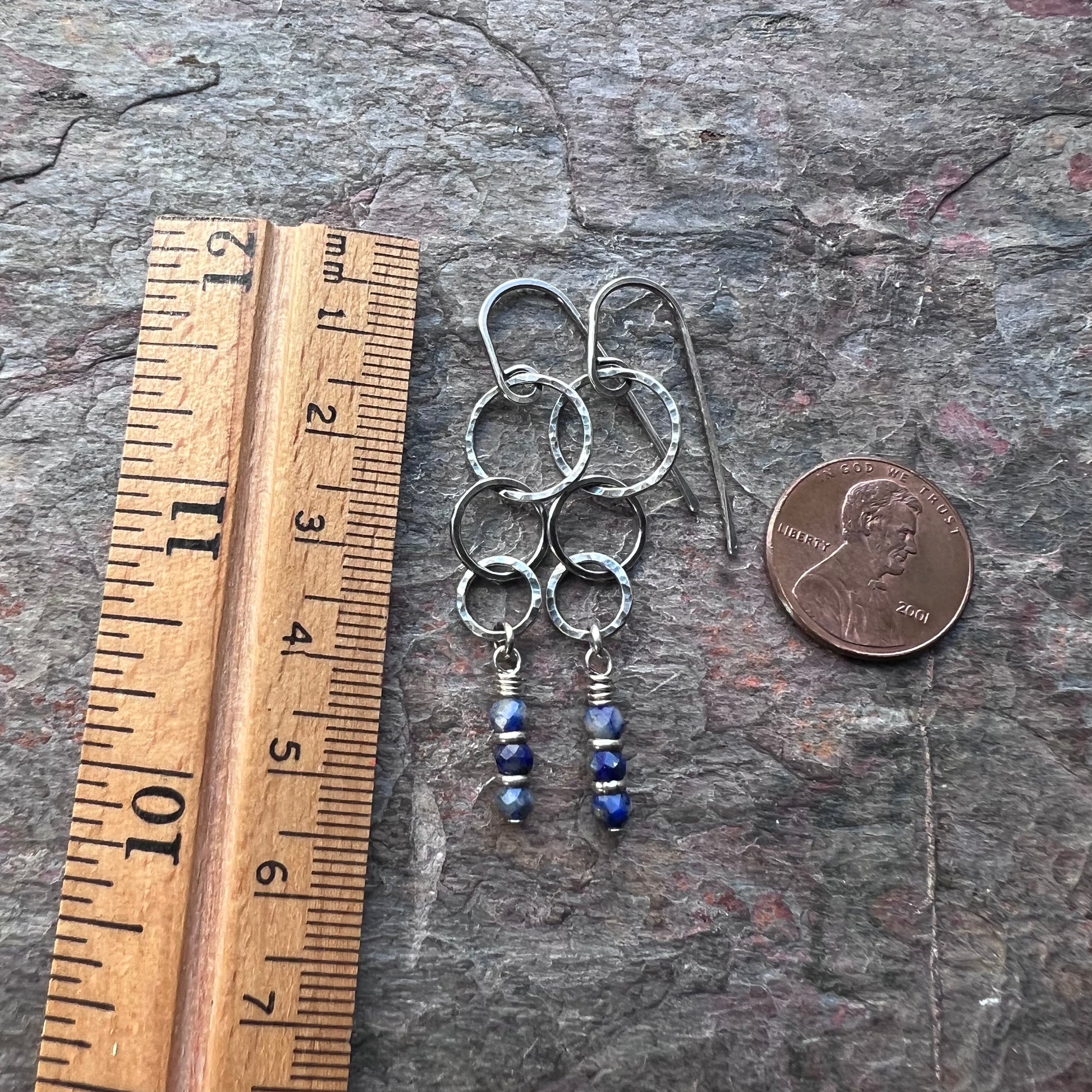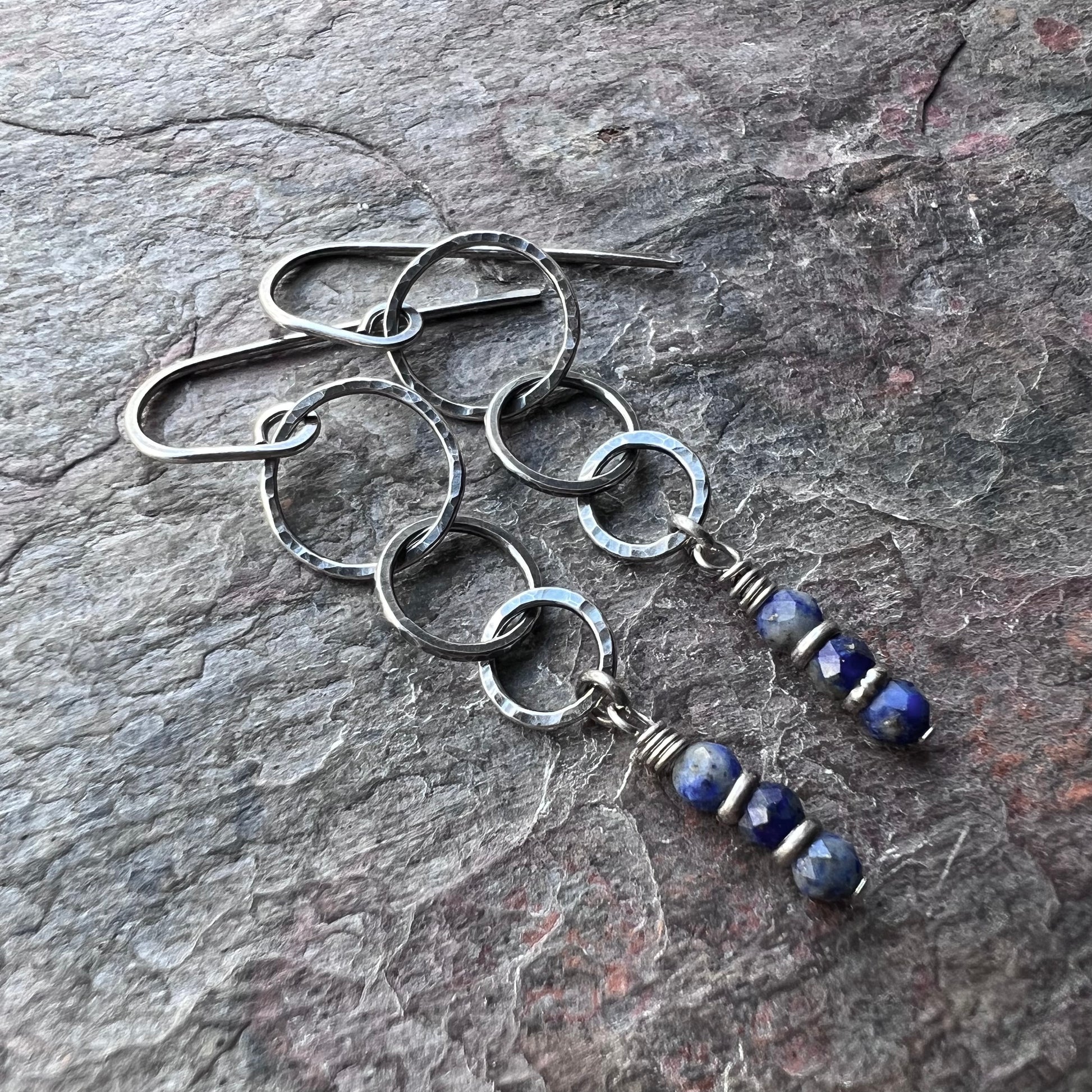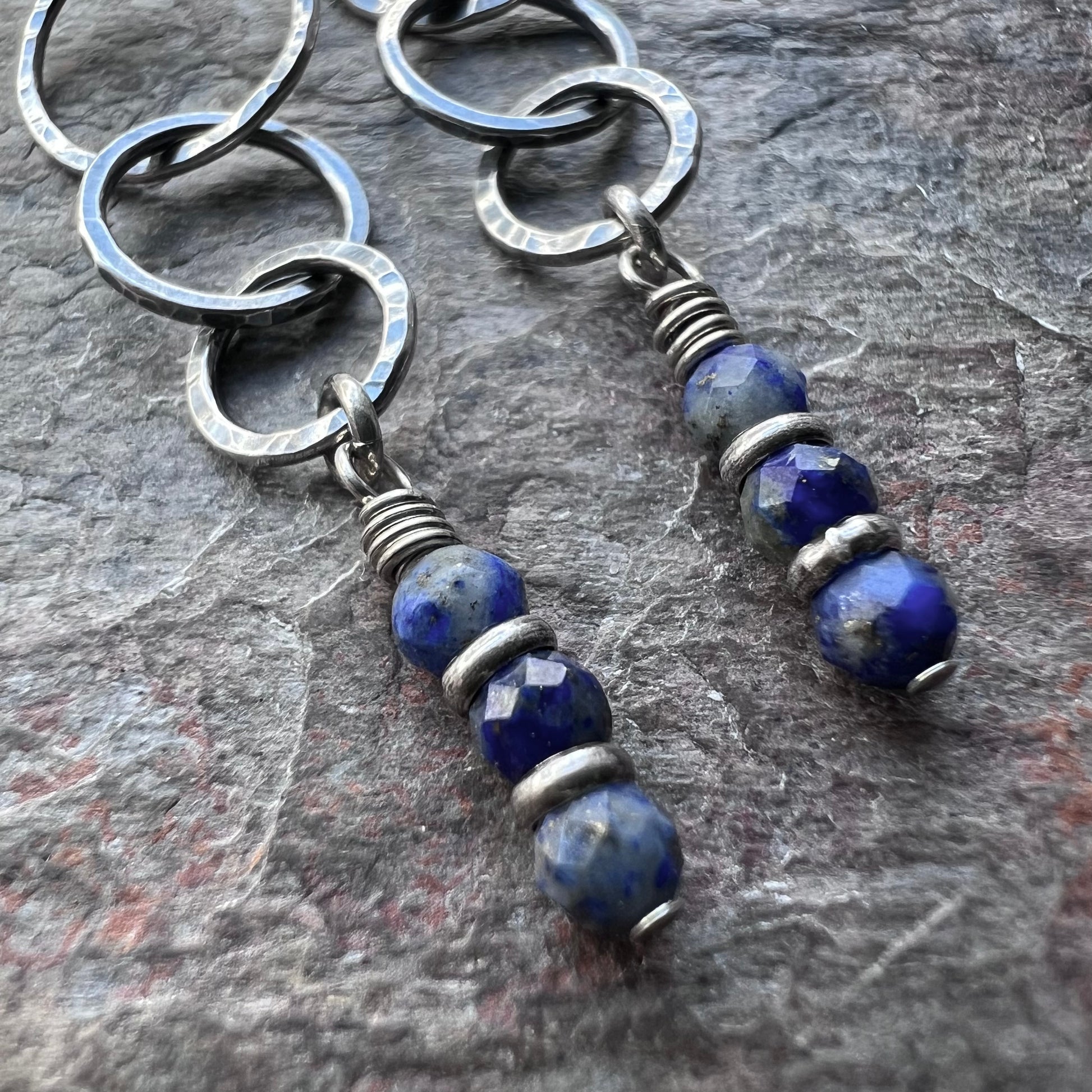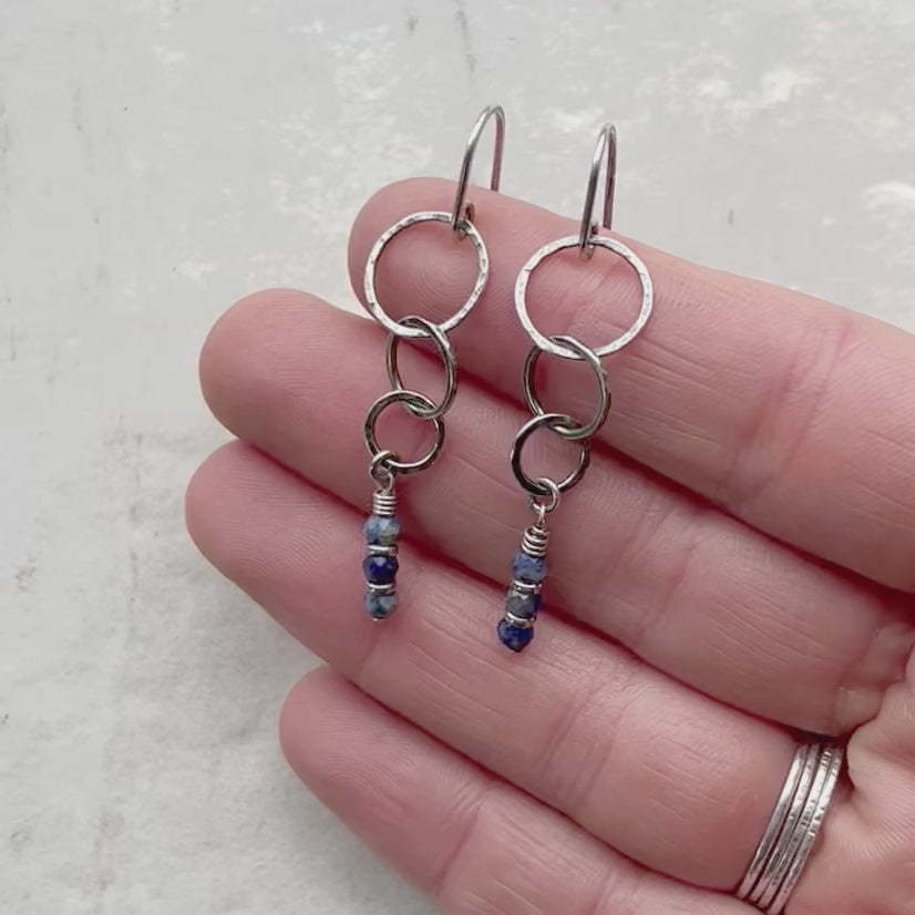 These long dangle earrings are created from genuine blue Lapis Lazuli gems and sterling silver. The tiny blue natural stones dangle below hammered sterling silver rings which I have formed, soldered, and textured by hand. The drops hang from handmade sterling silver earwires. The silver has been oxidized and polished to create an antique patina finish.
