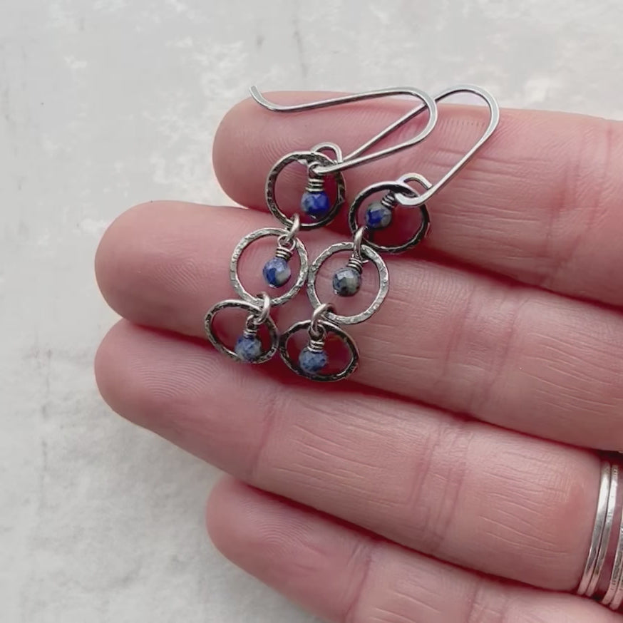 These dangle earrings are created from genuine blue Lapis Lazuli gems and sterling silver. The tiny natural stones are framed by a set of sterling silver circular rings. I have created the rings by forming, soldering, and hammering them by hand. The drops dangle from handmade sterling silver earwires. The silver has been oxidized and polished to create an antique patina finish.