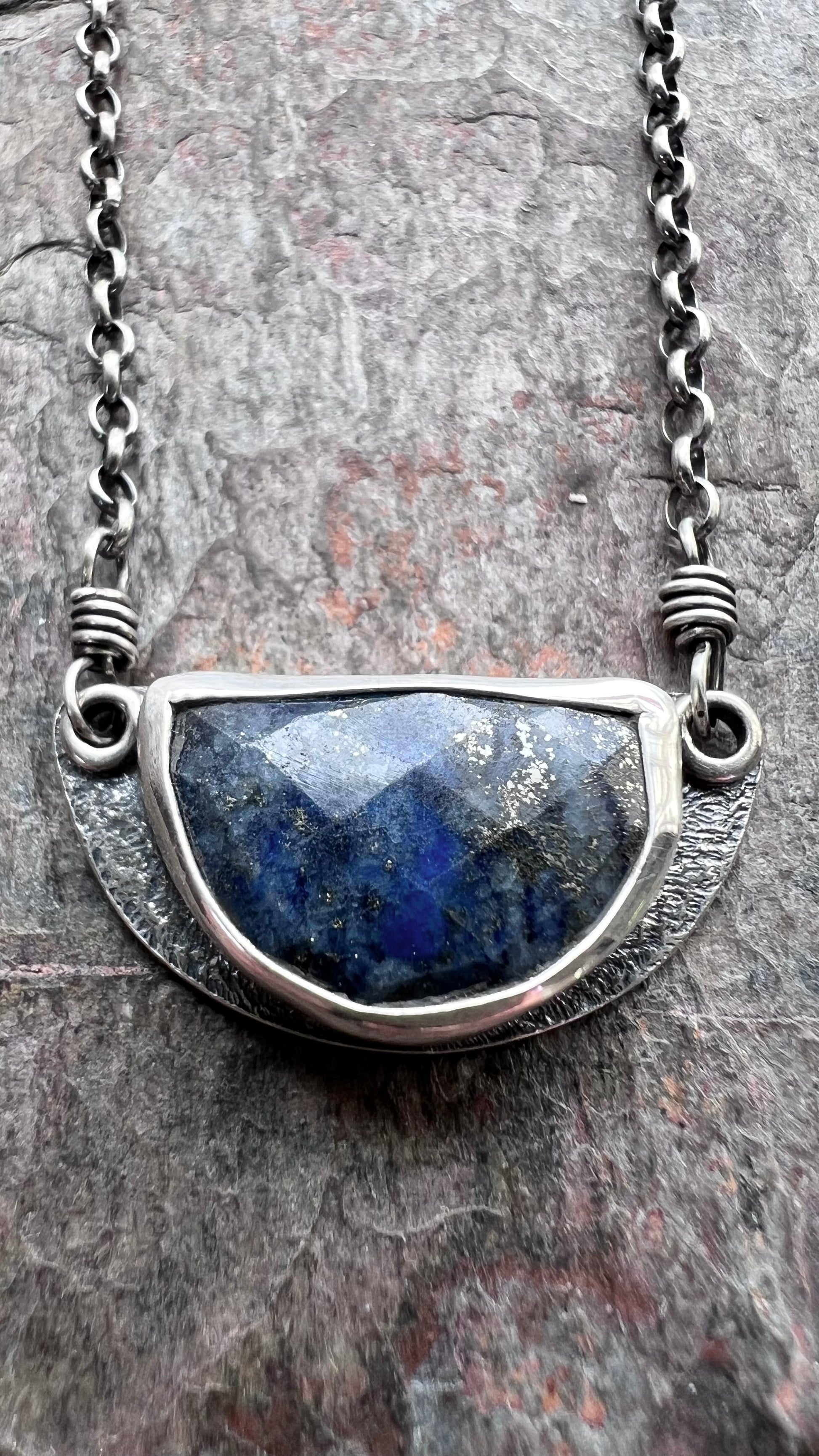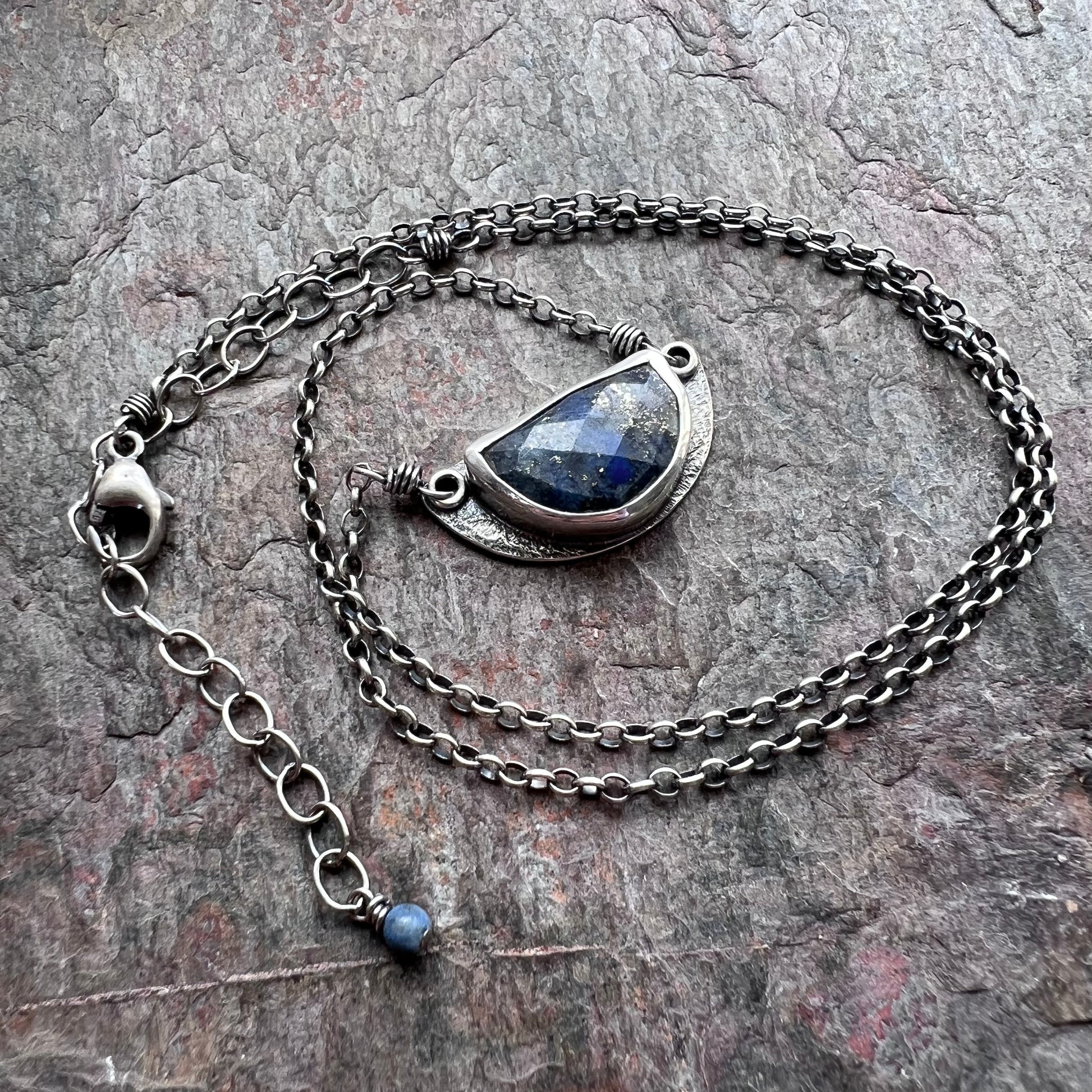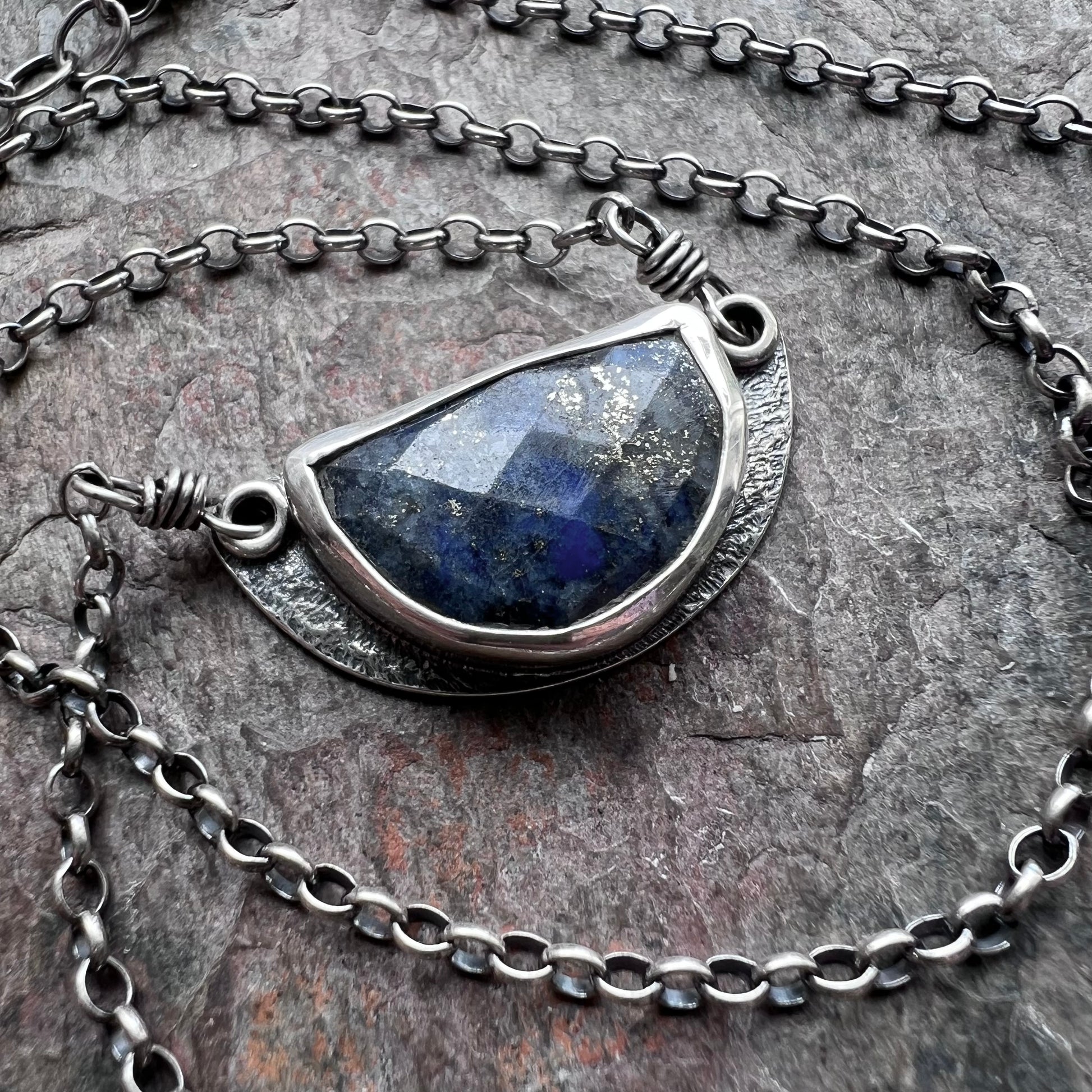 This pendant necklace was created from genuine blue Lapis Lazuli and sterling silver. The natural stone cabochon is framed in hammered sterling silver. I have made this semicircle pendant by sawing, soldering, texturing, and finishing the design entirely by hand. The pendant is suspended along a sterling silver chain. The necklace features a 3-inch extender which allows it to be slightly adjustable between 16-19" in total length including all parts of chain, clasp, and pendant. The silver has been oxidized and polished to create an antique patina finish.