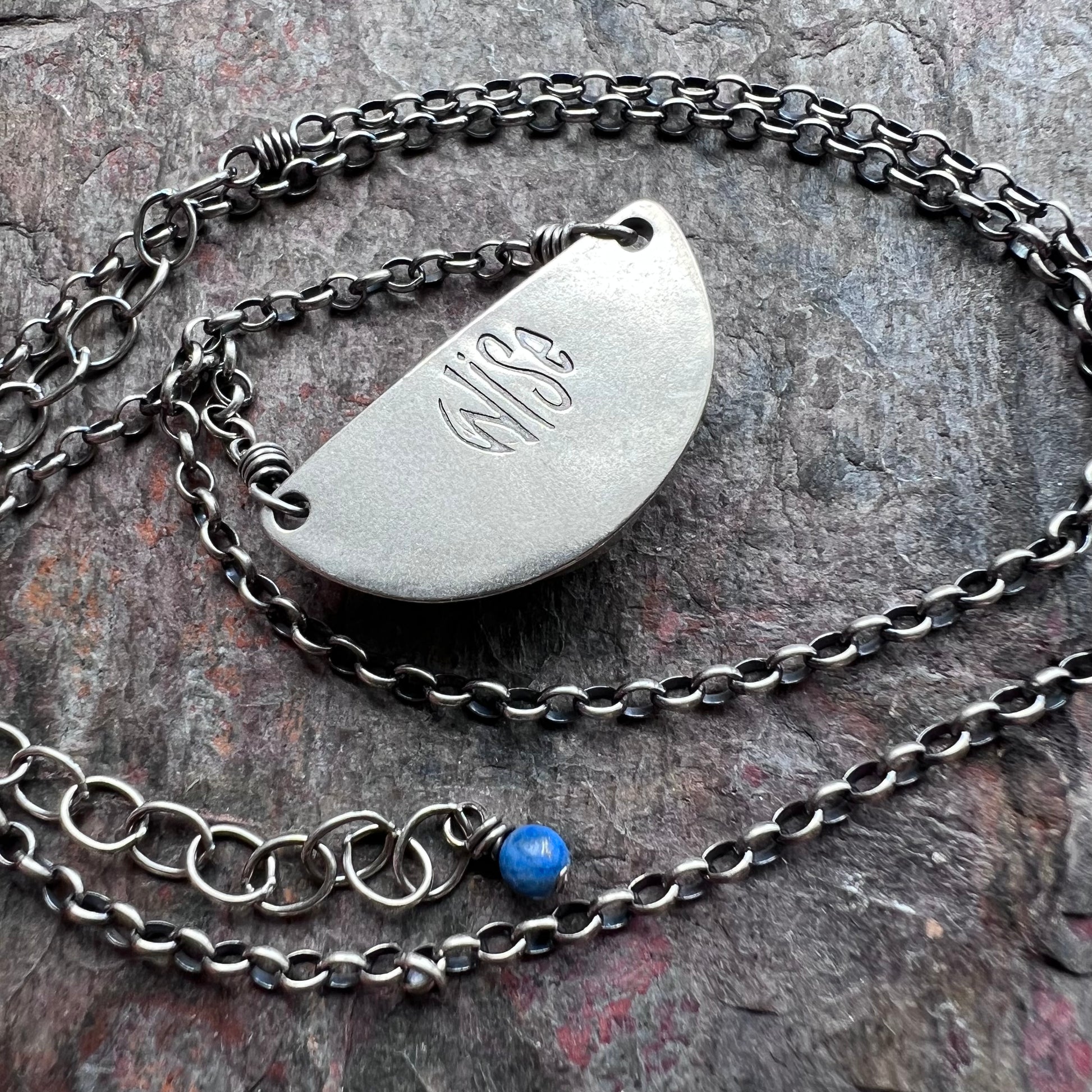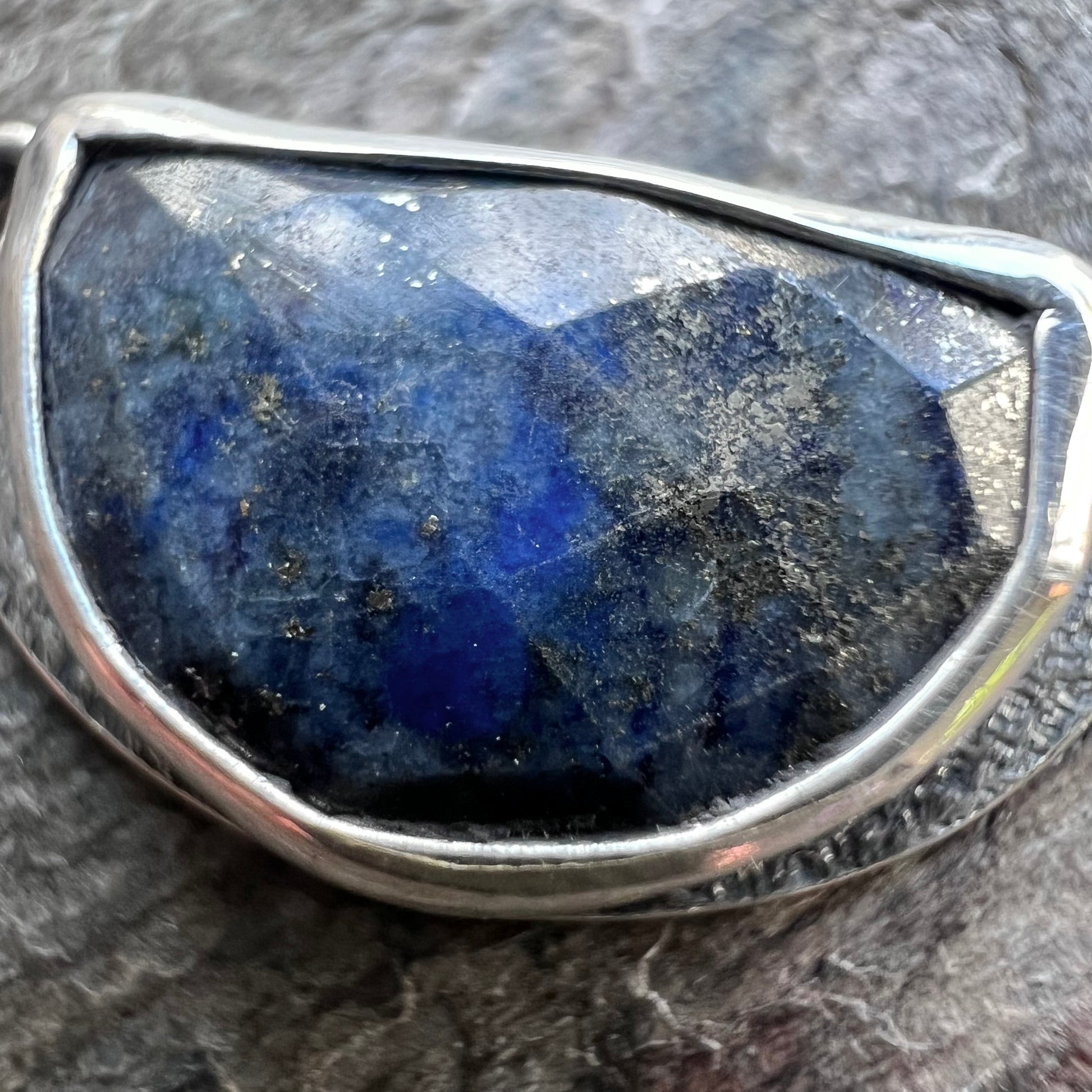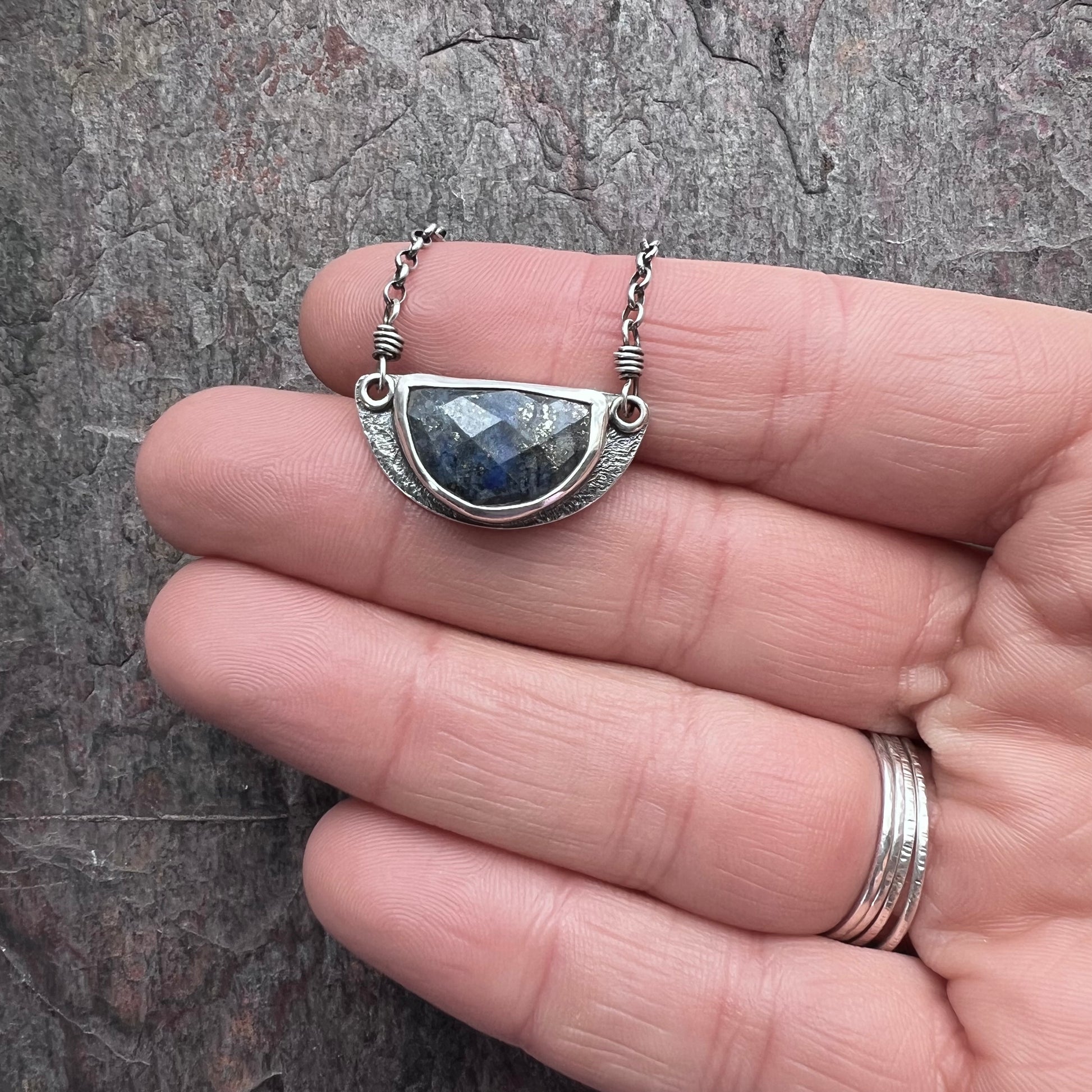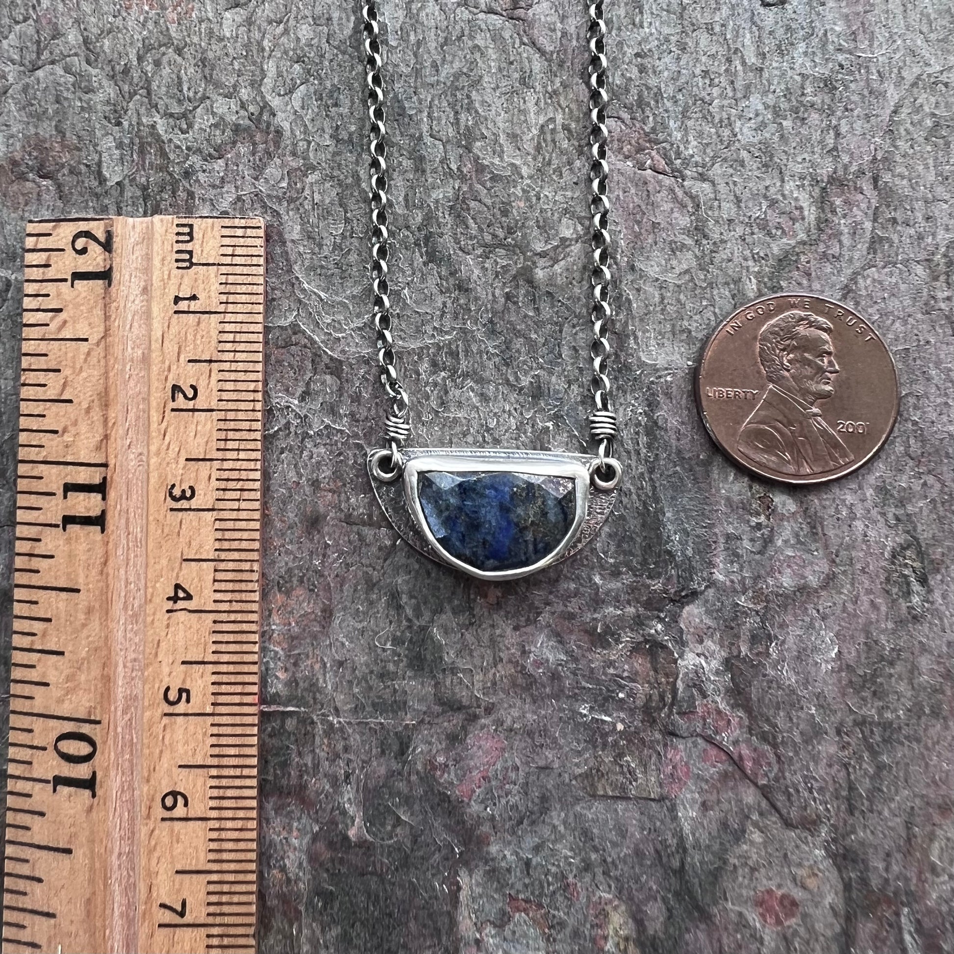 This pendant necklace was created from genuine blue Lapis Lazuli and sterling silver. The natural stone cabochon is framed in hammered sterling silver. I have made this semicircle pendant by sawing, soldering, texturing, and finishing the design entirely by hand. The pendant is suspended along a sterling silver chain. The necklace features a 3-inch extender which allows it to be slightly adjustable between 16-19" in total length including all parts of chain, clasp, and pendant. The silver has been oxidized and polished to create an antique patina finish.