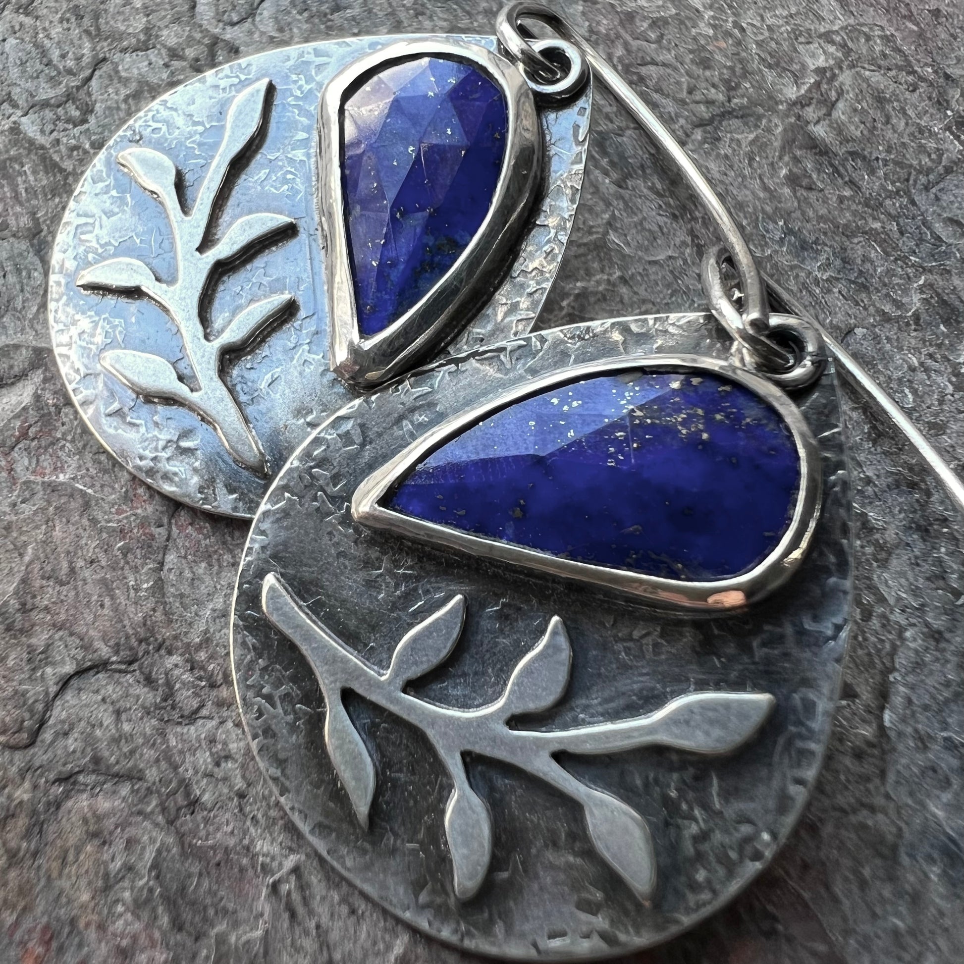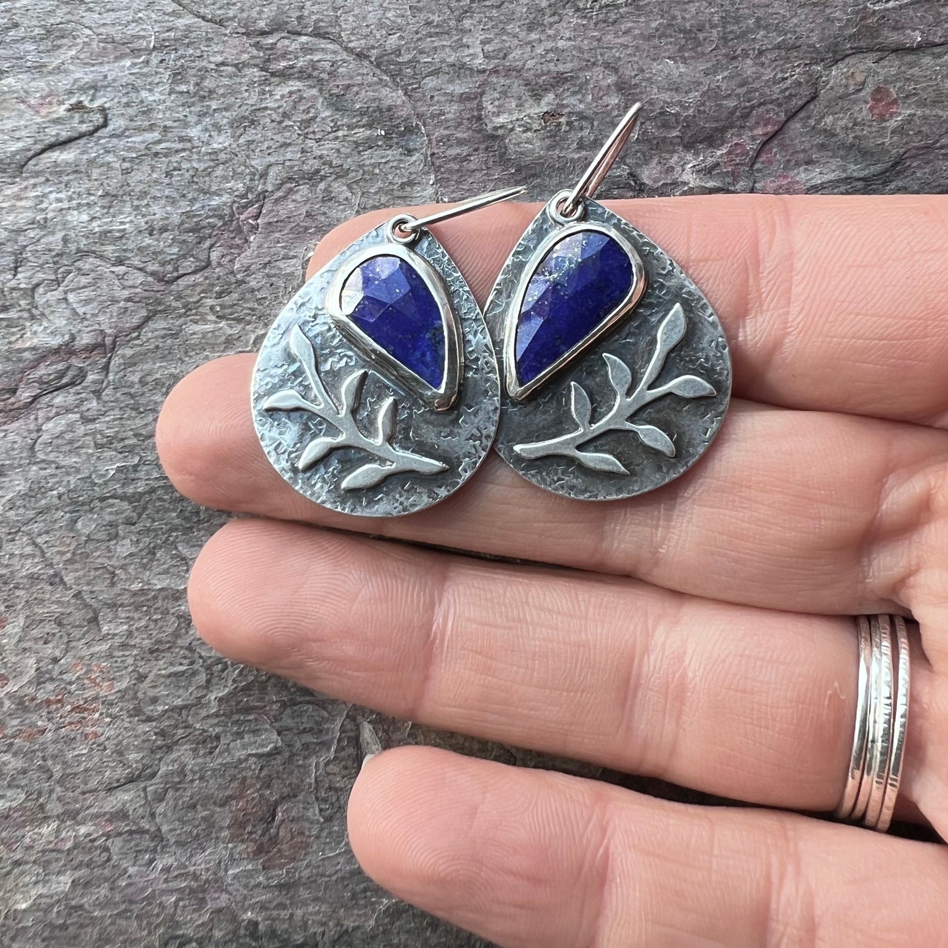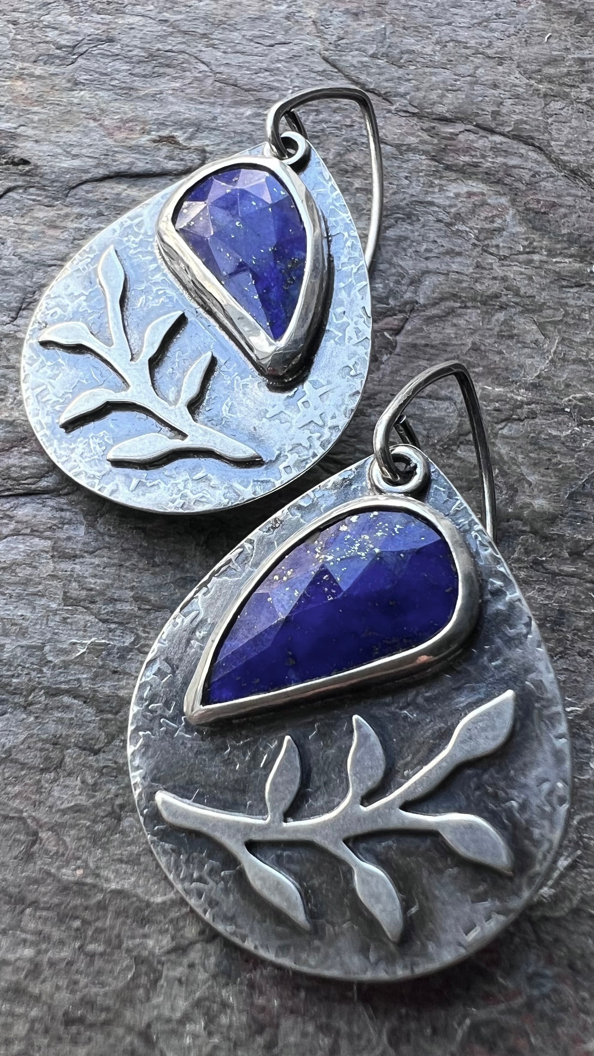 These earrings are created from genuine blue Lapis Lazuli cabochons and sterling silver teardrops. The natural stones are accented by silver branches which I have cut by hand using my jeweler's saw. These one of of a kind earrings have been formed, cut, soldered, and textured by hand. The drops dangle from handmade sterling silver earwires. The silver has been oxidized and polished to create an antique patina finish.