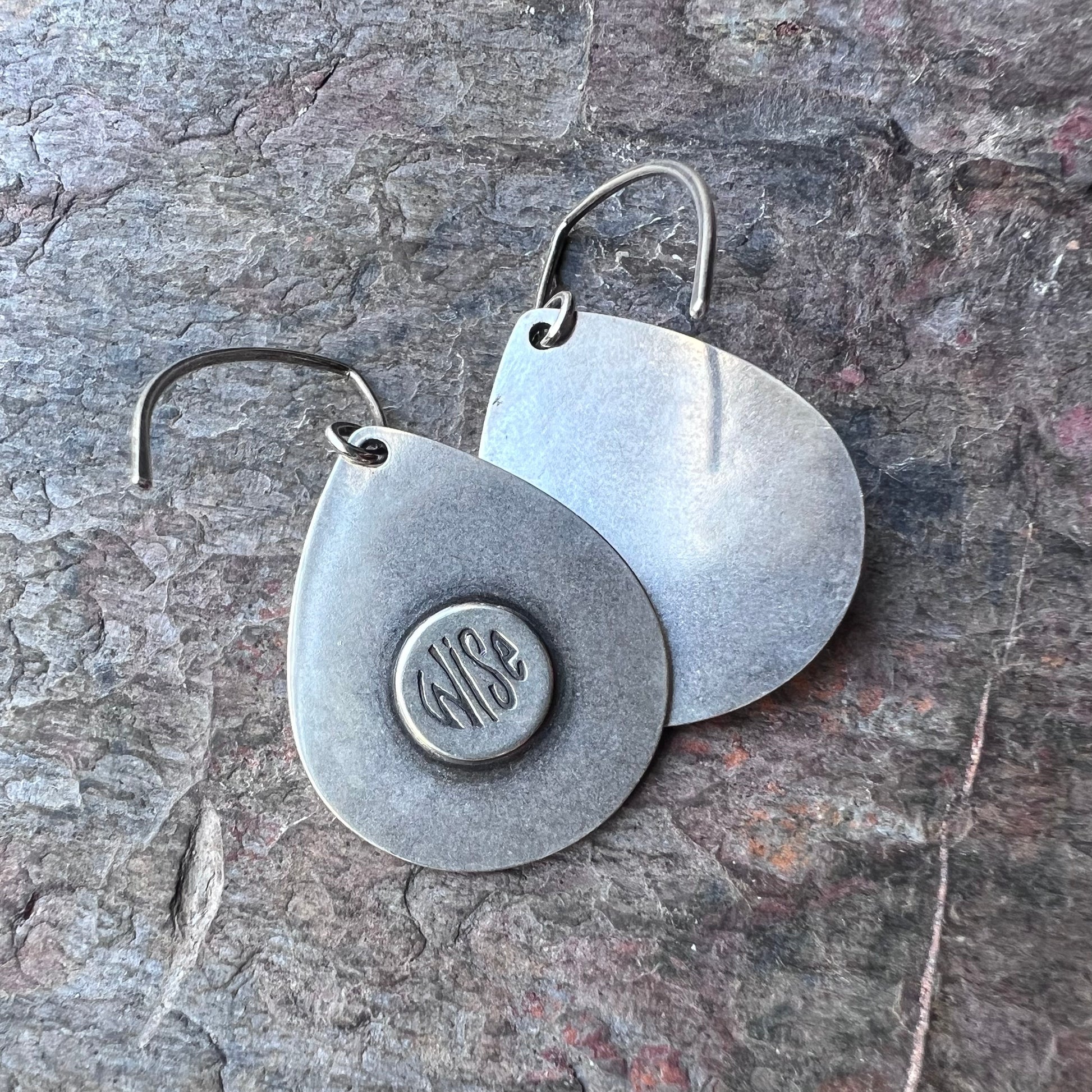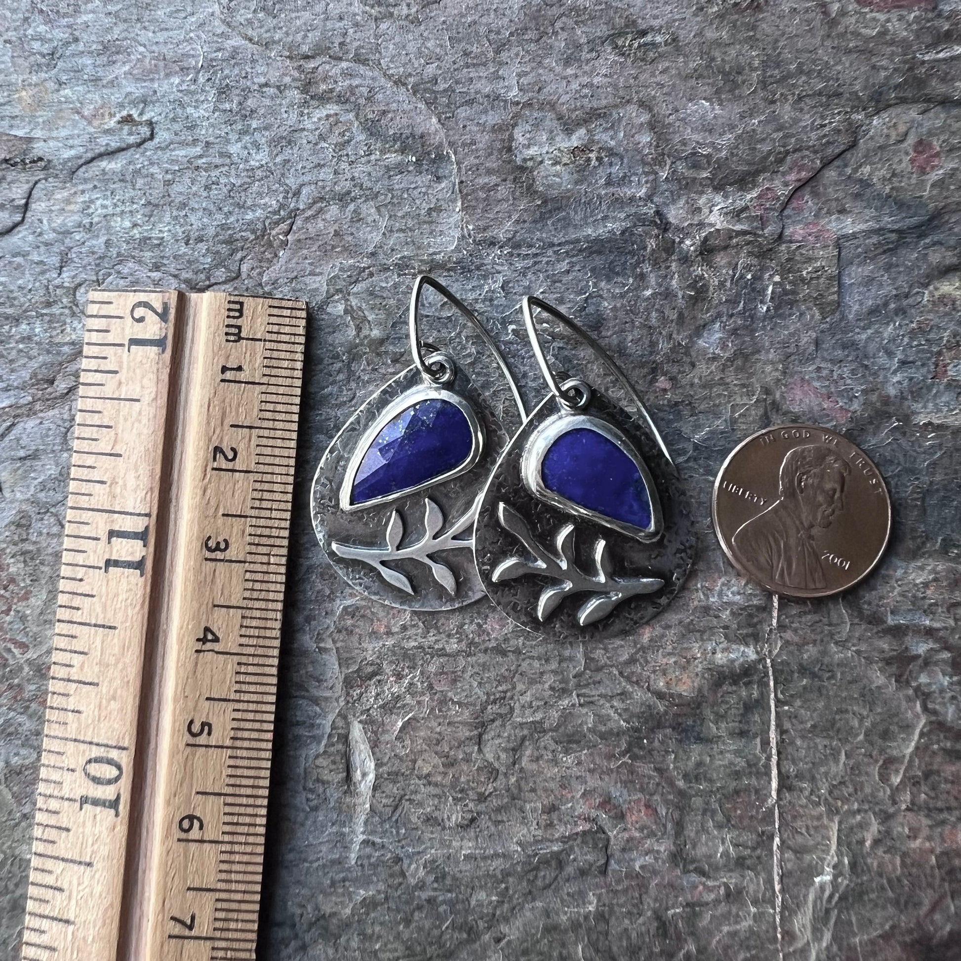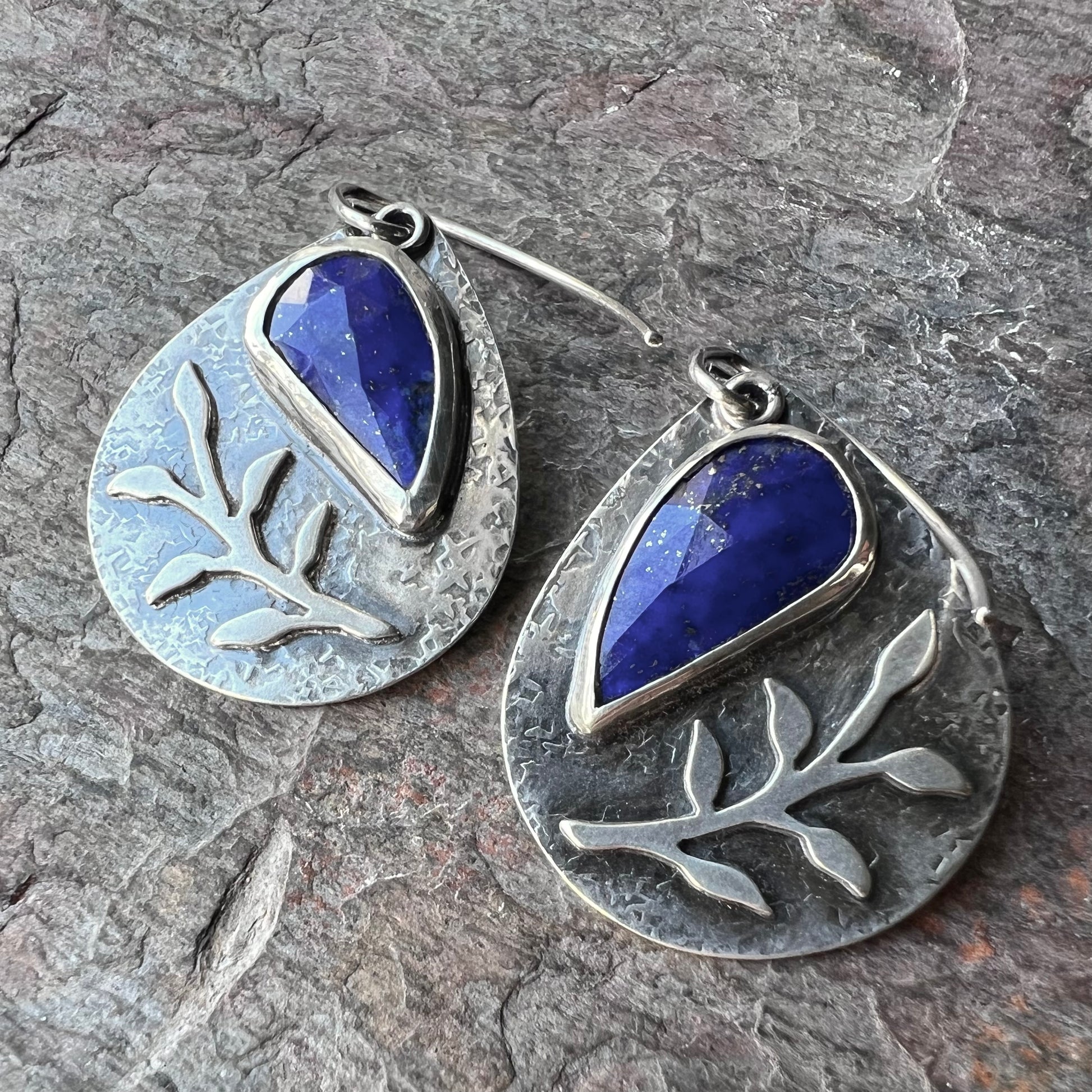 These earrings are created from genuine blue Lapis Lazuli cabochons and sterling silver teardrops. The natural stones are accented by silver branches which I have cut by hand using my jeweler's saw. These one of of a kind earrings have been formed, cut, soldered, and textured by hand. The drops dangle from handmade sterling silver earwires. The silver has been oxidized and polished to create an antique patina finish.