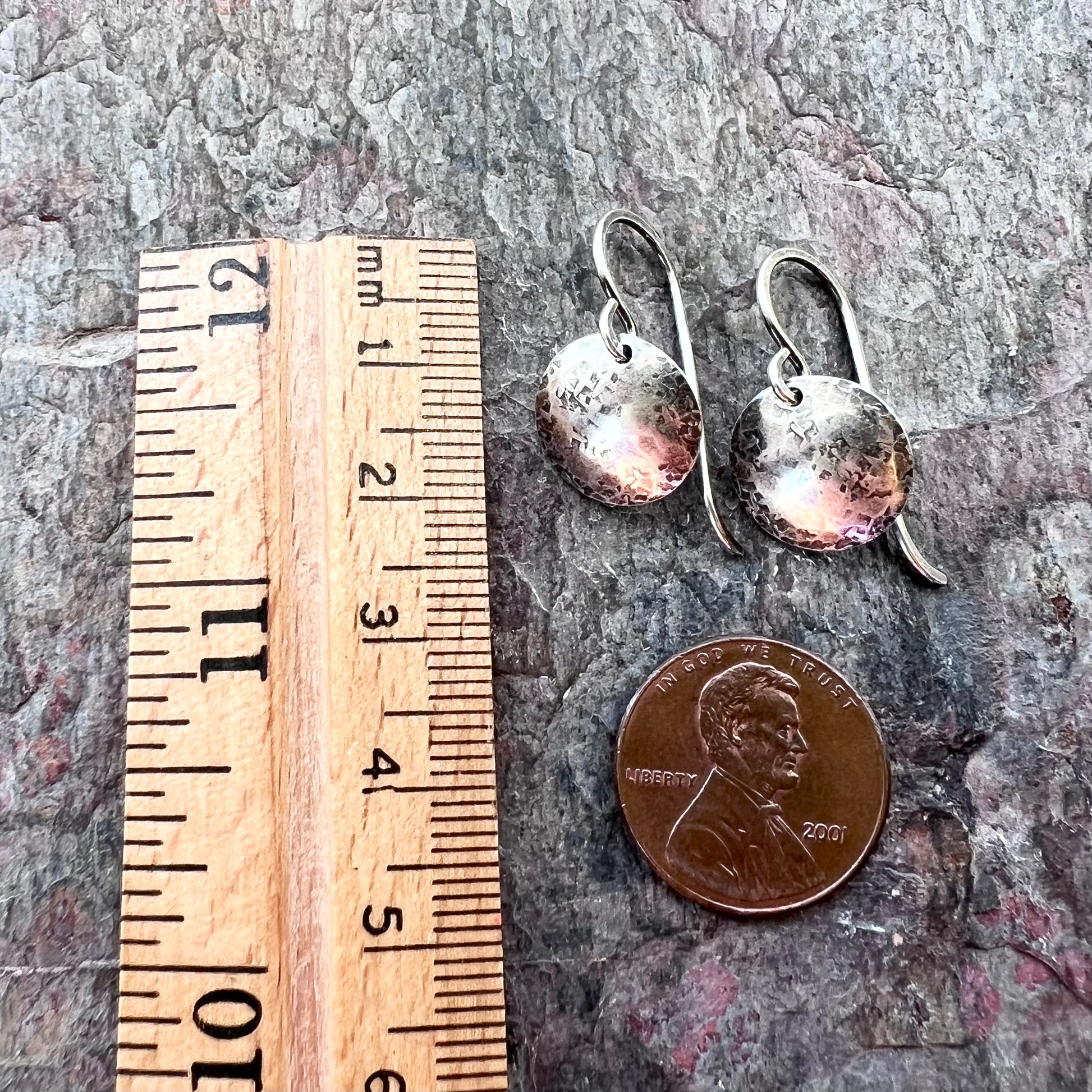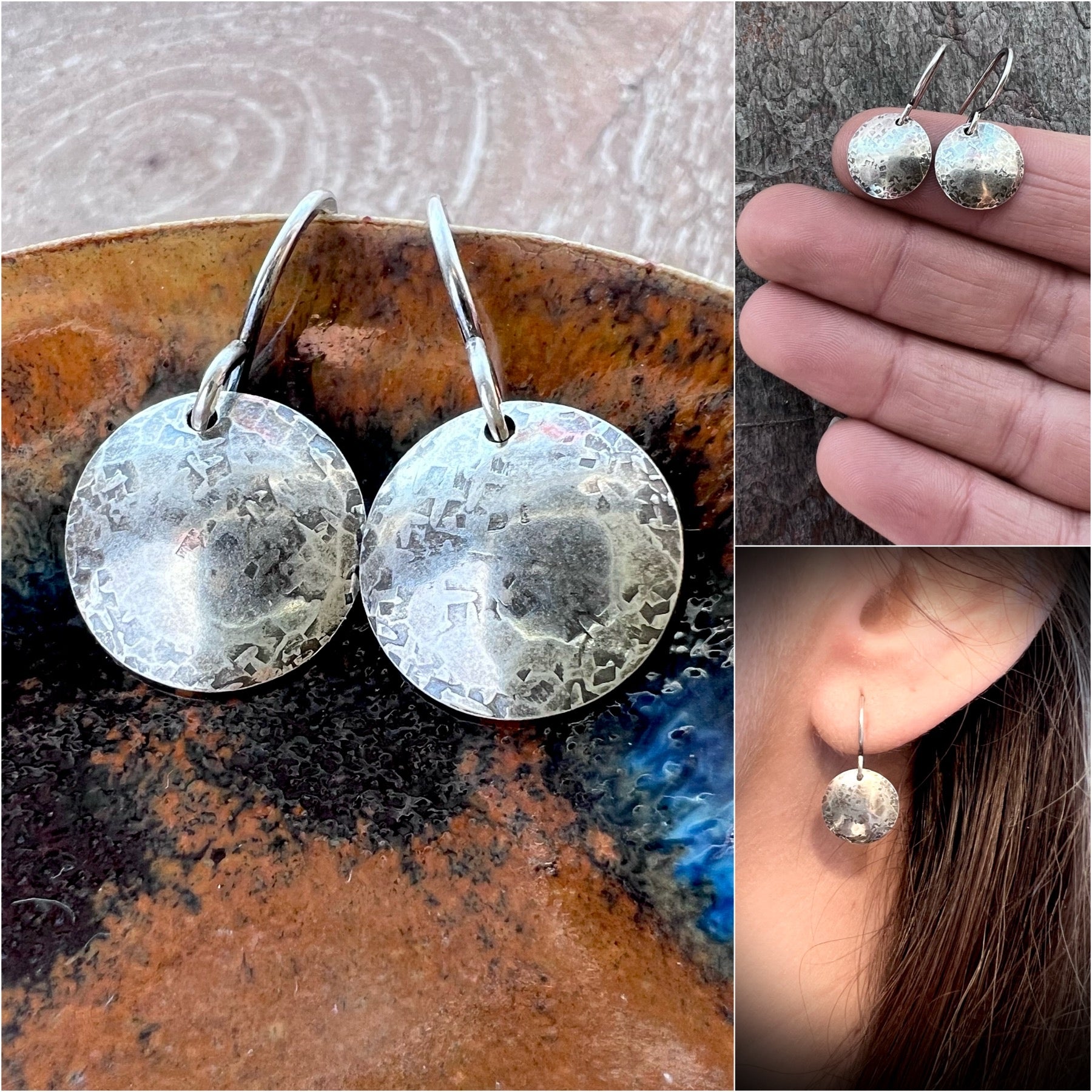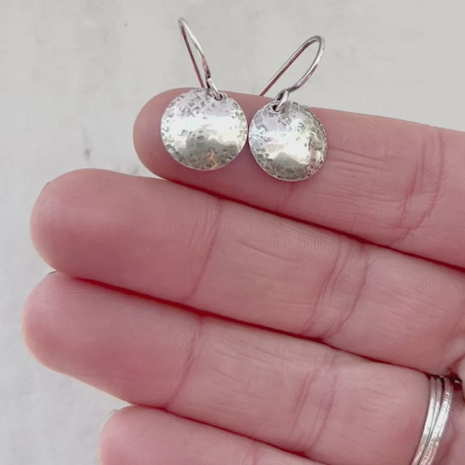 These dangle earrings are made entirely from solid sterling silver. I have carefully cut two circular discs from a sheet of sterling silver. I then domed and hammered the silver with several different hammers to create the unique texture. These minimalist drops dangle from handmade sterling silver earwires. The silver has been oxidized and polished to create an antique patina finish.