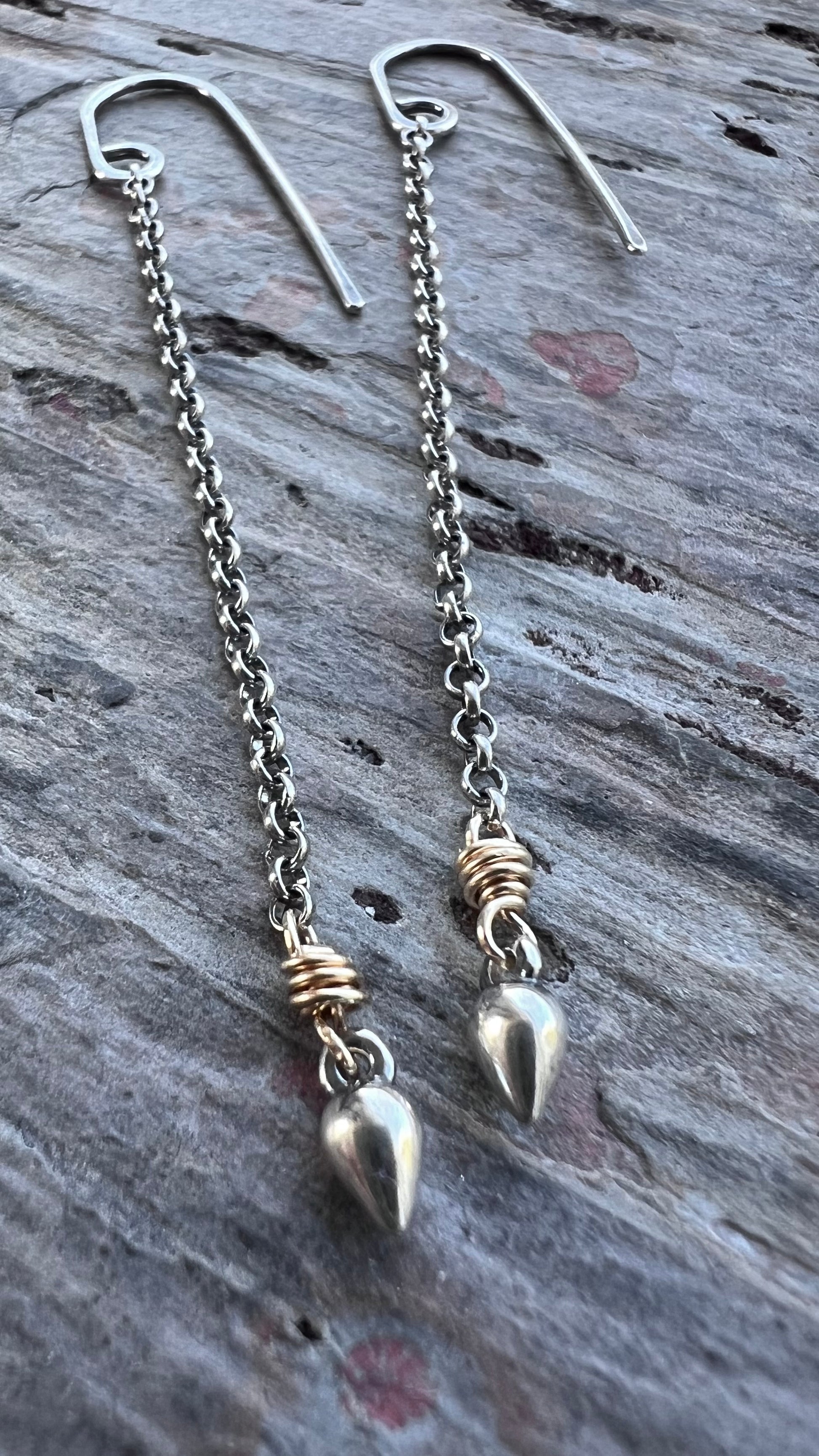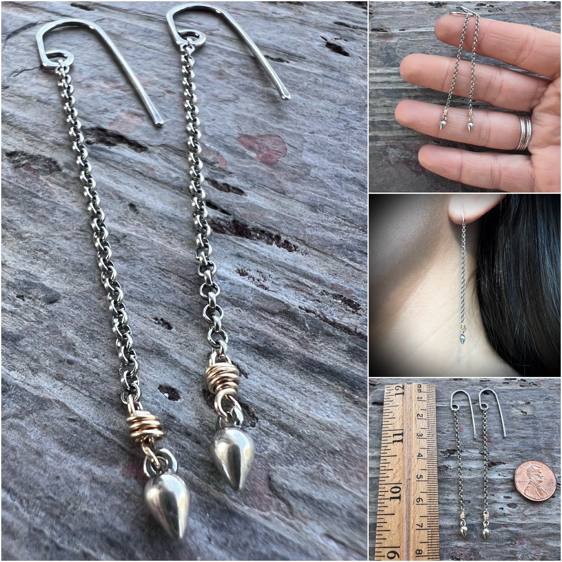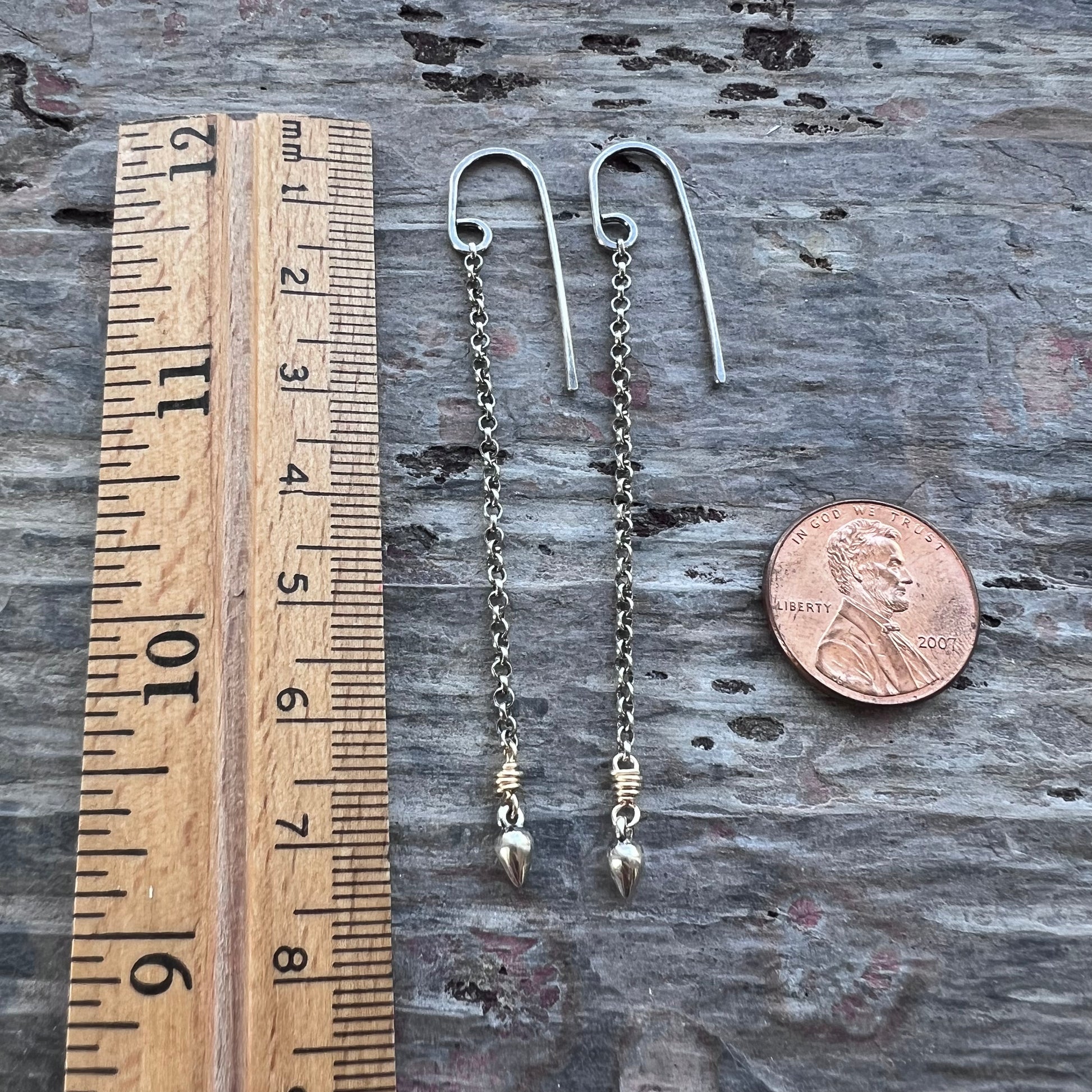 These long drop earrings are handmade from solid sterling silver and 14k goldfill. Two tiny spike charms dangle from sterling silver chains. I have accented the charms with 14k yellow goldfill wire. These long earrings are lightweight and comfortable to wear. The chains hang from handmade sterling silver earwires. The silver has been oxidized and polished to create an antique patina finish.