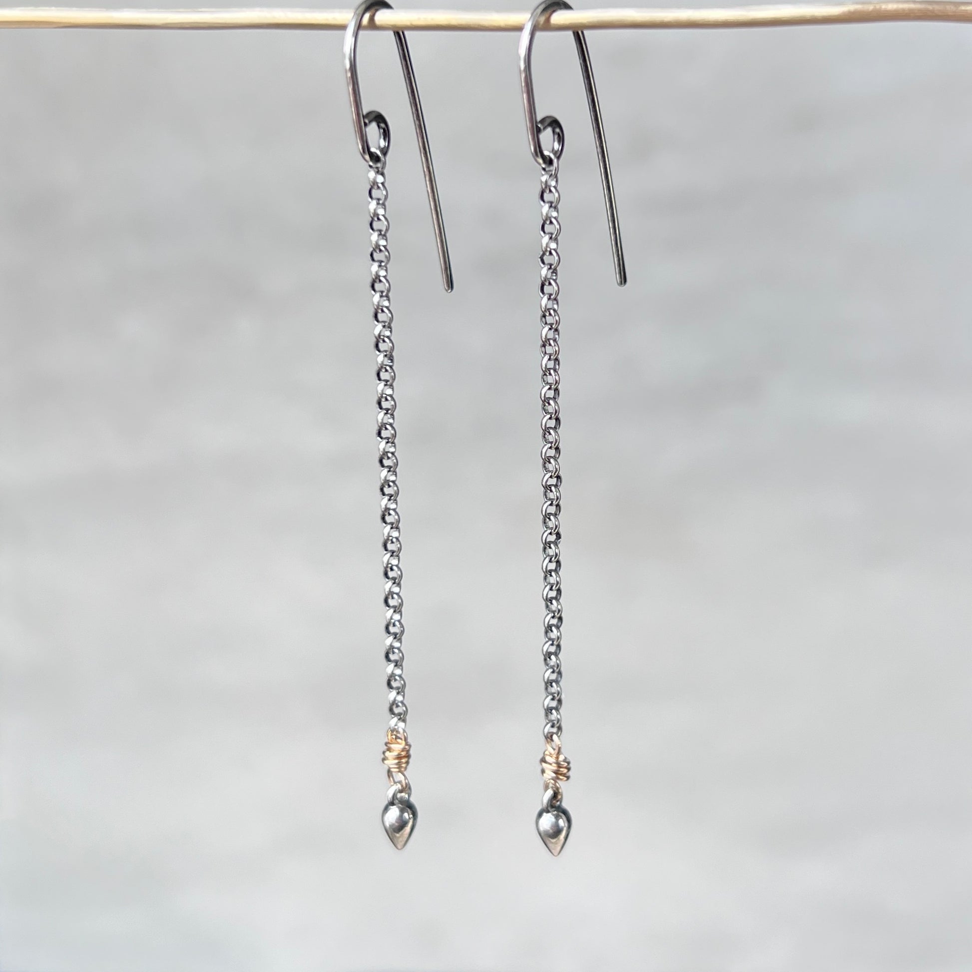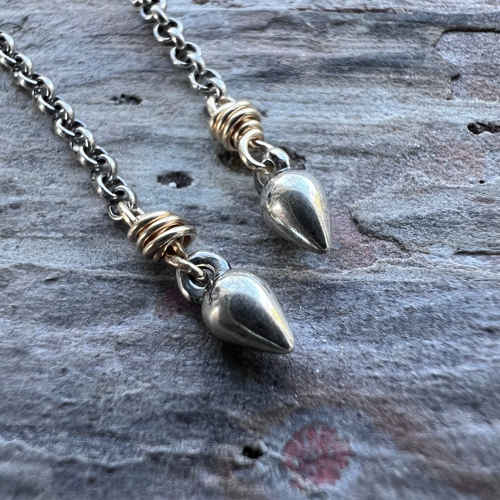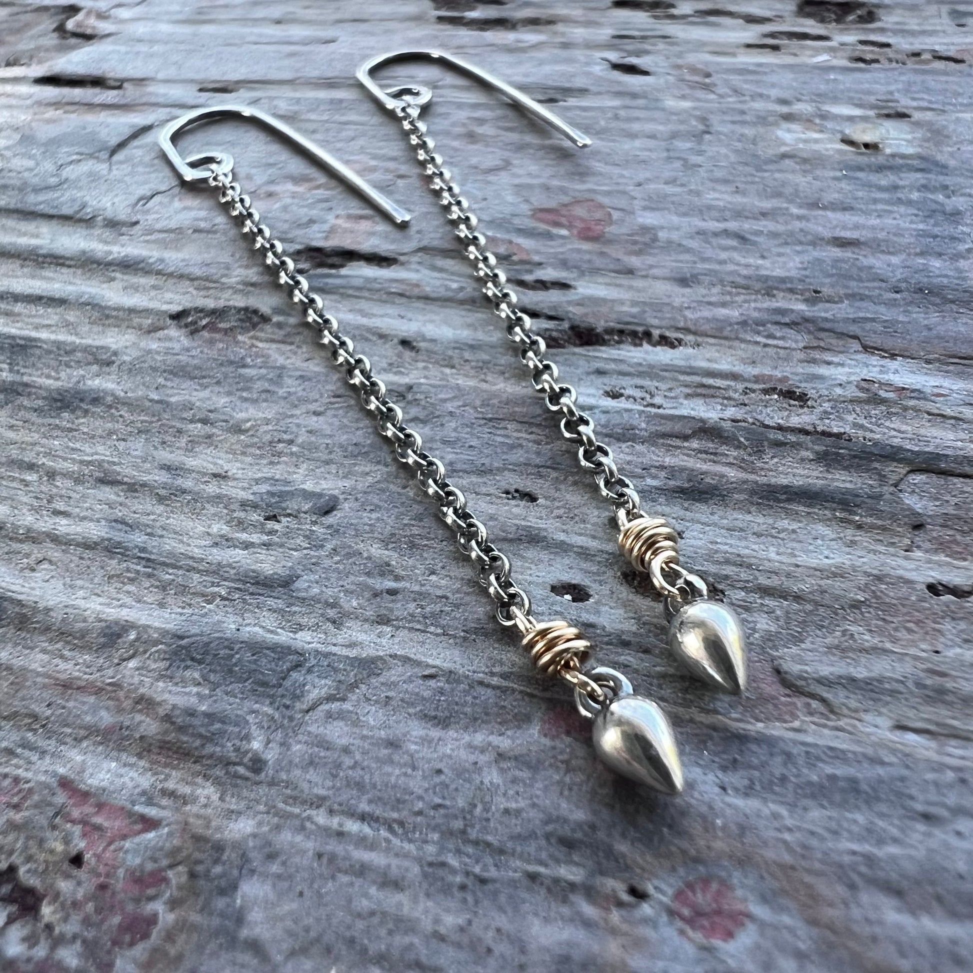 These long drop earrings are handmade from solid sterling silver and 14k goldfill. Two tiny spike charms dangle from sterling silver chains. I have accented the charms with 14k yellow goldfill wire. These long earrings are lightweight and comfortable to wear. The chains hang from handmade sterling silver earwires. The silver has been oxidized and polished to create an antique patina finish.