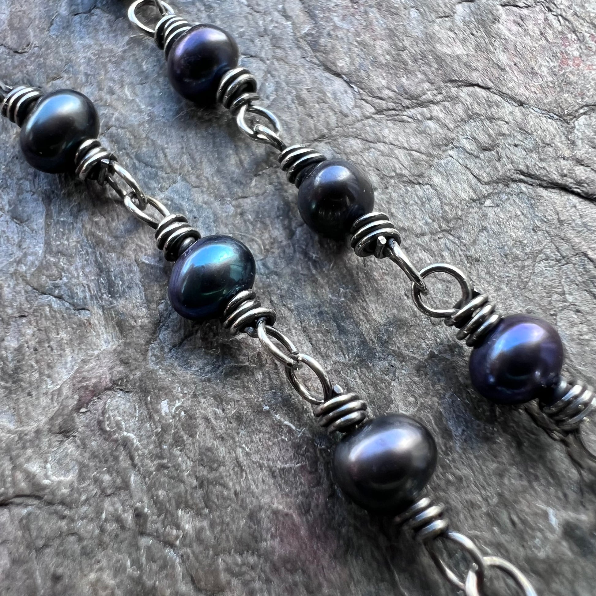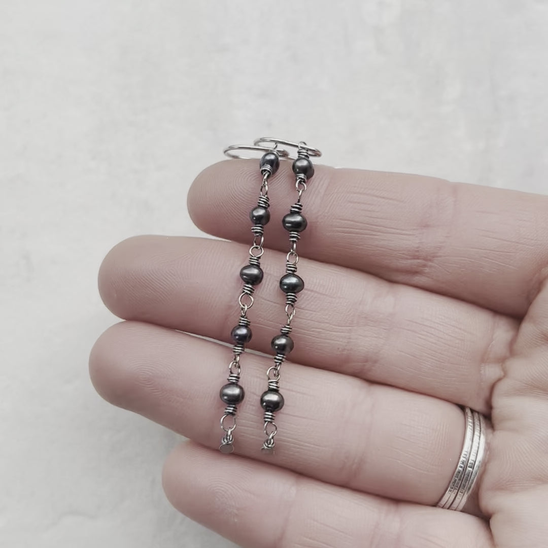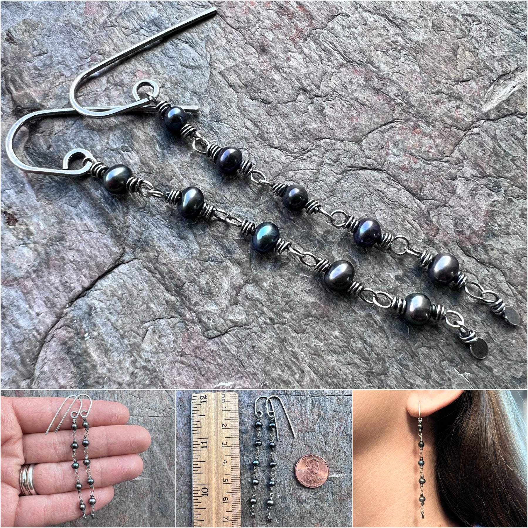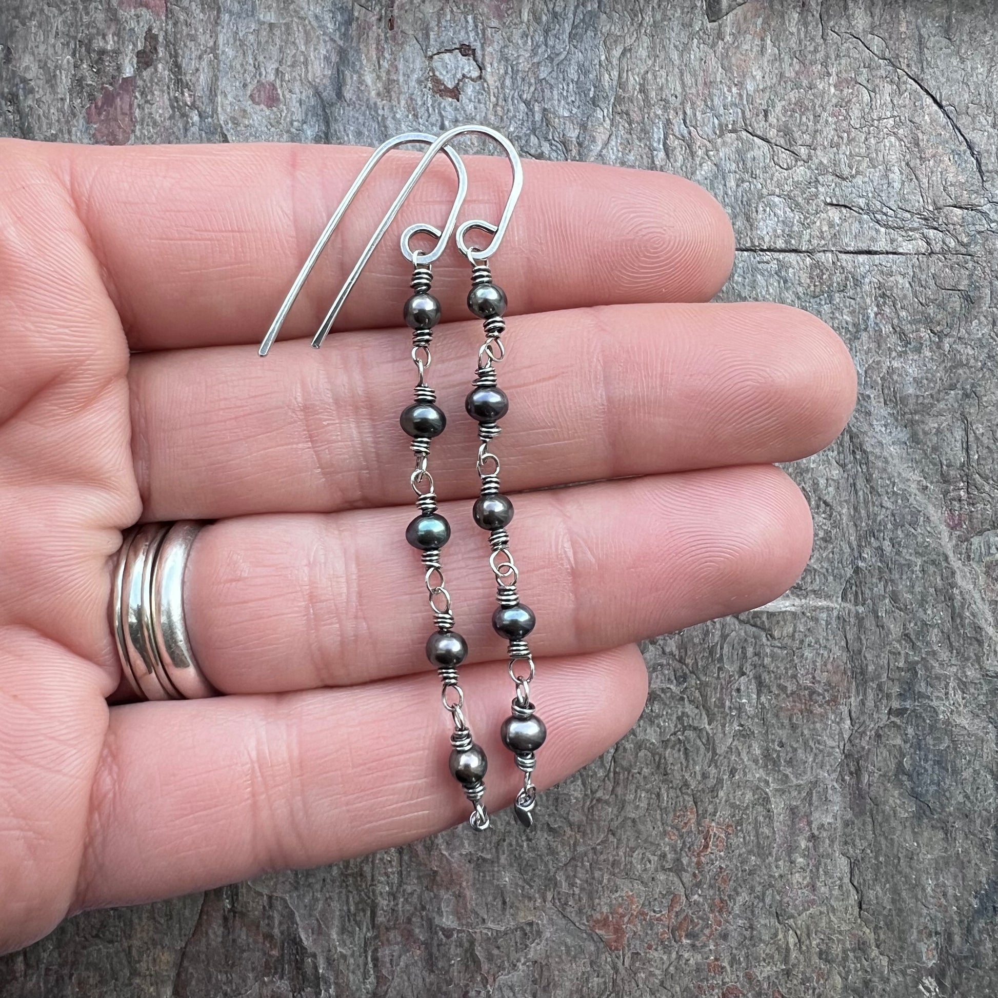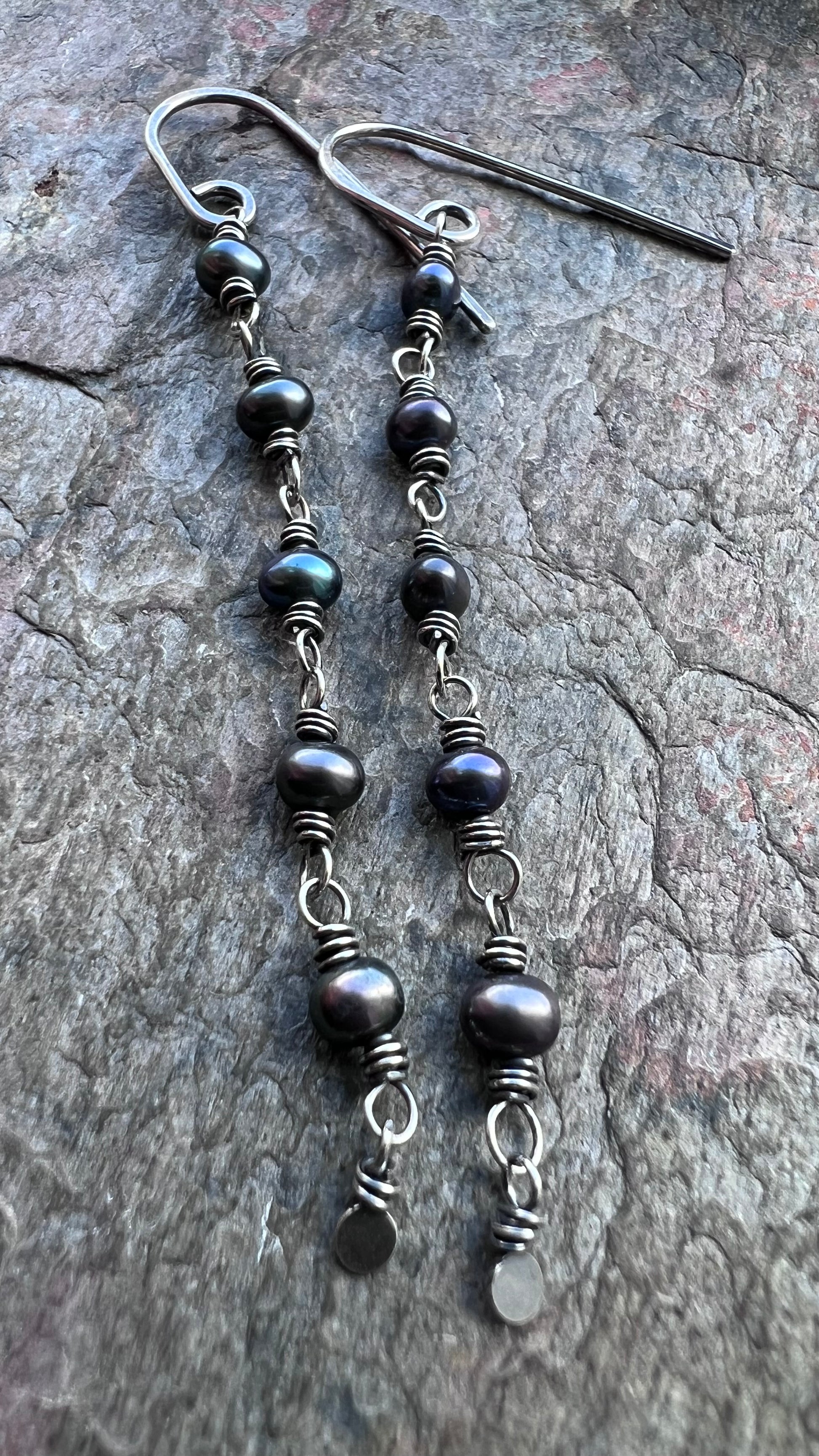 A set of ten tiny black pearls have been wrapped in sterling silver wire. The earrings dangle from handmade sterling silver earwires. The silver has been oxidized and polished to create an aged patina finish.