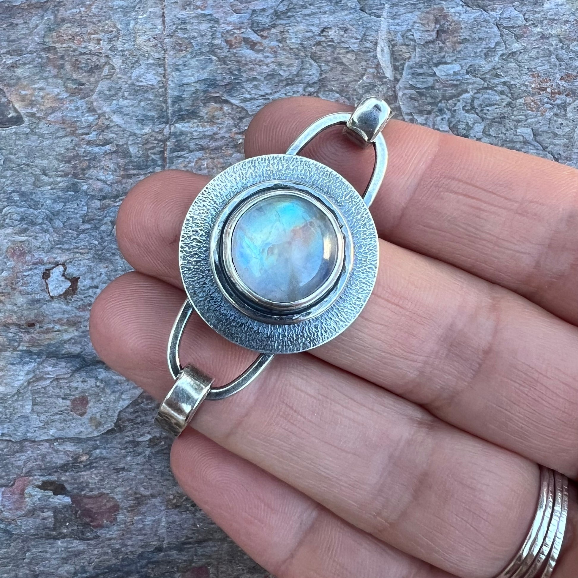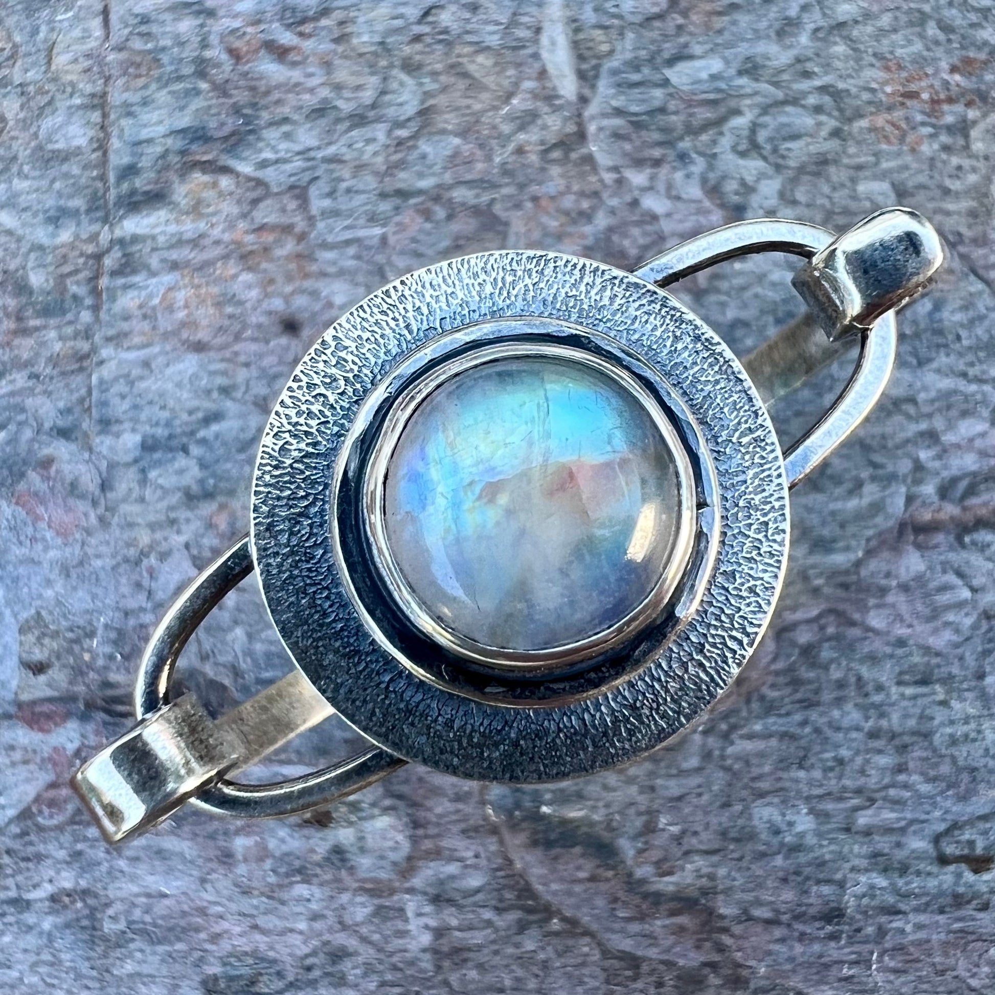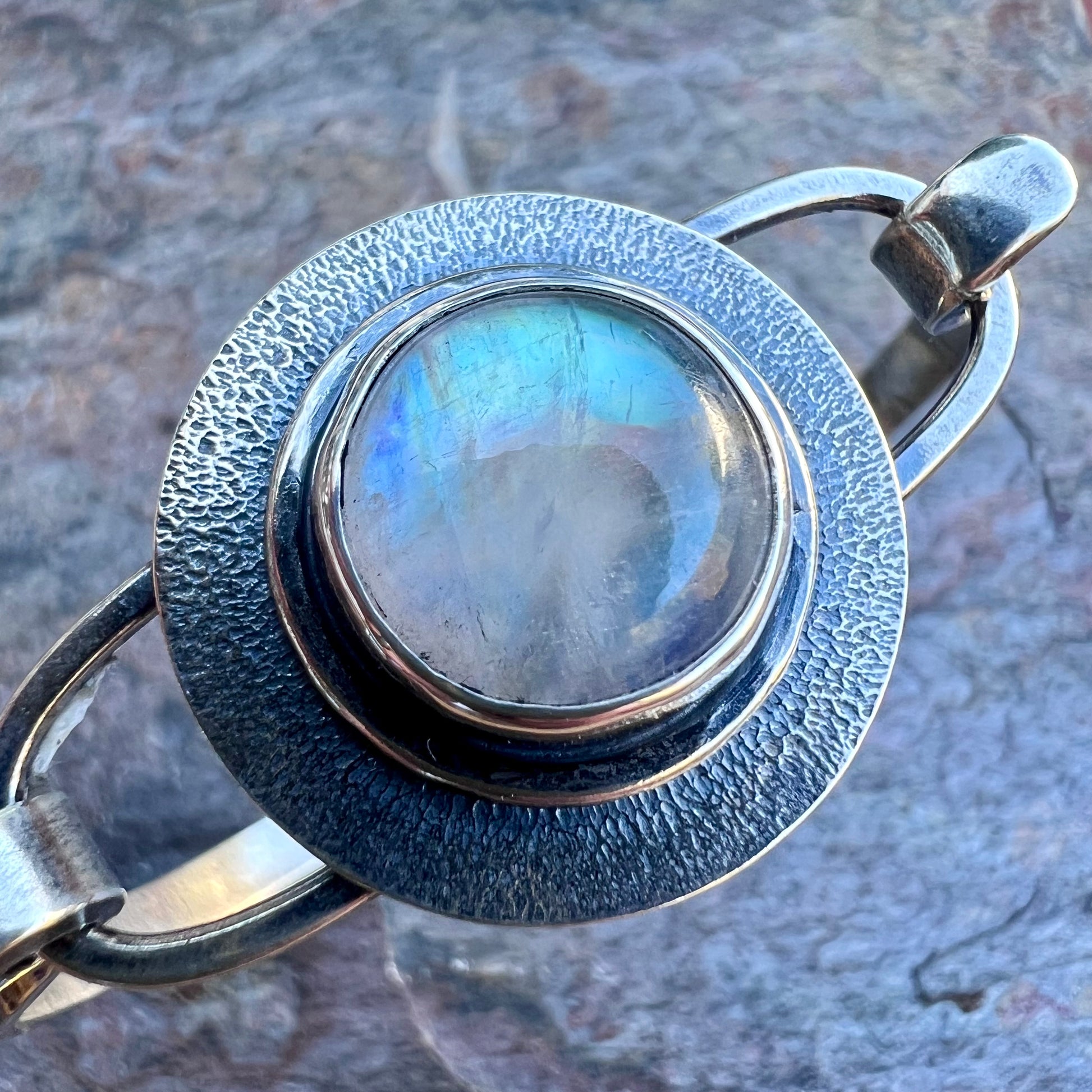 A genuine rainbow moonstone cabochon has been set in sterling and fine silver. I have made this one-of-a-kind bracelet by sawing, soldering, texturing, and finishing the design entirely by hand. The silver has been oxidized and polished to create a patina finish.