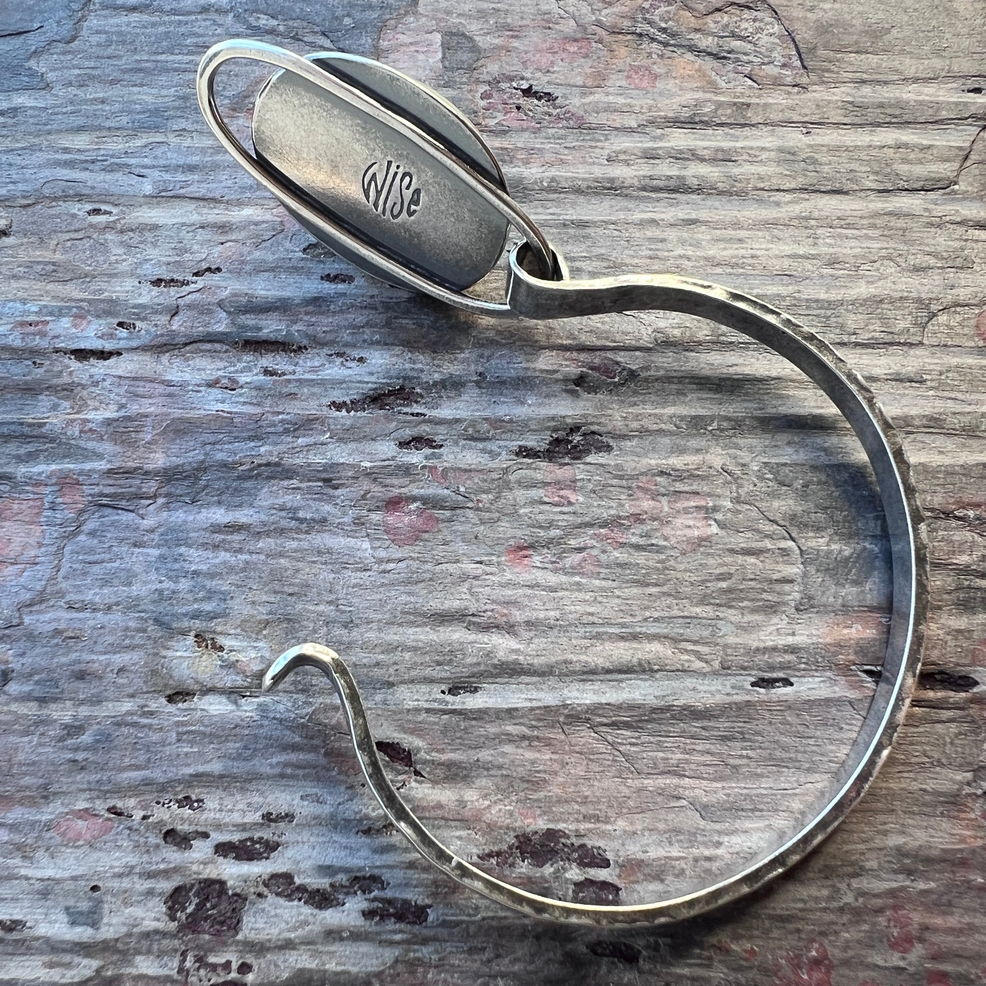 This artisan tension cuff bracelet is handmade from natural Rainbow Moonstone and solid sterling silver. A genuine rainbow moonstone cabochon has been set in a silver oval and features a hammered silver cuff. I have made this unique bracelet by sawing, soldering, texturing, and finishing the design entirely by hand. The silver has been oxidized and polished to create an antique patina finish.