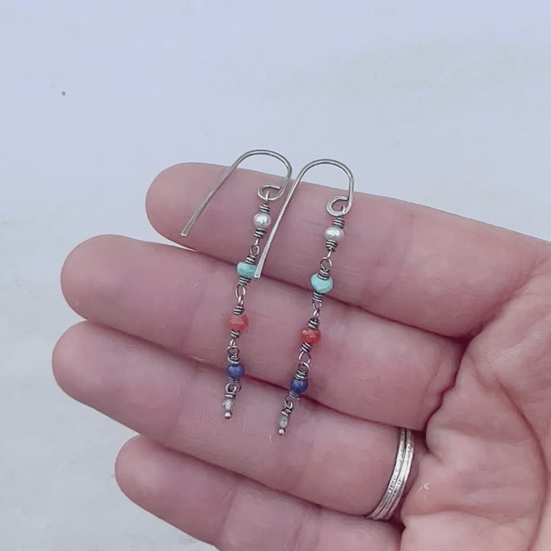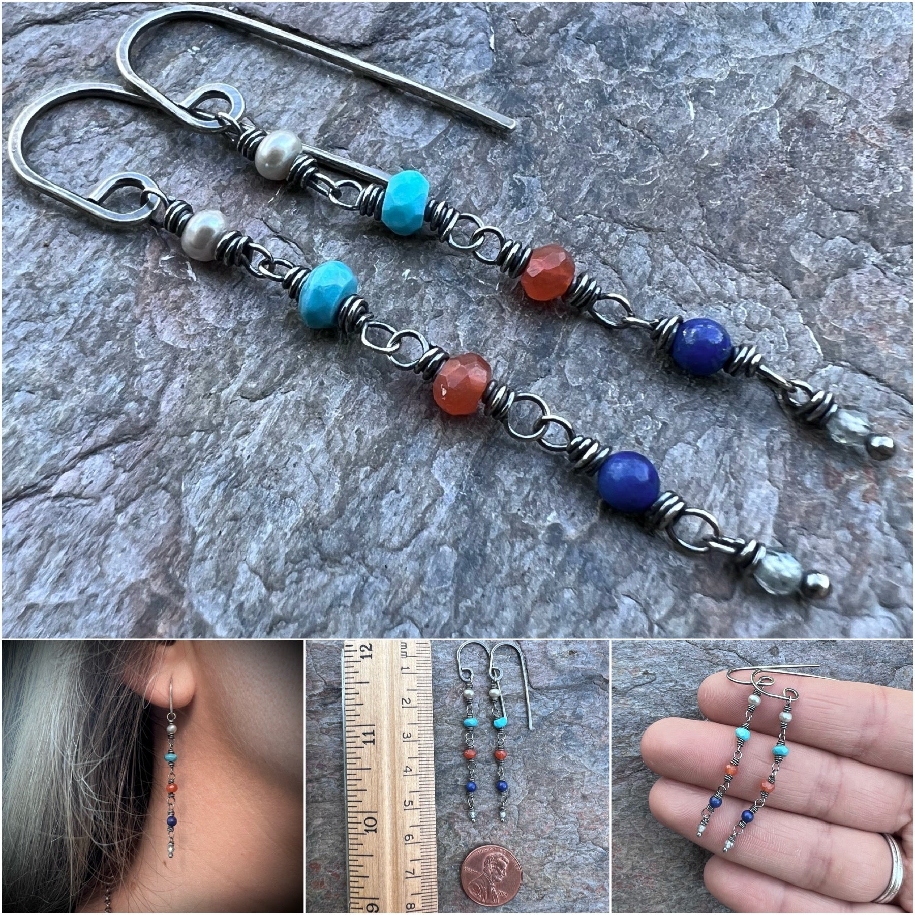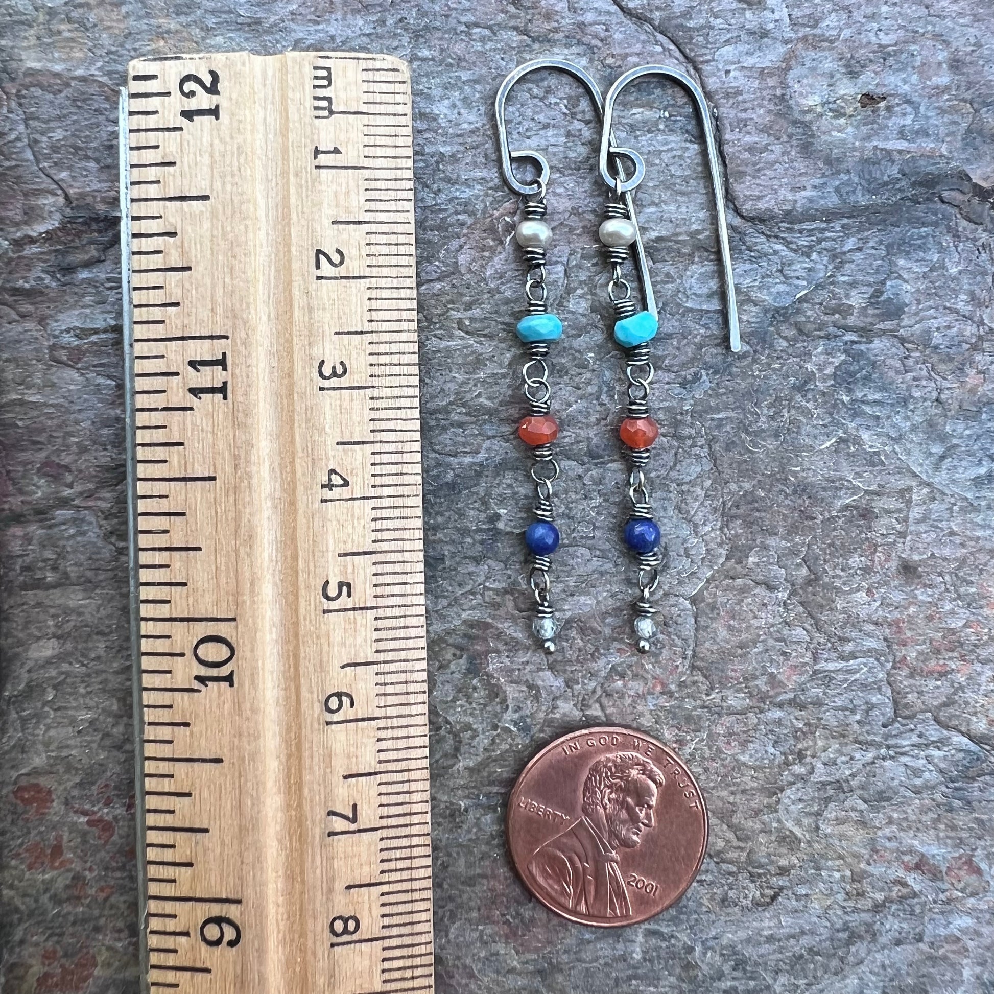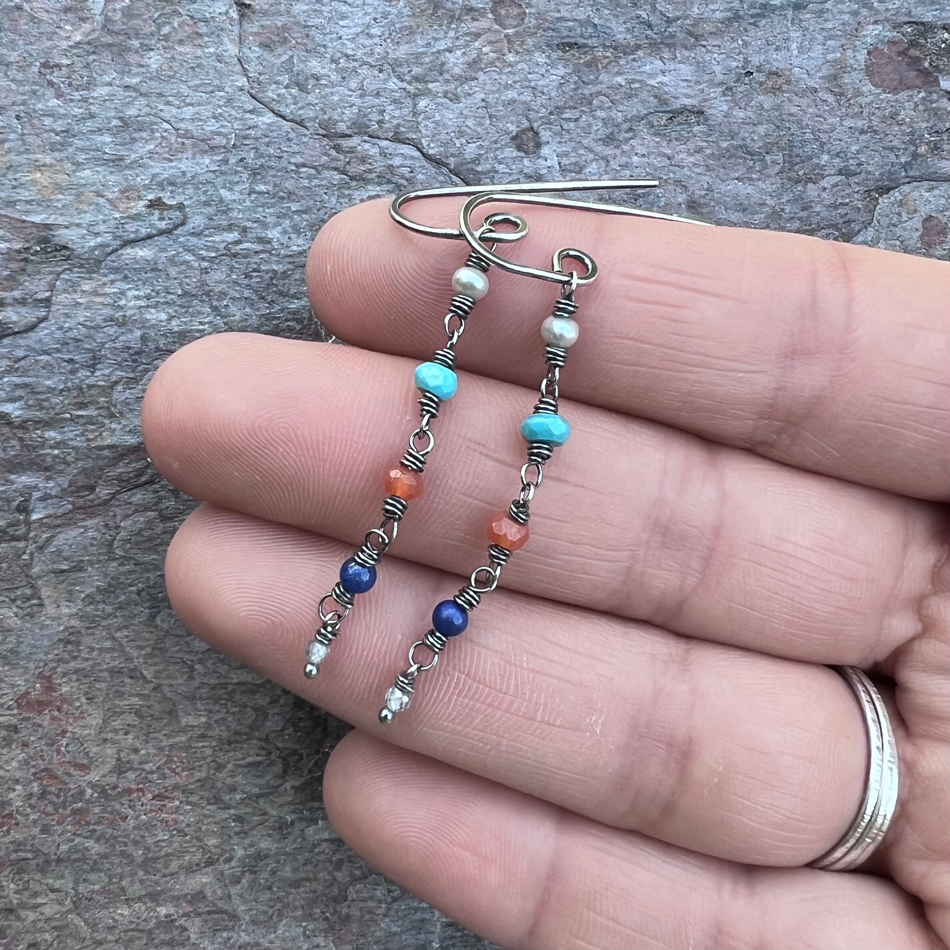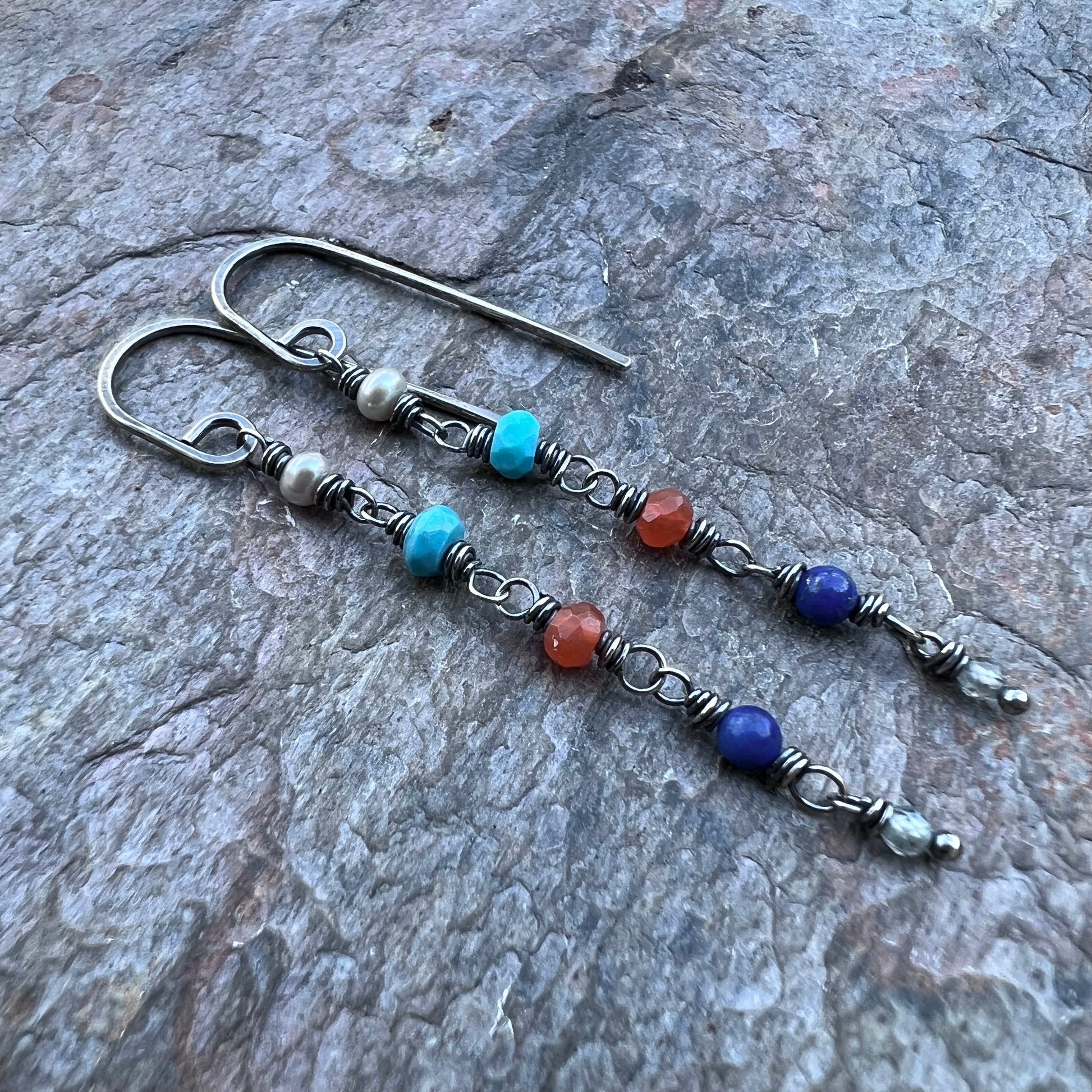 A set of ten tiny gems have been wrapped in sterling silver wire. The earrings feature genuine pearl, turquoise, carnelian, lapis lazuli, and zircon gems. The earrings dangle from handmade sterling silver earwires. The silver has been oxidized and polished to create an aged patina finish.