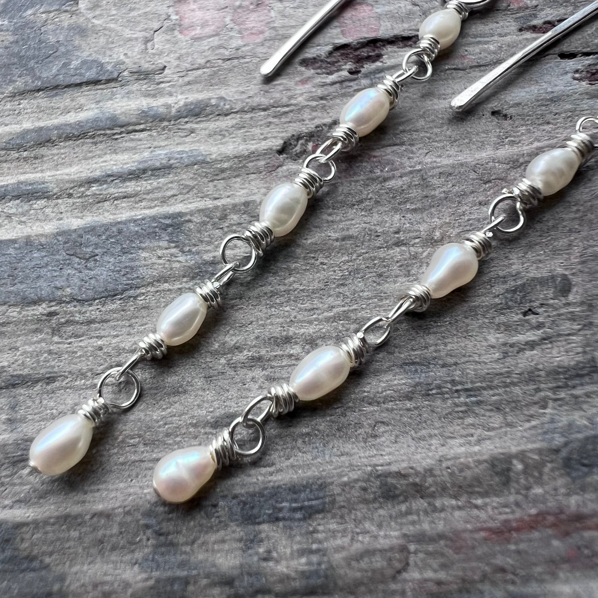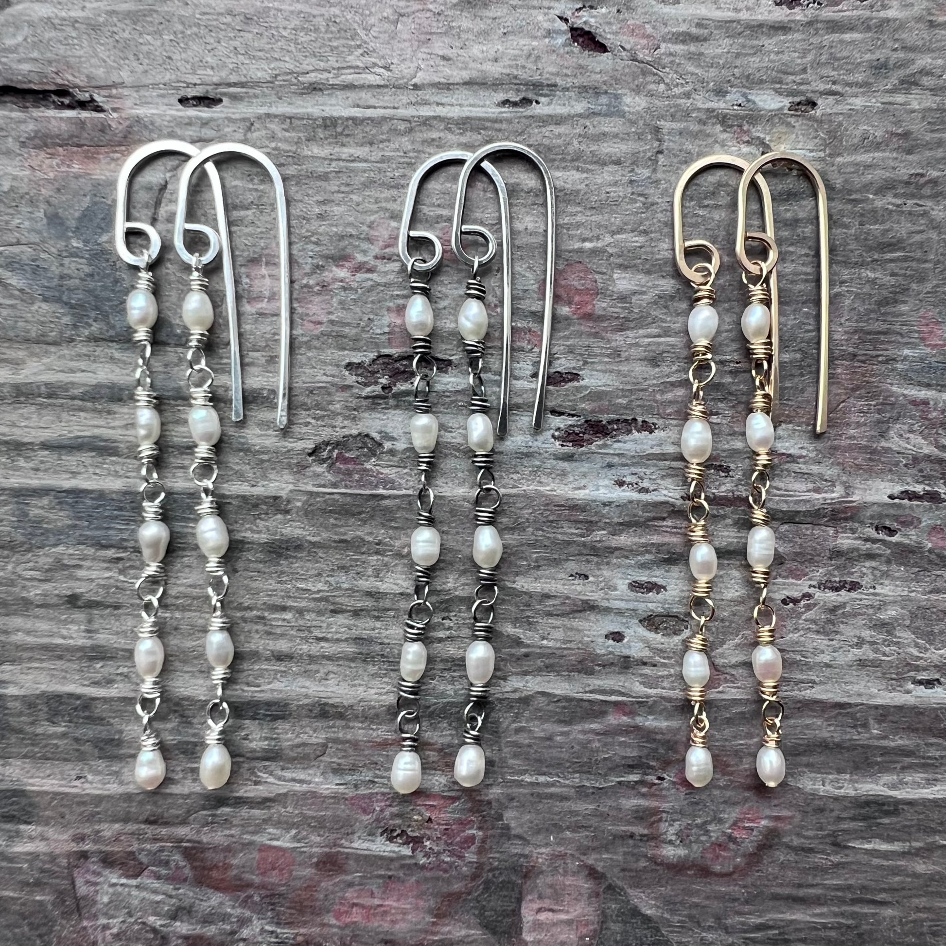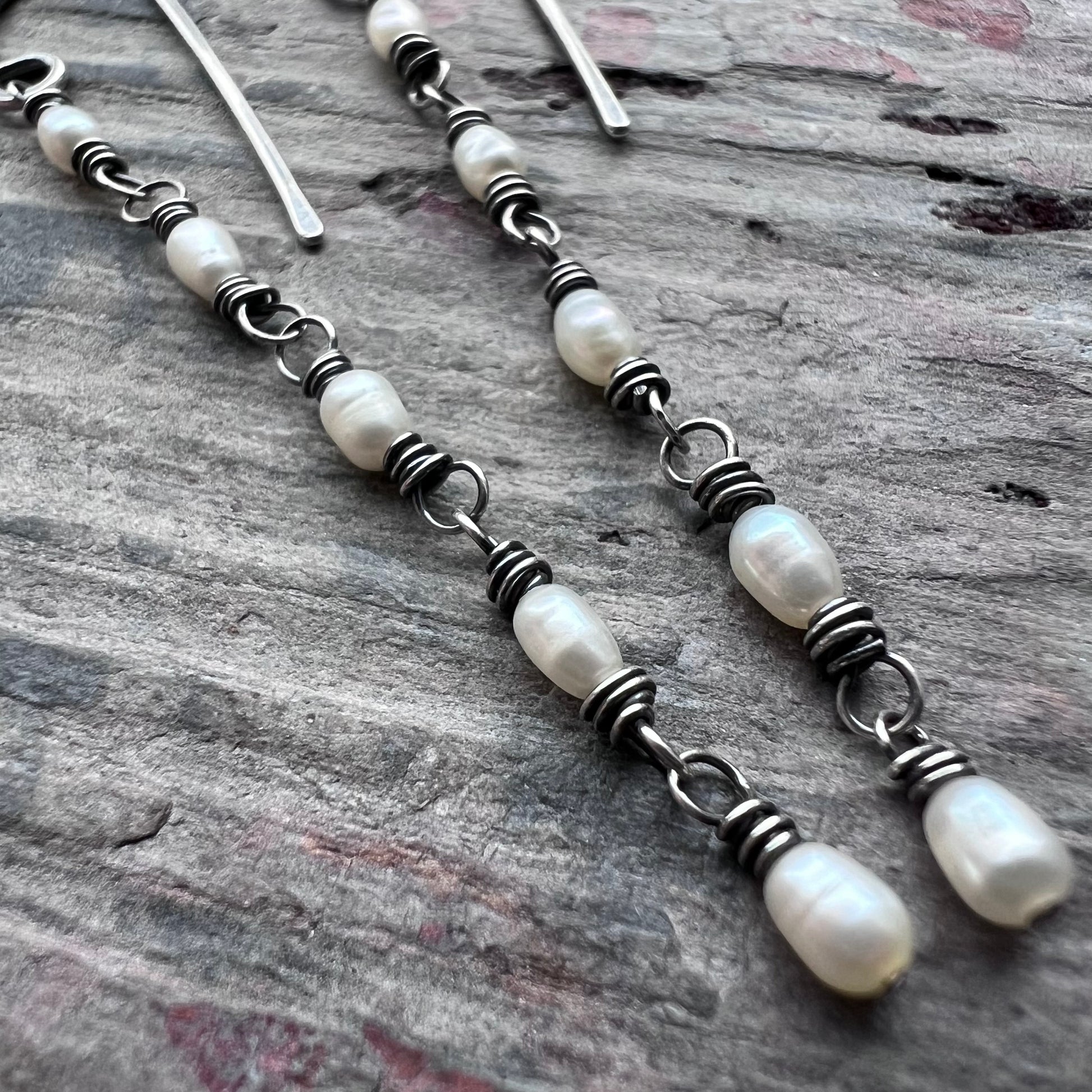 The long dangle earrings are handmade from genuine freshwater pearls and are available in either bright sterling silver, patina sterling silver, or 14k yellow goldfill. I have carefully wrapped a set of ten tiny white pearls in wire. The earrings dangle from either sterling silver or 14k goldfill handmade earwires.