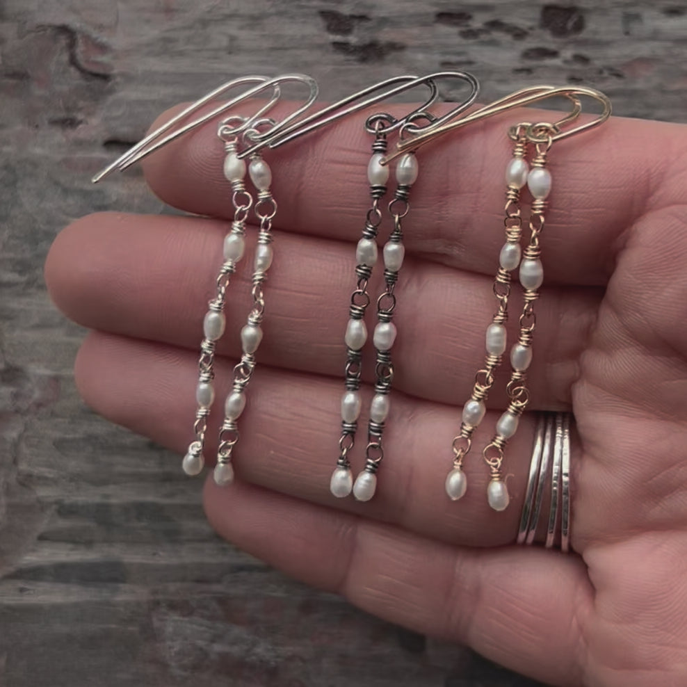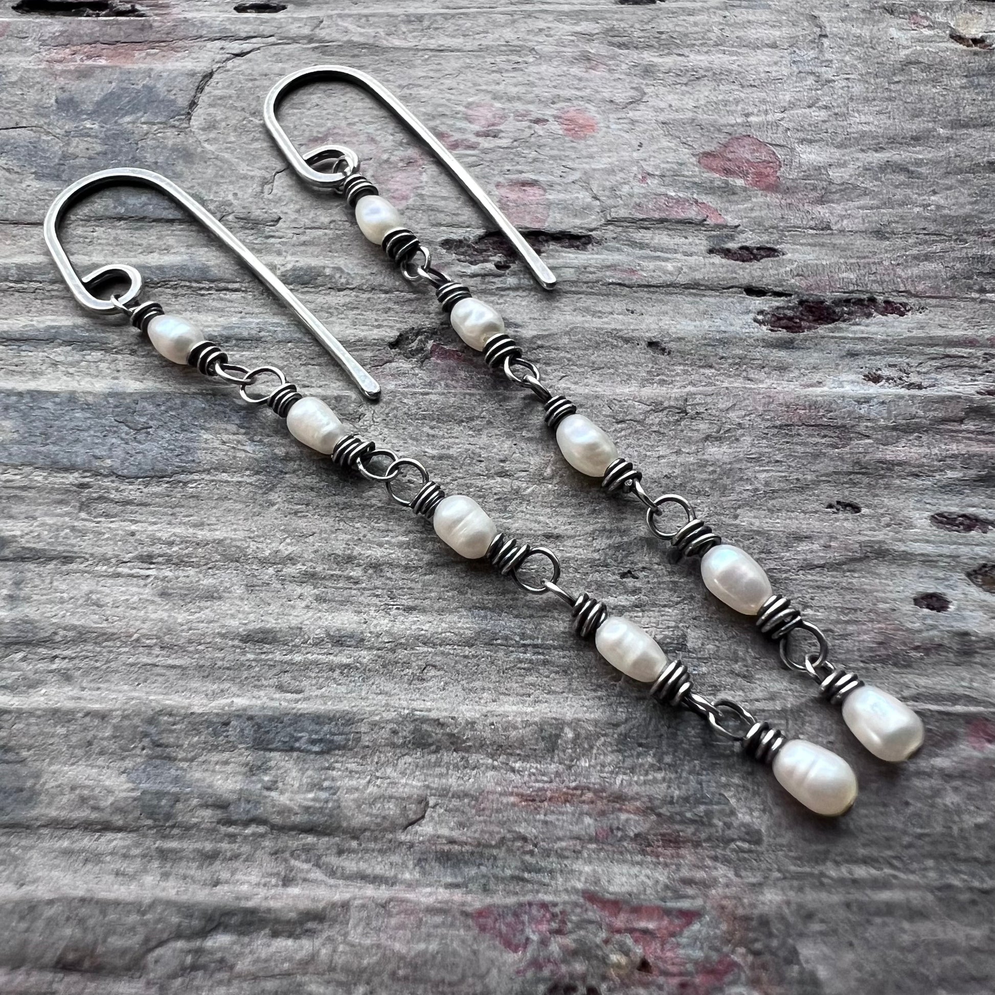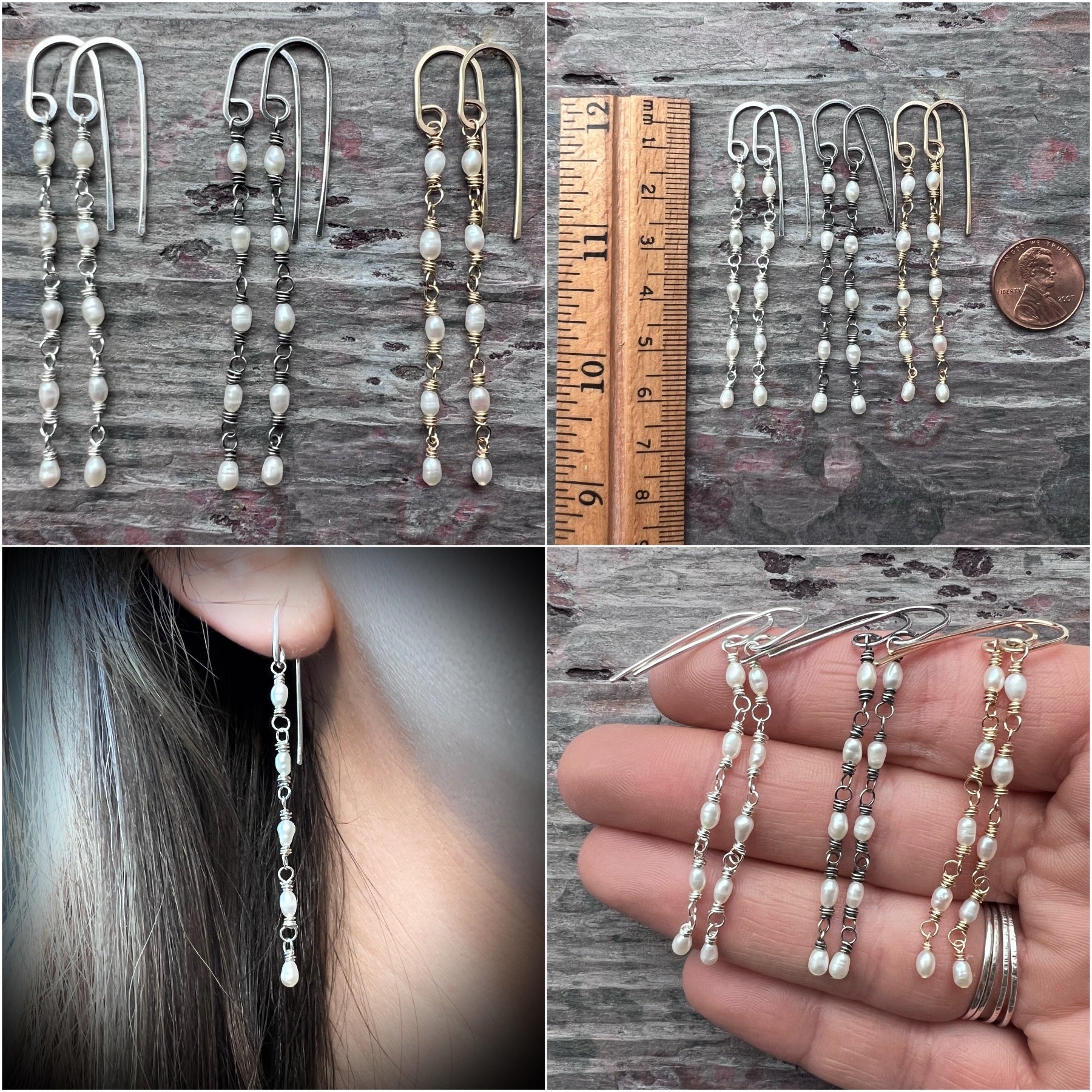 The long dangle earrings are handmade from genuine freshwater pearls and are available in either bright sterling silver, patina sterling silver, or 14k yellow goldfill. I have carefully wrapped a set of ten tiny white pearls in wire. The earrings dangle from either sterling silver or 14k goldfill handmade earwires.