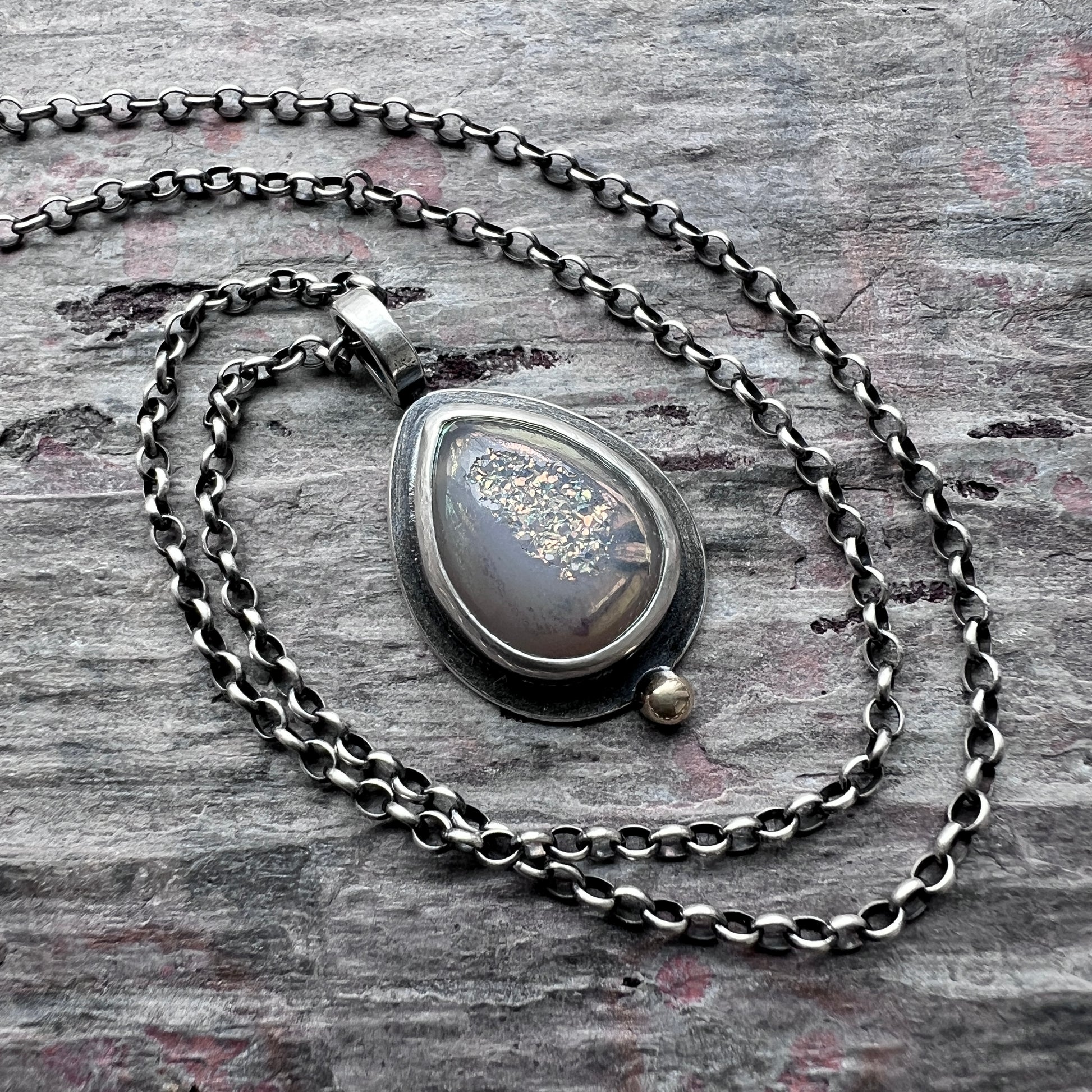 This pendant necklace is handmade from sterling silver and a raw druzy teardrop. The natural stone is framed with a border of silver and accented by a small gold granule made from golden jeweler's brass. I have made this unique pendant by sawing, soldering, and finishing the design entirely by hand. The silver has been oxidized and polished to create an antique patina finish.