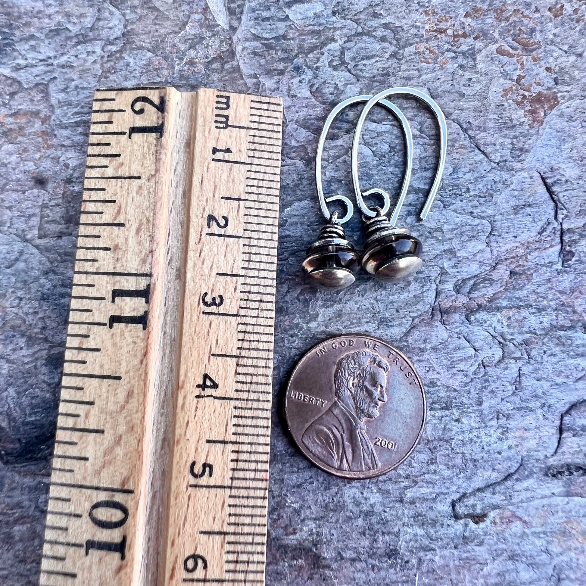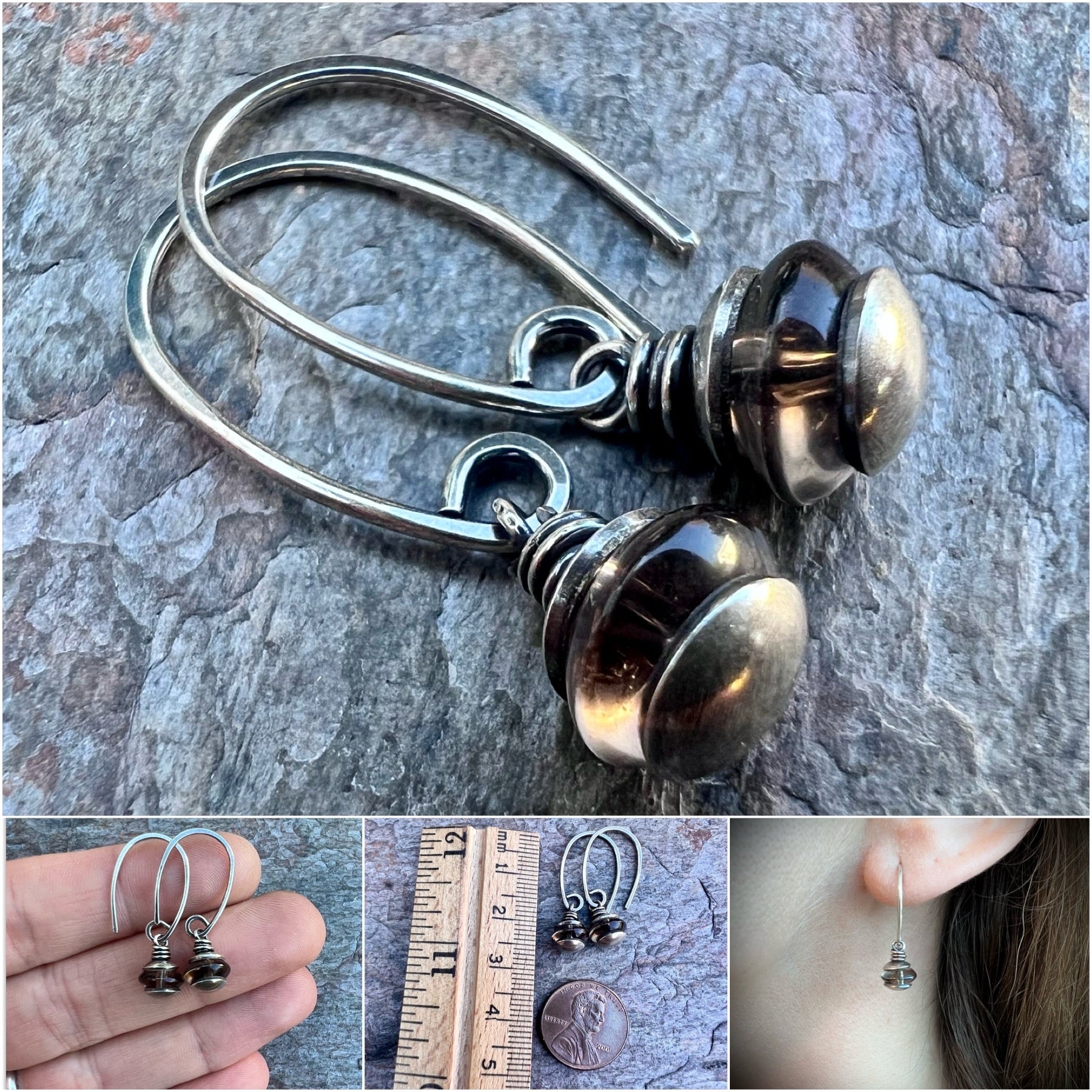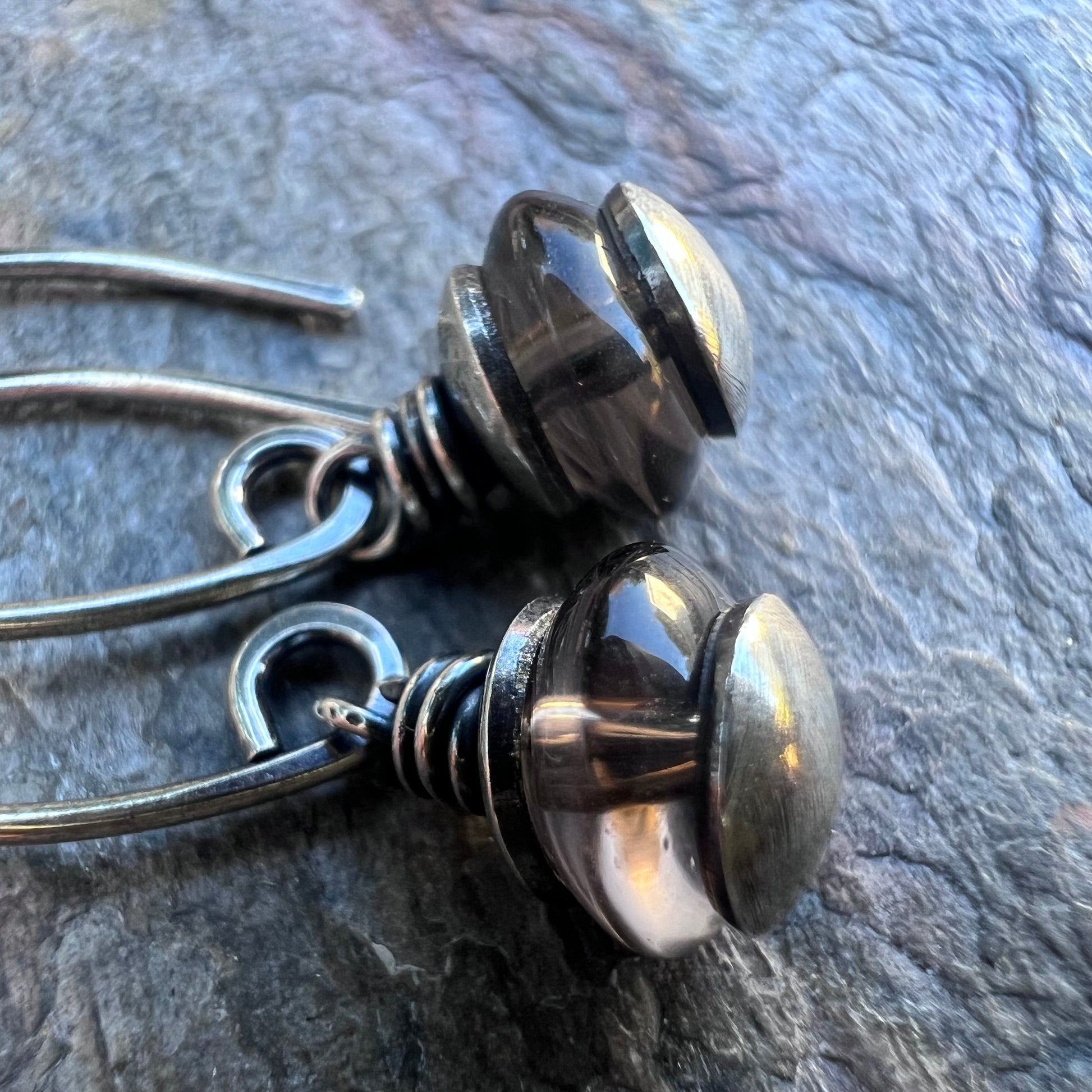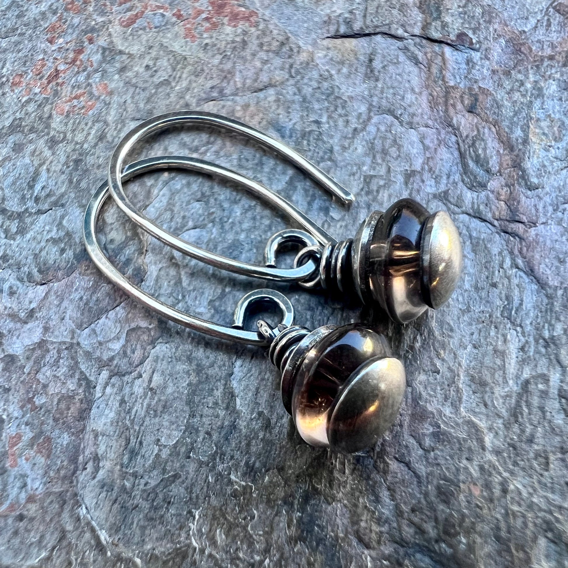 Two genuine smoky quartz gems have been framed in sterling silver. The earrings dangle from handmade sterling silver earwires. The silver has been oxidized and polished to create an aged patina finish.