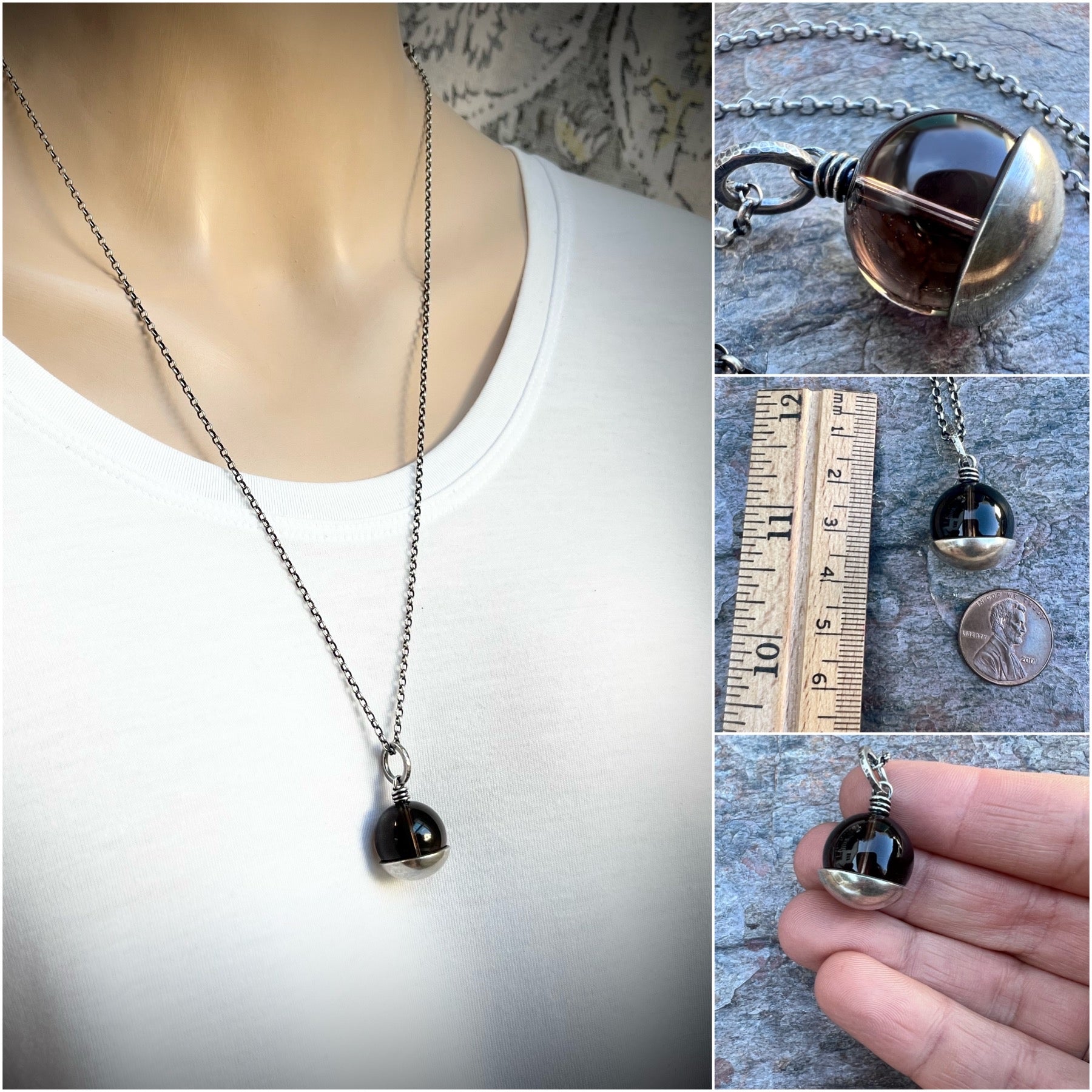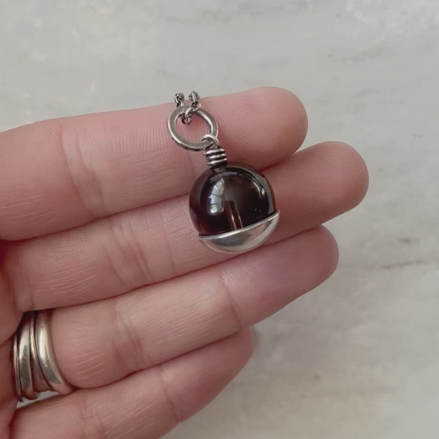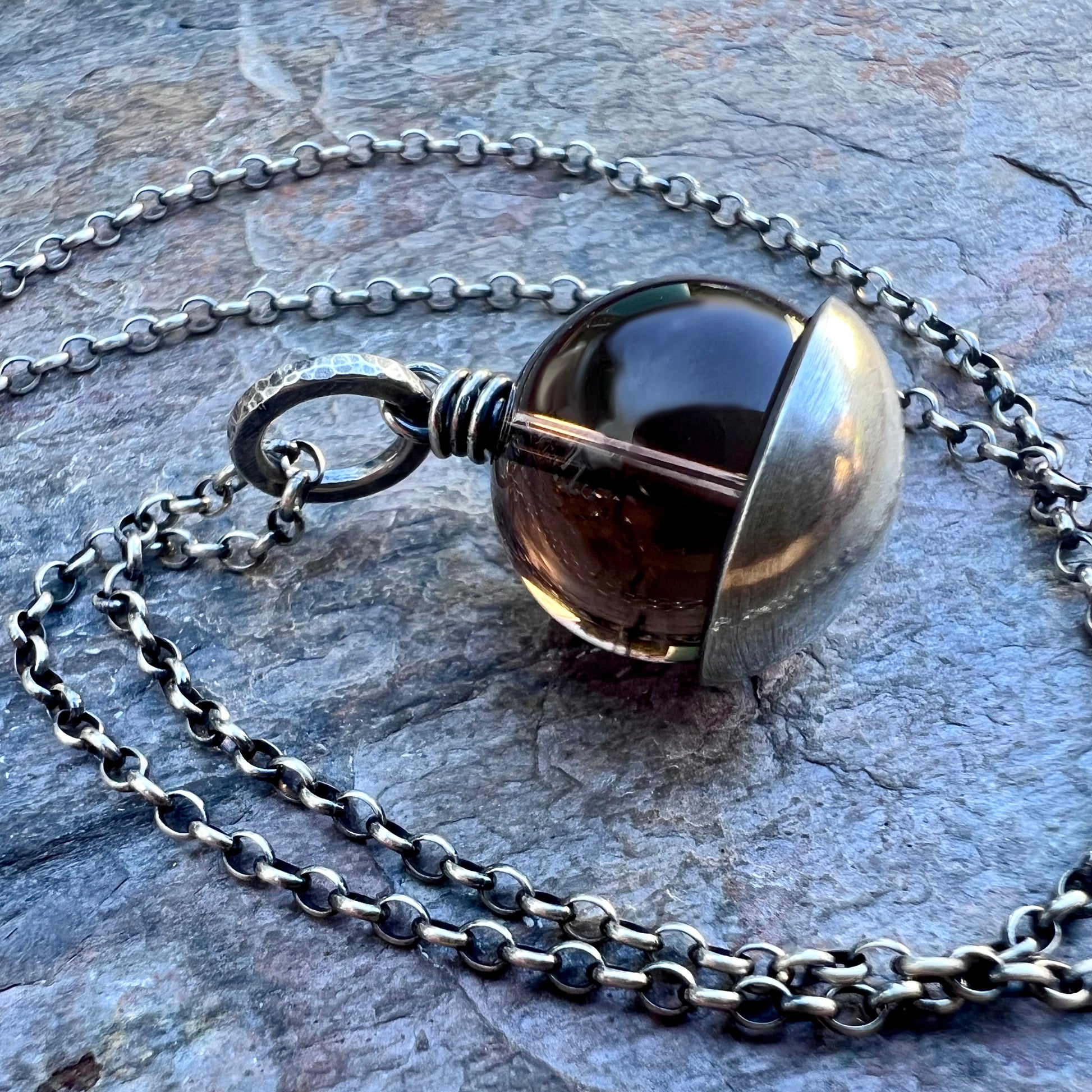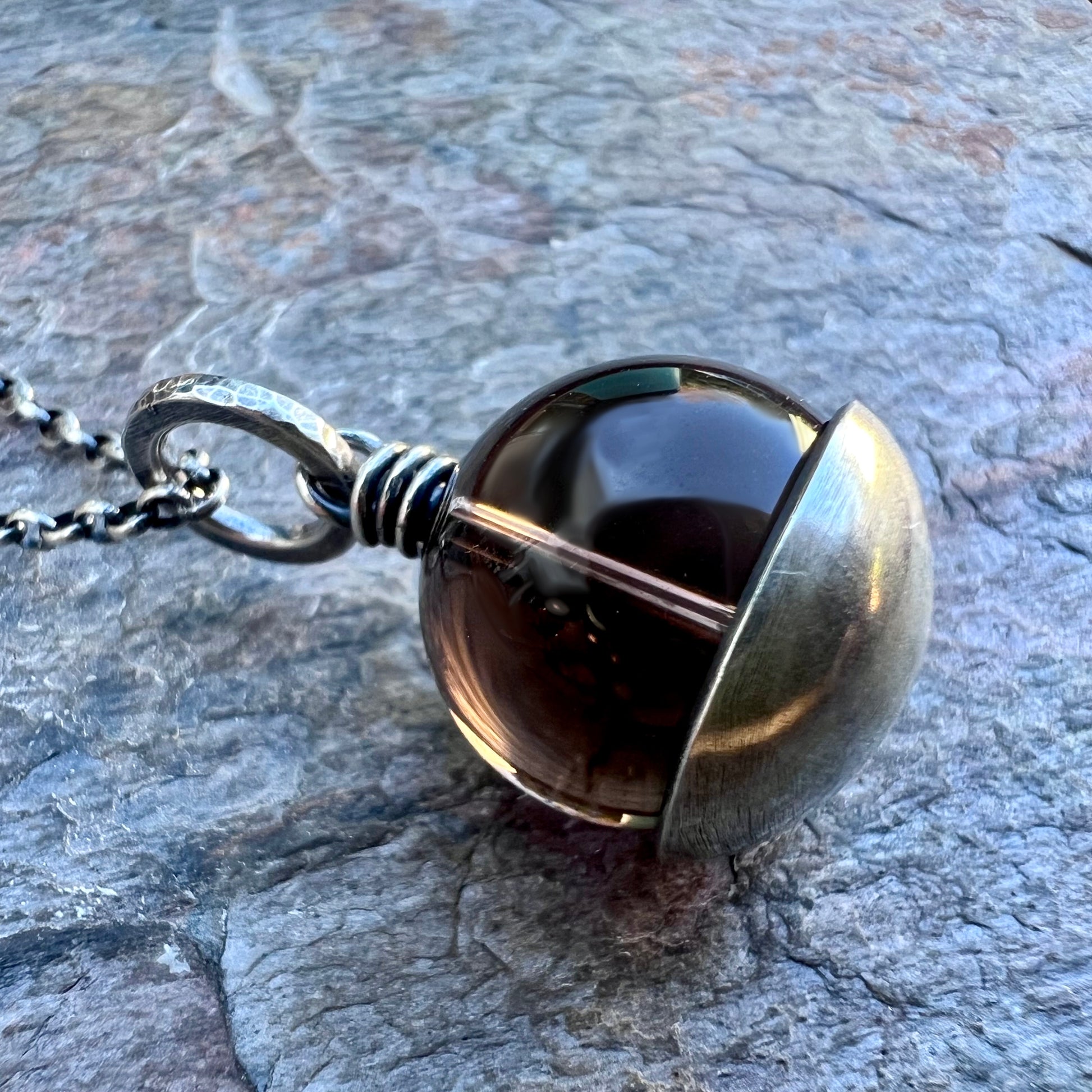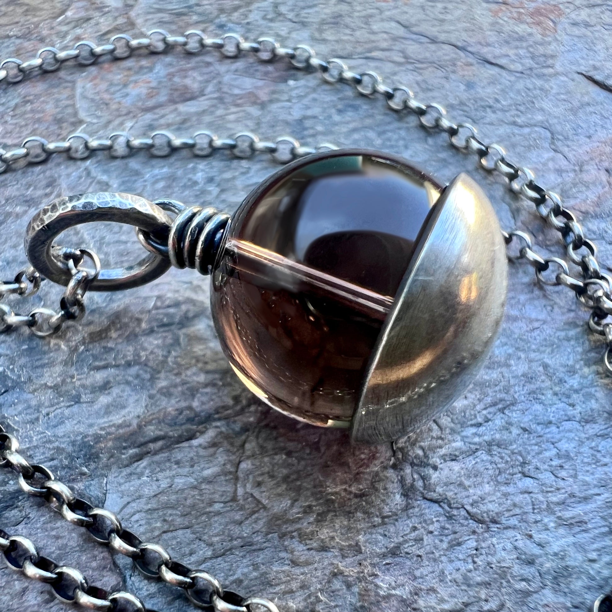 This pendant necklace is handmade from genuine smoky quartz and sterling silver. The natural stone is framed with a domed sterling silver circle. The design has been formed, soldered, and textured by hand. The silver has been oxidized and polished to create an antique patina finish.