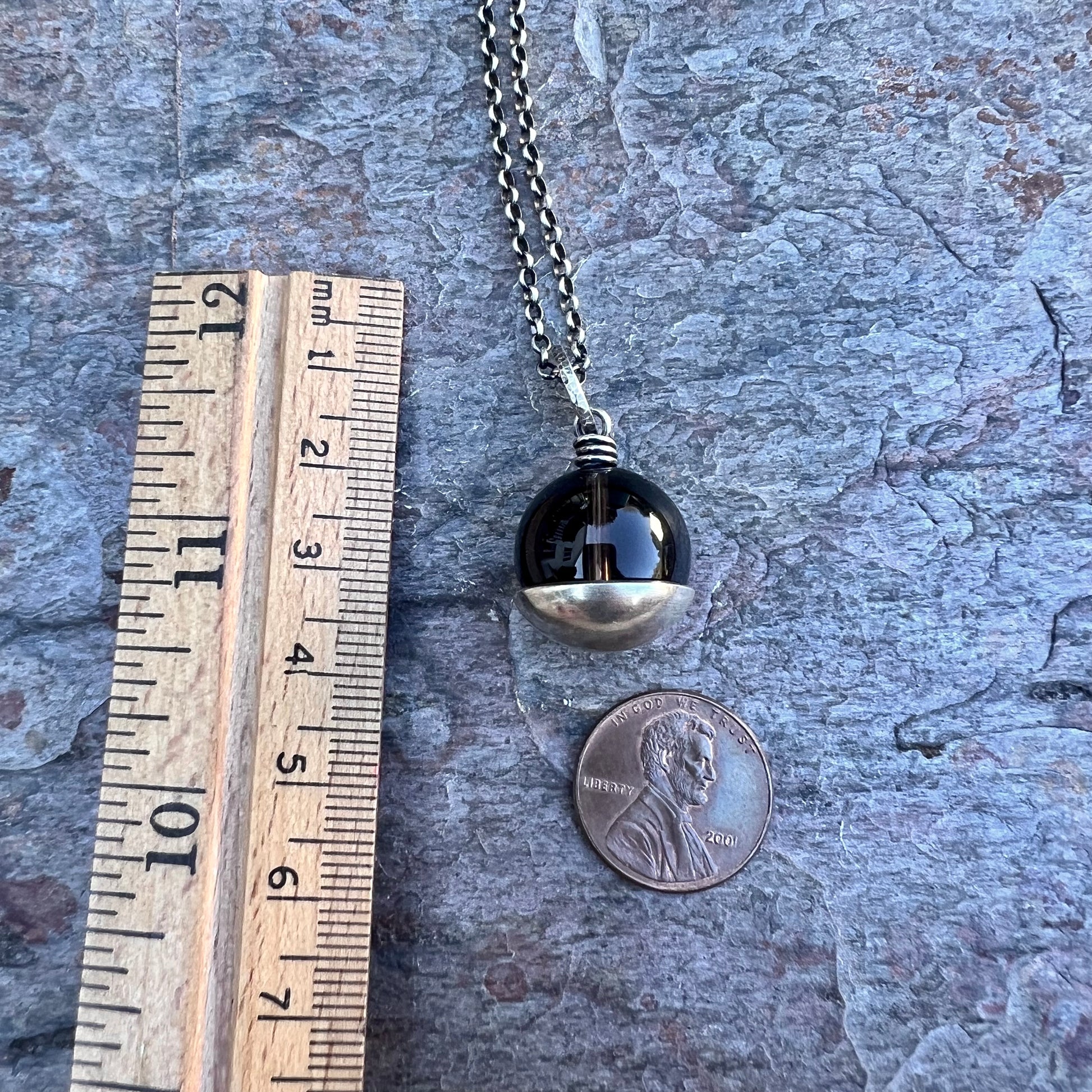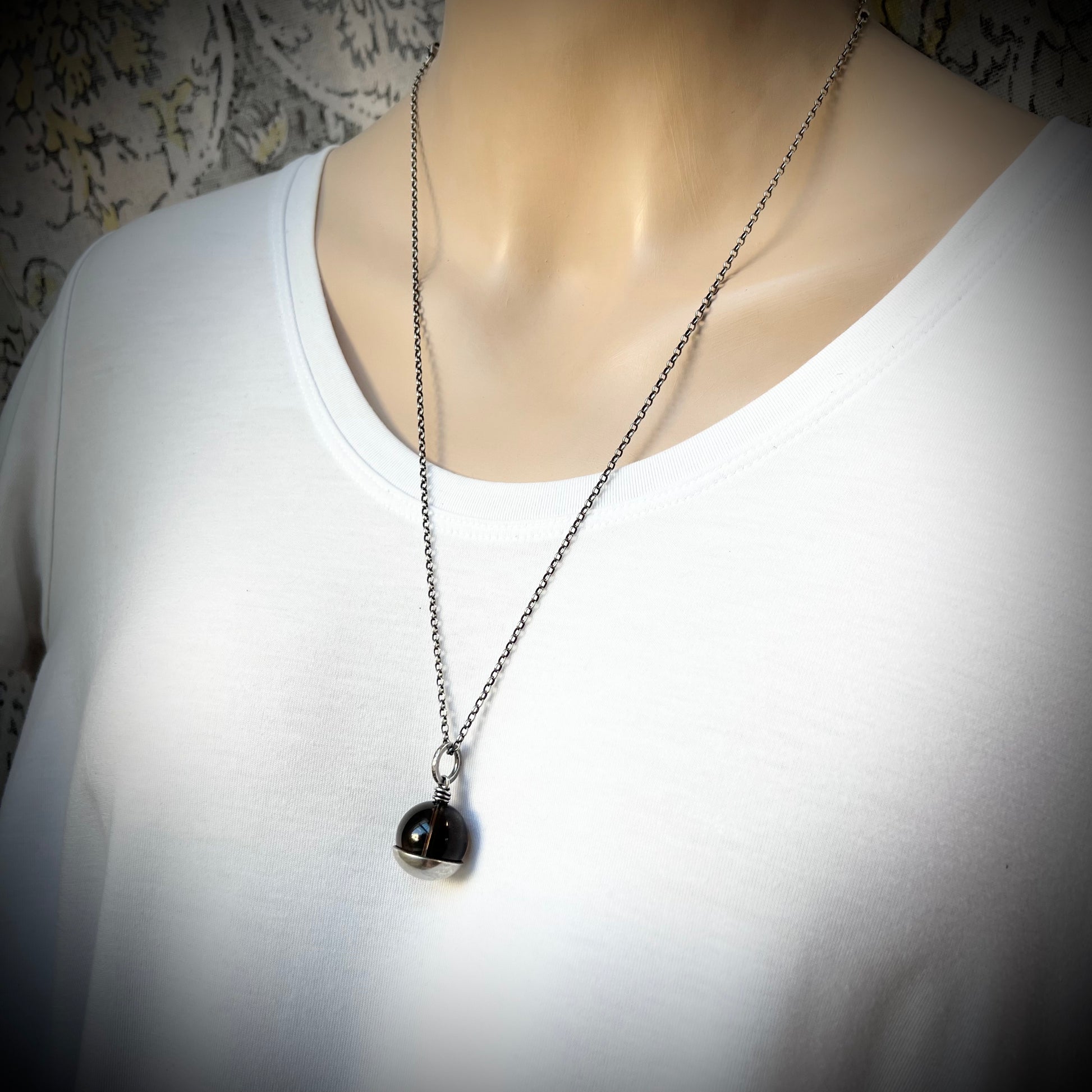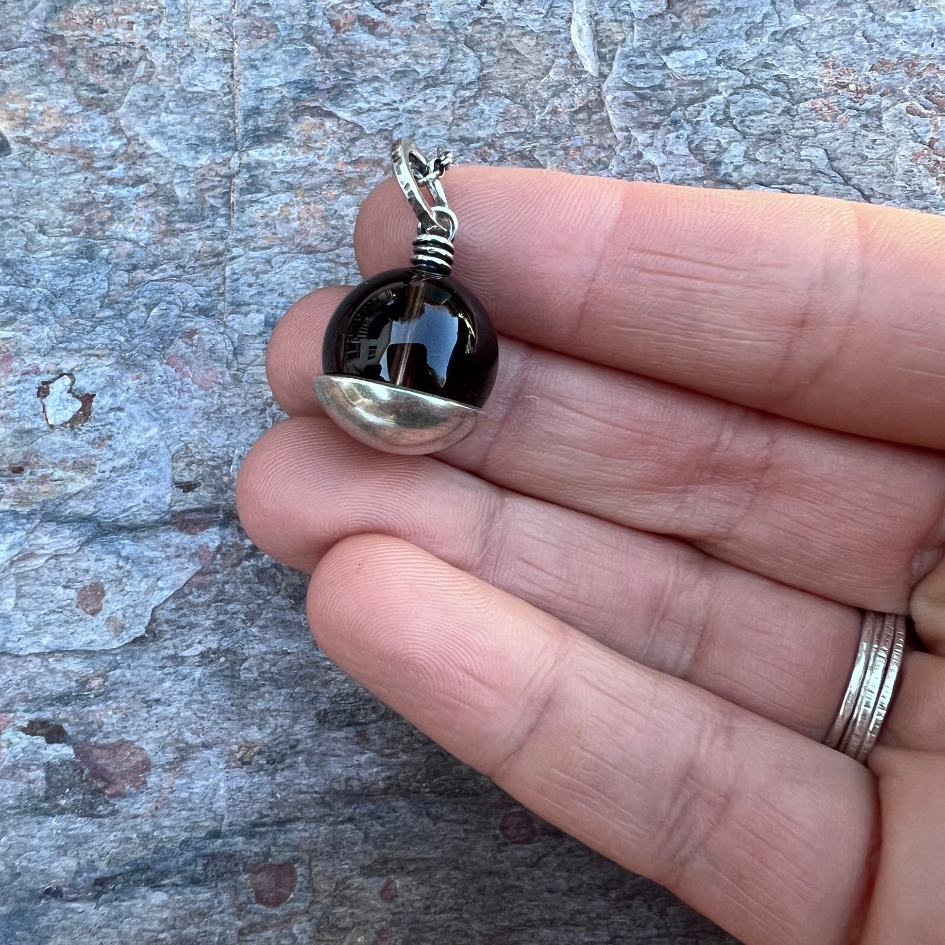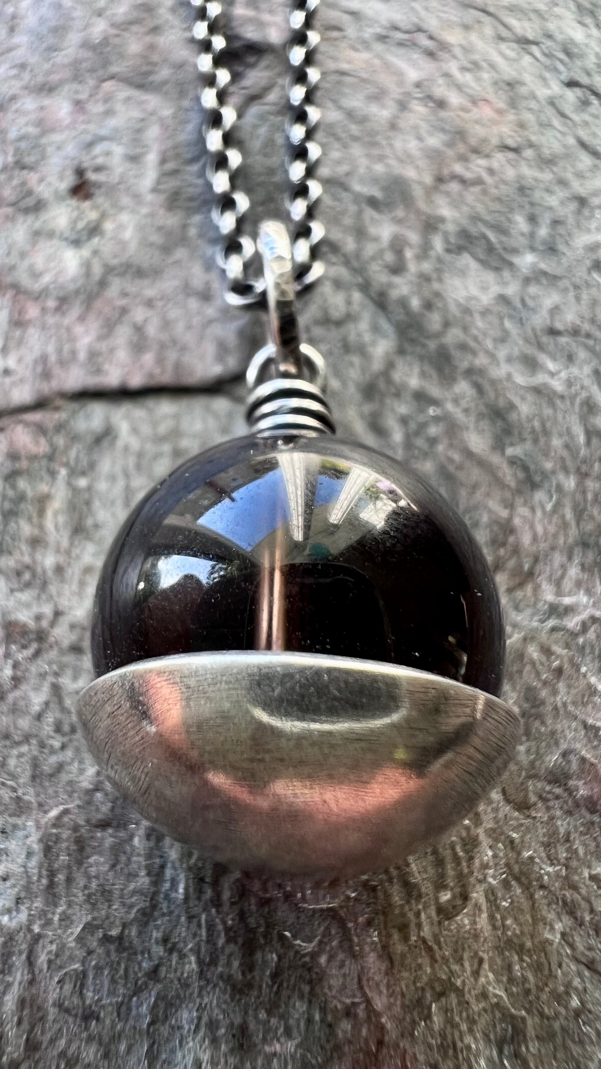 This pendant necklace is handmade from genuine smoky quartz and sterling silver. The natural stone is framed with a domed sterling silver circle. The design has been formed, soldered, and textured by hand. The silver has been oxidized and polished to create an antique patina finish.